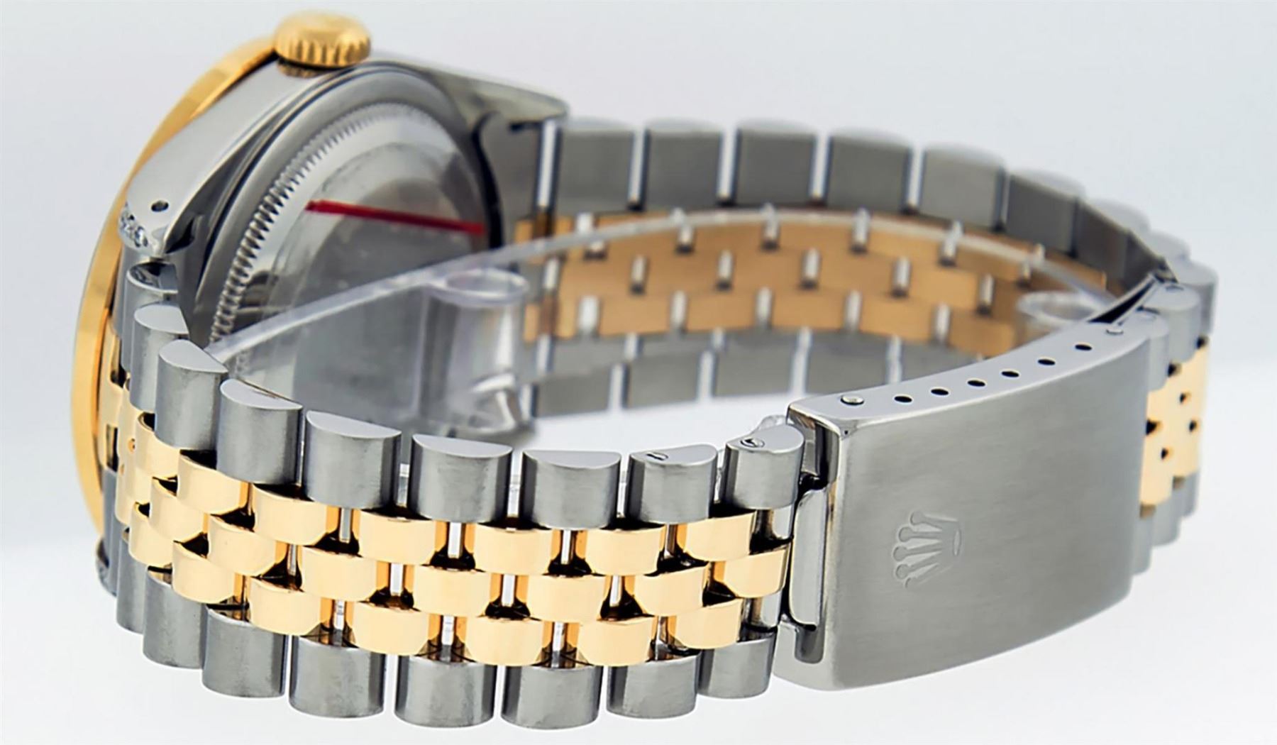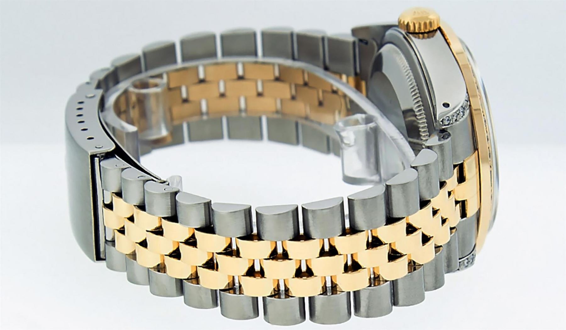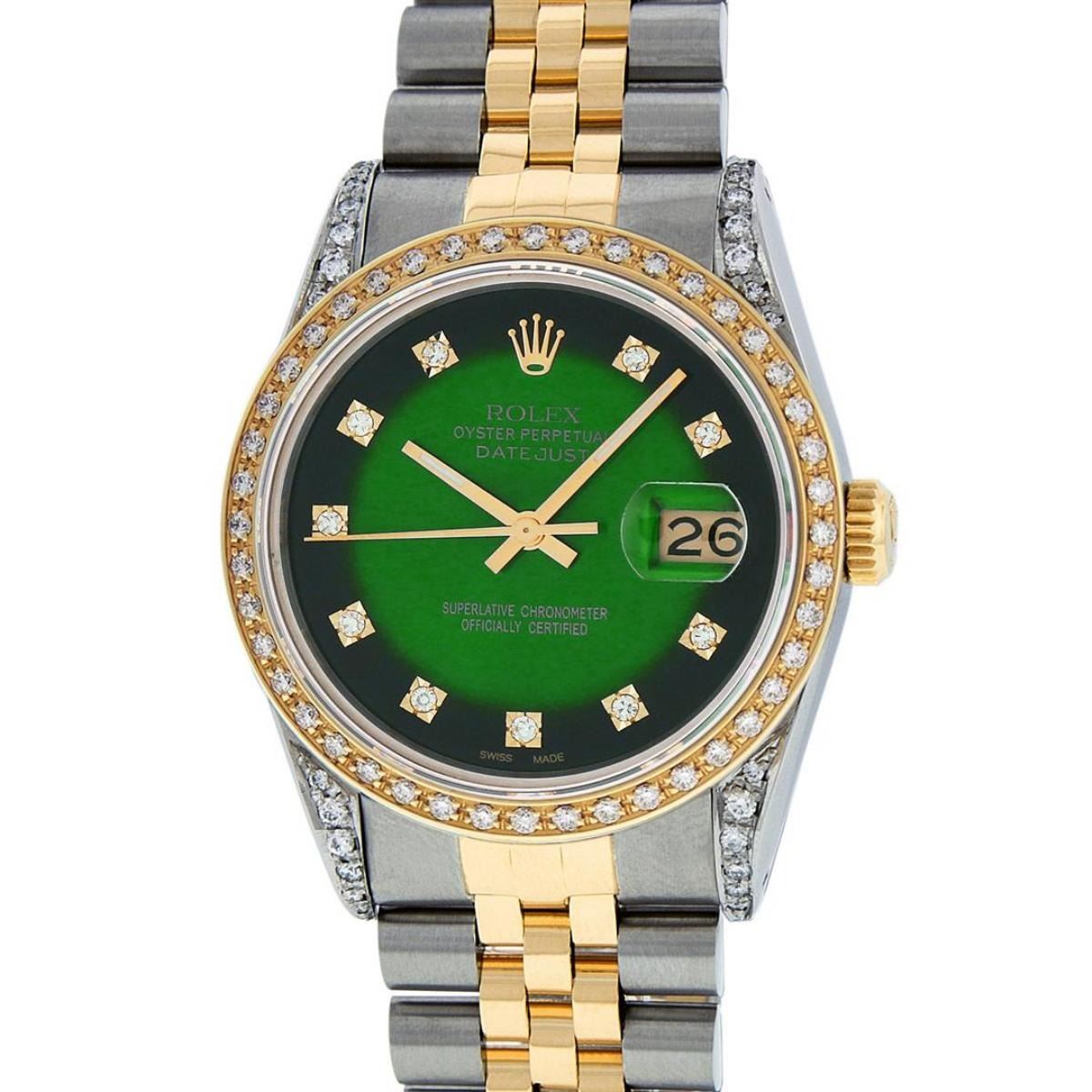 One Mens Yellow Gold Rolex Datejust Polished Bright with Satin Finish, Serviced & Electronically Tested, Stainless Steel Case: 36mm, Custom Diamond Lugs: 28 Diamonds On Lugs, Color: G to H, Clarity: SI-VS. Yellow Gold Crown, Custom Bezel: New 18K Yellow Gold Beadset Diamond Bezel, Diamond Count: 44 Diamonds, Total Weight 1.00 Carat, Clarity: SI-VS, Color: G to H. Custom Crystal: New Scratch Resistant Synthetic Sapphire Cyclops Lens. Custom Hands: New Luminecent Hands. Movement: Automatic Winding Movement . Custom Dial: Green Vignette Diamond Dial, Stone Count: 10 Diamonds On Dial, Color: G to H, Clarity: VS2. Date Window: 3 O'Clock Position Date Display, Quickset, Model: Datejust. Condition: G-6 Extra Fine. Bracelet: Yellow Gold And Stainless Steel Jubilee Band. Bright Polish & Satin Finish. 7.0 Inch Length, Adjustable. Standard Clasp, With Rolex Logo. This Watch Has Been Serviced And Polished It Is Free Of All Scratches And Dents.