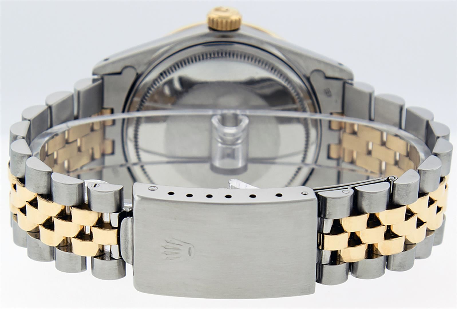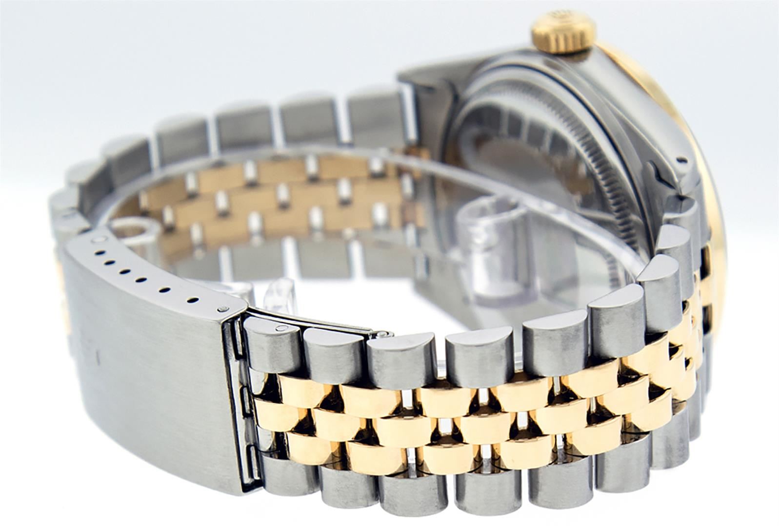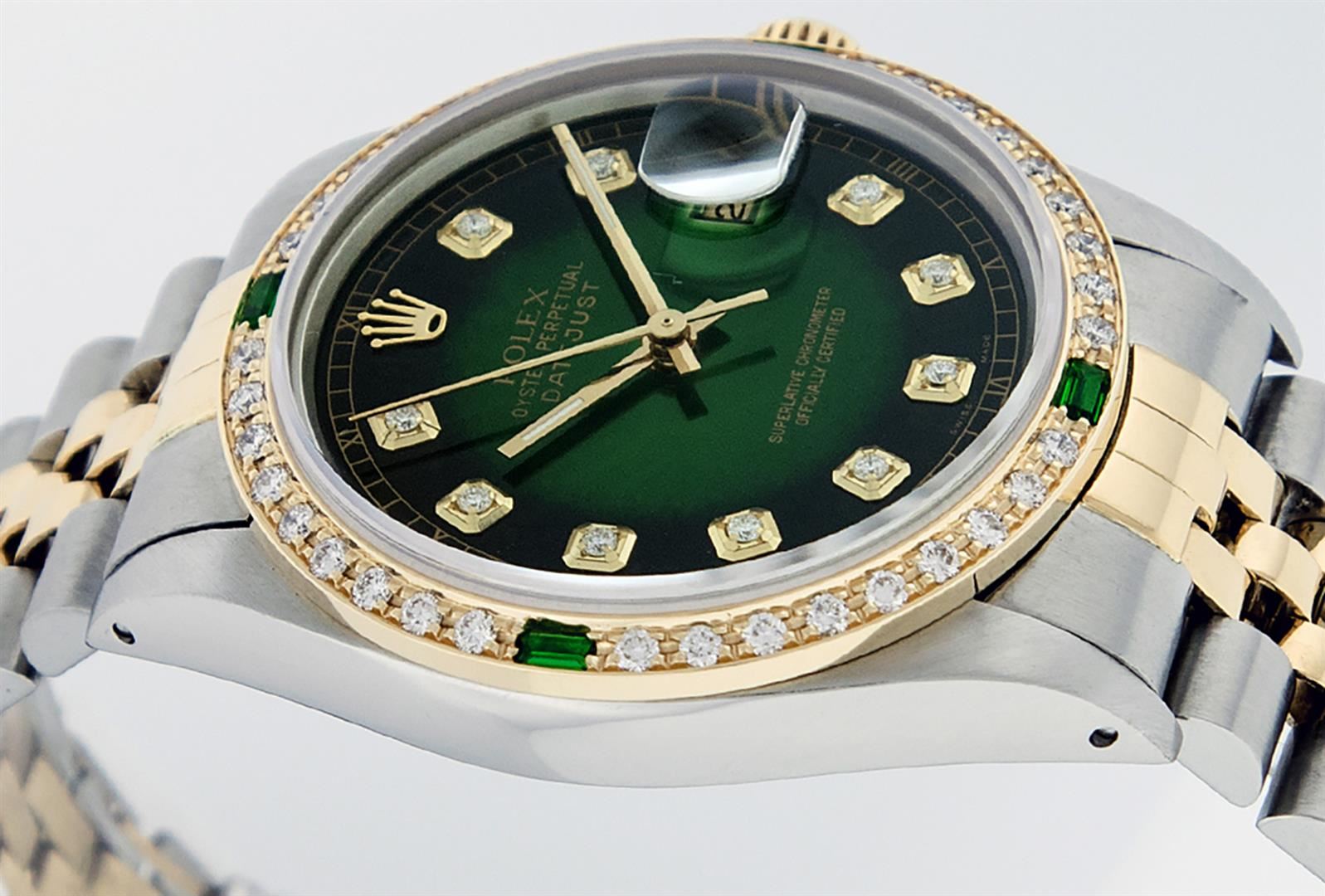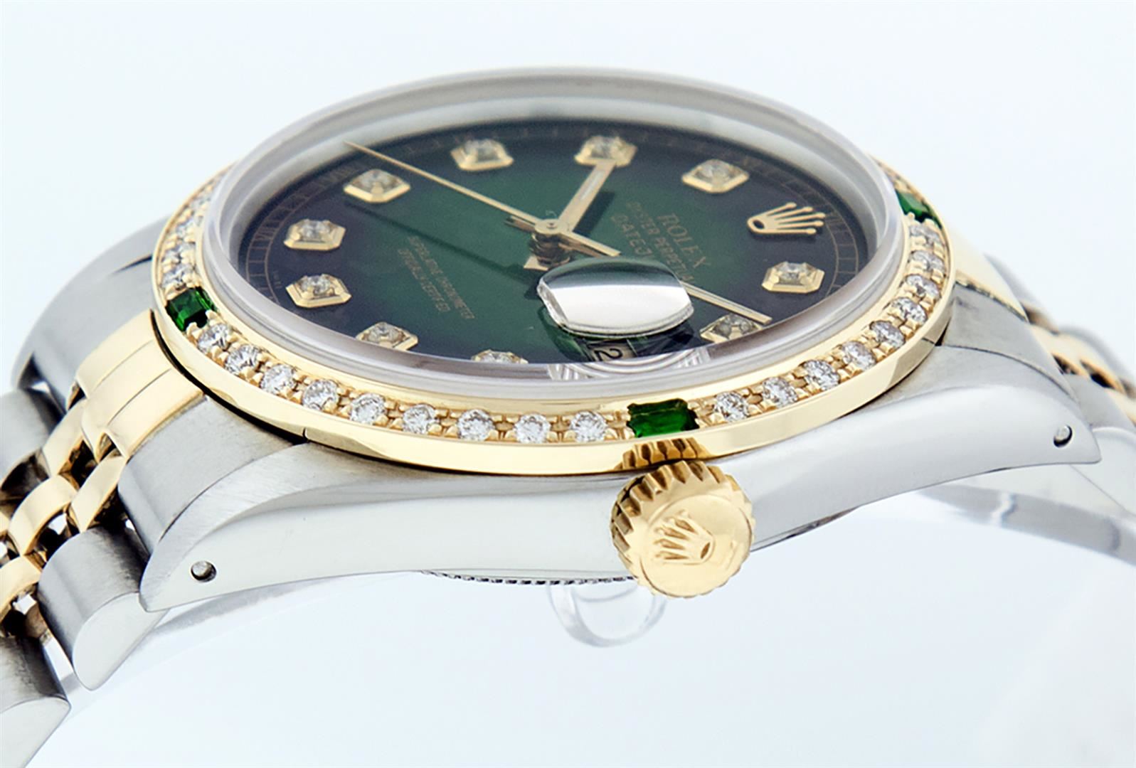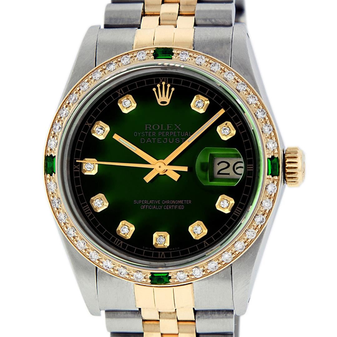 One Mens Yellow Gold Two Tone Rolex Datejust Polished, Serviced & Electronically Tested, Yellow Gold & Stainless Steel Case: 36mm, Yellow Gold Crown, Bezel: Yellow Gold Fluted Bezel. Custom Crystal: New Acrylic Cyclops Lens. Custom Hands: New Luminecent Hands. Movement: Automatic Winding Movement . Custom Dial: Green Vignette String Dial Set With VS Diamond Hour Markers, Diamond Count: 58 Diamonds in Dial, G To H In Color, SI-VS Clarity. Date Window: 3 O'Clock Position Date Display, Quickset, Model: Datejust, Condition: G-6 Extra Fine. Bracelet: Two Tone Yellow Gold & Stainless Steel Jubilee Band. Bright Polish. 7.0 Inch Length, Adjustable. Standard Clasp, With Rolex Logo. This Watch Has Been Serviced And Polished It Is Free Of All Scratches And Dents.