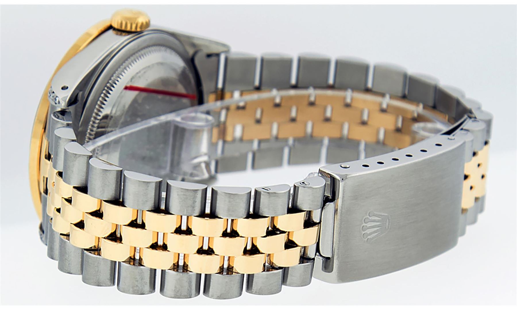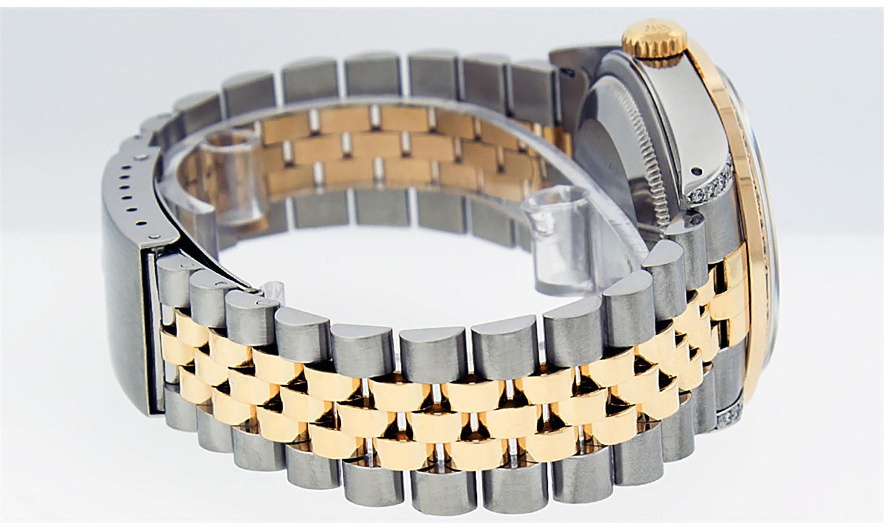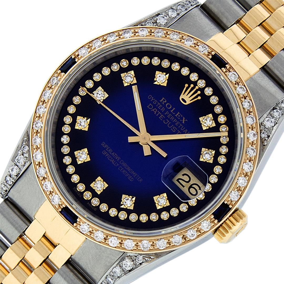 One Mens Yellow Gold Rolex Datejust Polished Bright with Satin Finish, Serviced & Electronically Tested, Stainless Steel Case: 36mm, Custom Diamond Lugs: 28 Diamonds On Lugs, Color: G to H, Clarity: SI-VS. Yellow Gold Crown, Custom Bezel: New 18K Yellow Gold Beadset Diamond + Sapphire Bezel, Diamond + Stone Count: 36Diamonds + 4 Sapphires, Total Weight 1.00 Carat, Clarity: SI-VS, Color: G to H. Custom Crystal: New Scratch Resistant Synthetic Sapphire Cyclops Lens. Custom Hands: New Luminecent Hands. Movement: Automatic Winding Movement . Custom Dial: Blue Vignette Single Cut String Diamond Dial, Stone Count: 58 Diamonds In Dial, Color: G to H, Clarity: VS2. Date Window: 3 O'Clock Position Date Display, Quickset, Model: Datejust. Condition: G-6 Extra Fine. Bracelet: Yellow Gold And Stainless Steel Jubilee Band. Bright Polish & Satin Finish. 7.0 Inch Length, Adjustable. Standard Clasp, With Rolex Logo. This Watch Has Been Serviced And Polished It Is Free Of All Scratches And Dents.