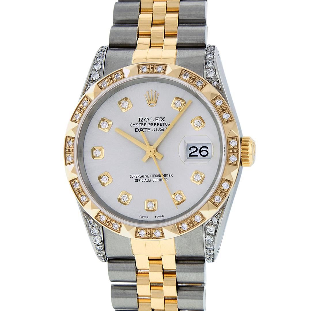 One Mens Yellow Gold Rolex Datejust Polished Bright with Satin Finish, Serviced & Electronically Tested, Stainless Steel Case: 36mm, Custom Diamond Lugs: 28 Diamonds In Lugs, Color: G to H, Clarity: SI-VS. Yellow Gold Crown, Custom Bezel: New 18K Yellow Gold Pyramid Diamond Bezel, Diamond Count: 24 Diamonds, Total Weight .75 Carat, Clarity: SI-VS, Color: G to H. Custom Crystal: New Scratch Resistant Synthetic Sapphire Cyclops Lens. Custom Hands: New Luminecent Hands. Movement: Automatic Winding Movement . Custom Dial: Silver Diamond Dial, Stone Count: 10 Diamonds In Dial, Color: G to H, Clarity: VS. Date Window: 3 O'Clock Position Date Display, Quickset, Model: Datejust. Condition: G-6 Extra Fine. Bracelet: Yellow Gold And Stainless Steel Jubilee Band. Bright Polish & Satin Finish. 7.0 Inch Length, Adjustable. Standard Clasp, With Rolex Logo. This Watch Has Been Serviced And Polished It Is Free Of All Scratches And Dents.