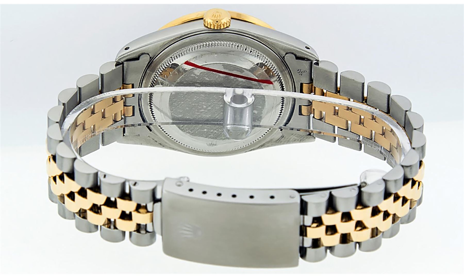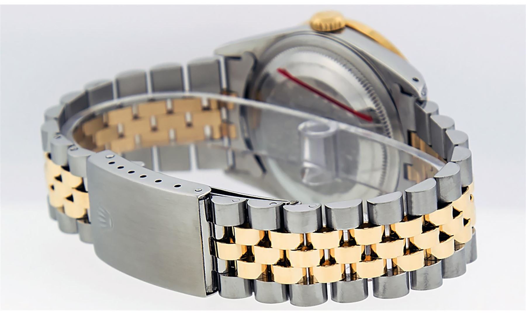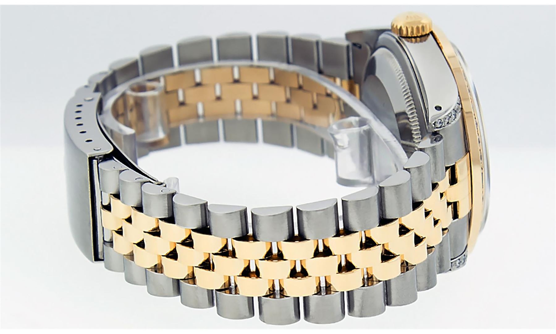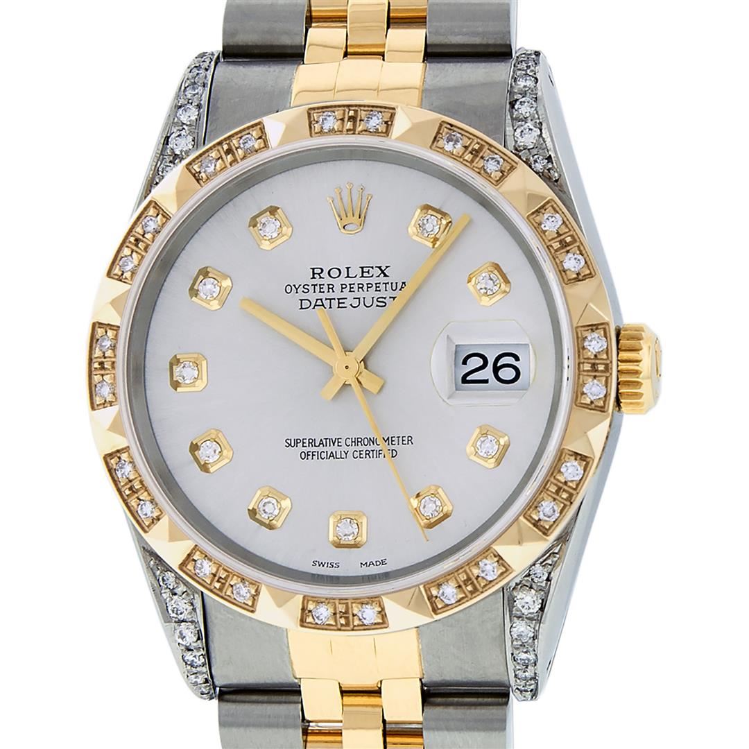 One Mens Yellow Gold Rolex Datejust Polished Bright with Satin Finish, Serviced & Electronically Tested, Stainless Steel Case: 36mm, Custom Diamond Lugs: 28 Diamonds In Lugs, Color: G to H, Clarity: SI-VS. Yellow Gold Crown, Custom Bezel: New 18K Yellow Gold Pyramid Diamond Bezel, Diamond Count: 24 Diamonds, Total Weight .75 Carat, Clarity: SI-VS, Color: G to H. Custom Crystal: New Scratch Resistant Synthetic Sapphire Cyclops Lens. Custom Hands: New Luminecent Hands. Movement: Automatic Winding Movement . Custom Dial: Silver Diamond Dial, Stone Count: 10 Diamonds In Dial, Color: G to H, Clarity: VS. Date Window: 3 O'Clock Position Date Display, Quickset, Model: Datejust. Condition: G-6 Extra Fine. Bracelet: Yellow Gold And Stainless Steel Jubilee Band. Bright Polish & Satin Finish. 7.0 Inch Length, Adjustable. Standard Clasp, With Rolex Logo. This Watch Has Been Serviced And Polished It Is Free Of All Scratches And Dents.