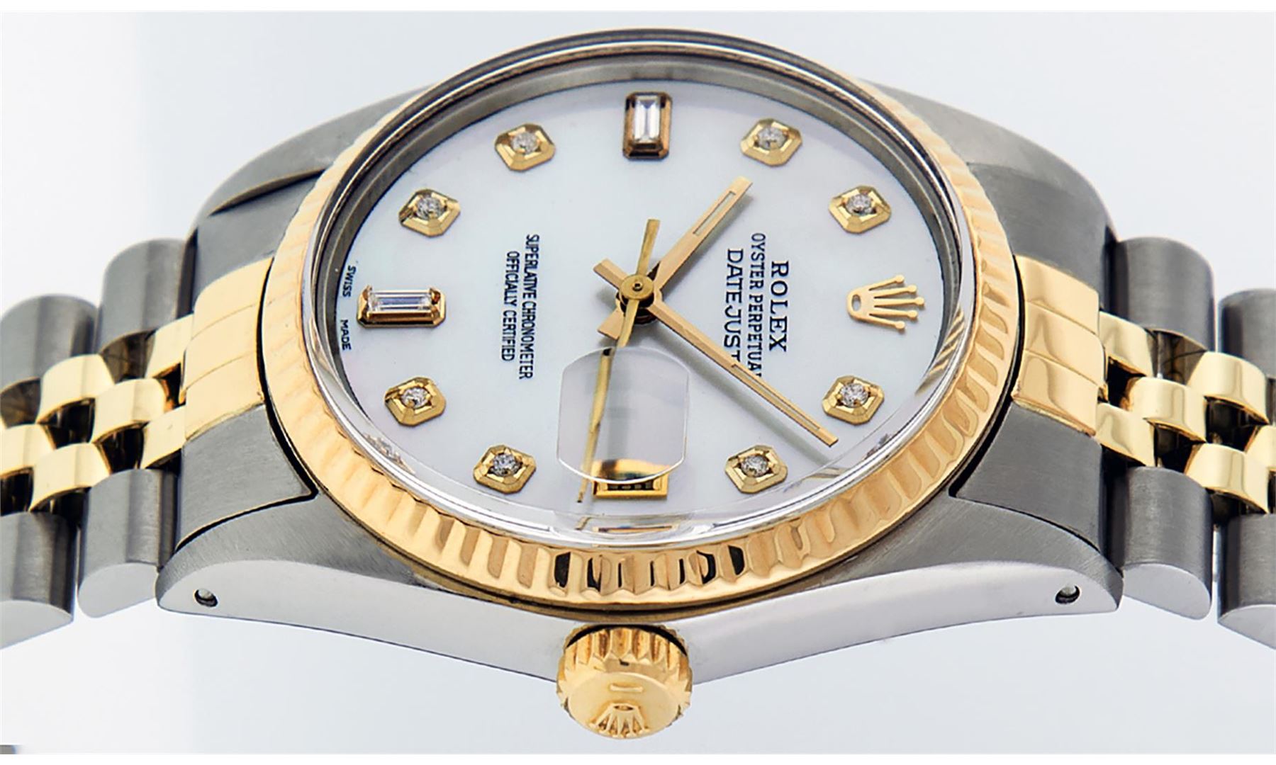 One Mens Yellow Gold Two Tone Rolex Datejust Polished, Serviced & Electronically Tested, Yellow Gold & Stainless Steel Case: 36mm, Yellow Gold Crown, Bezel: Yellow Gold Fluted Bezel. Custom Crystal: New Acrylic Cyclops Lens. Custom Hands: New Luminecent Hands. Movement: Automatic Winding Movement. Custom Dial: Mother Of Pearl Diamond Dial, Stone Count: 8 Diamonds + 2 Diamond Baguettes in Dial, G To H In Color, SI-VS Clarity. Date Window: 3 O'Clock Position Date Display, Quickset, Model: Datejust. Condition: G-6 Extra Fine. Bracelet: Two Tone Yellow Gold & Stainless Steel Jubilee. Bright Polish. 7.0 Inch Length, Adjustable. Standard Clasp, With Rolex Logo. This Watch Has Been Serviced And Polished It Is Free Of All Scratches And Dents.