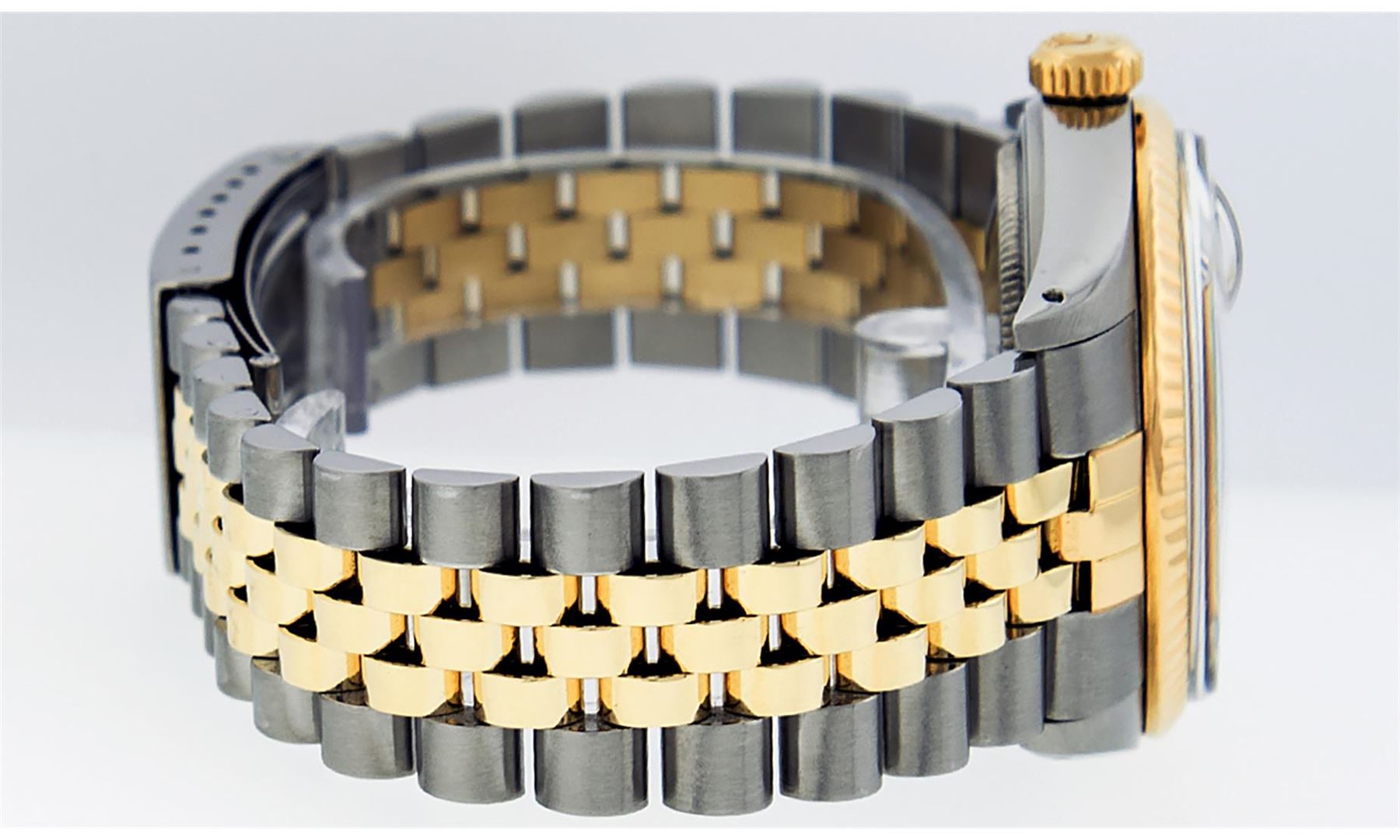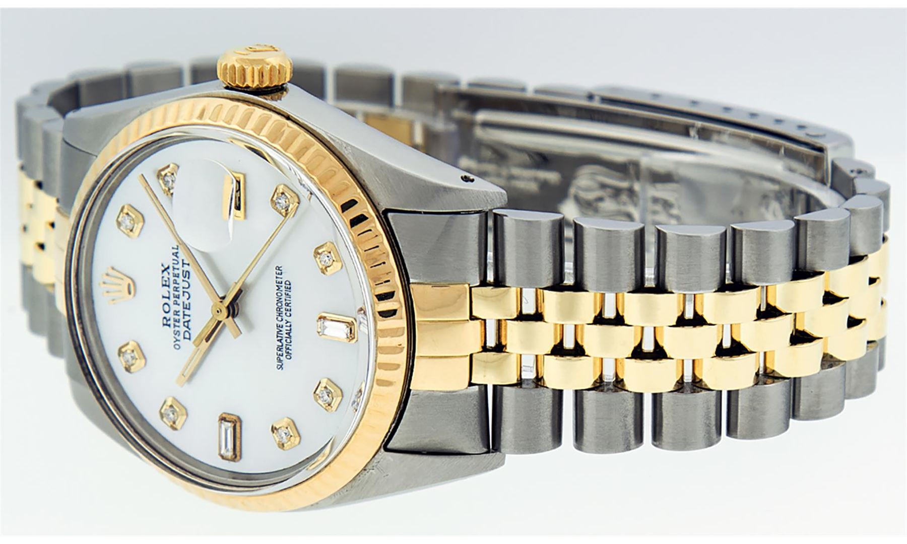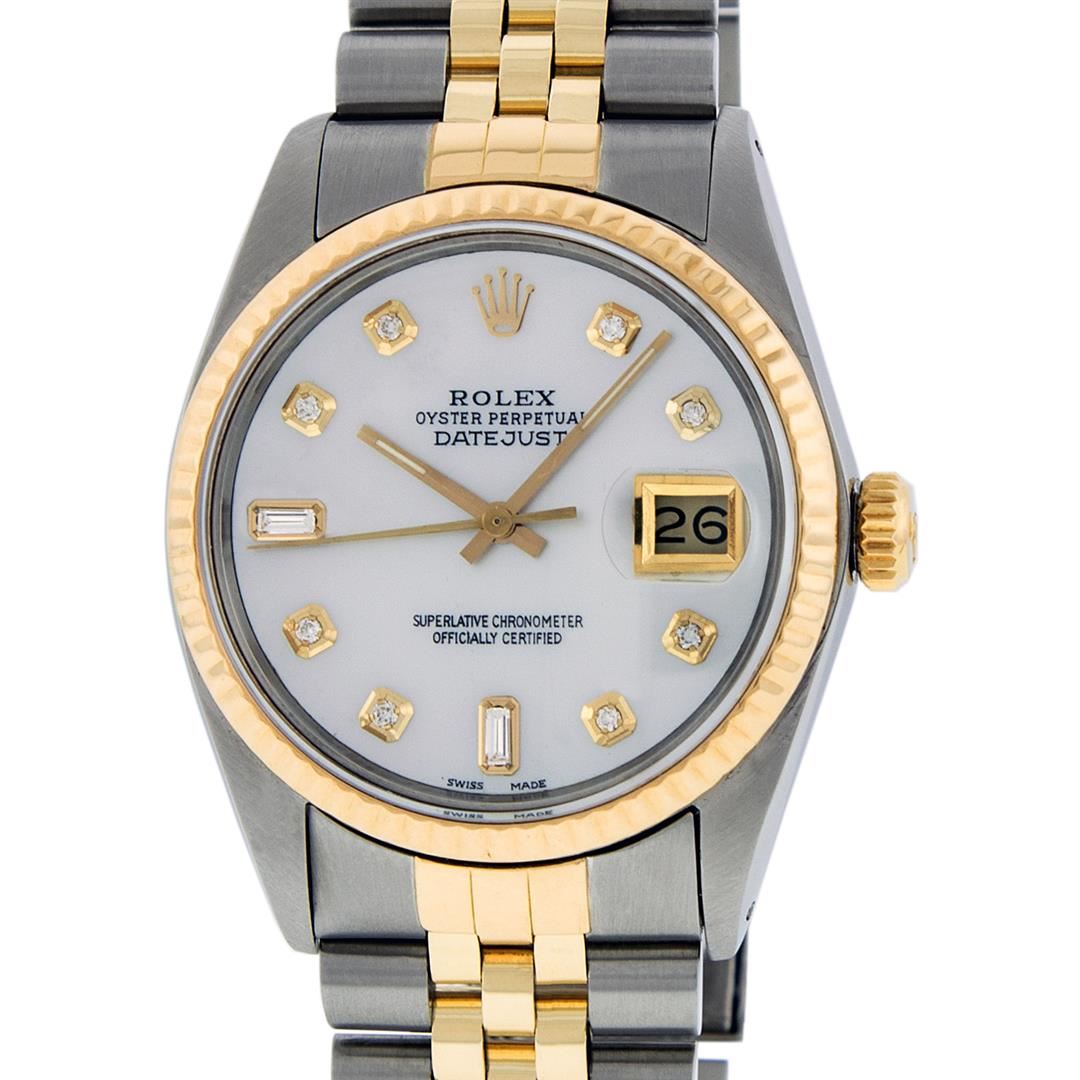 One Mens Yellow Gold Two Tone Rolex Datejust Polished, Serviced & Electronically Tested, Yellow Gold & Stainless Steel Case: 36mm, Yellow Gold Crown, Bezel: Yellow Gold Fluted Bezel. Custom Crystal: New Acrylic Cyclops Lens. Custom Hands: New Luminecent Hands. Movement: Automatic Winding Movement. Custom Dial: Mother Of Pearl Diamond Dial, Stone Count: 8 Diamonds + 2 Diamond Baguettes in Dial, G To H In Color, SI-VS Clarity. Date Window: 3 O'Clock Position Date Display, Quickset, Model: Datejust. Condition: G-6 Extra Fine. Bracelet: Two Tone Yellow Gold & Stainless Steel Jubilee. Bright Polish. 7.0 Inch Length, Adjustable. Standard Clasp, With Rolex Logo. This Watch Has Been Serviced And Polished It Is Free Of All Scratches And Dents.