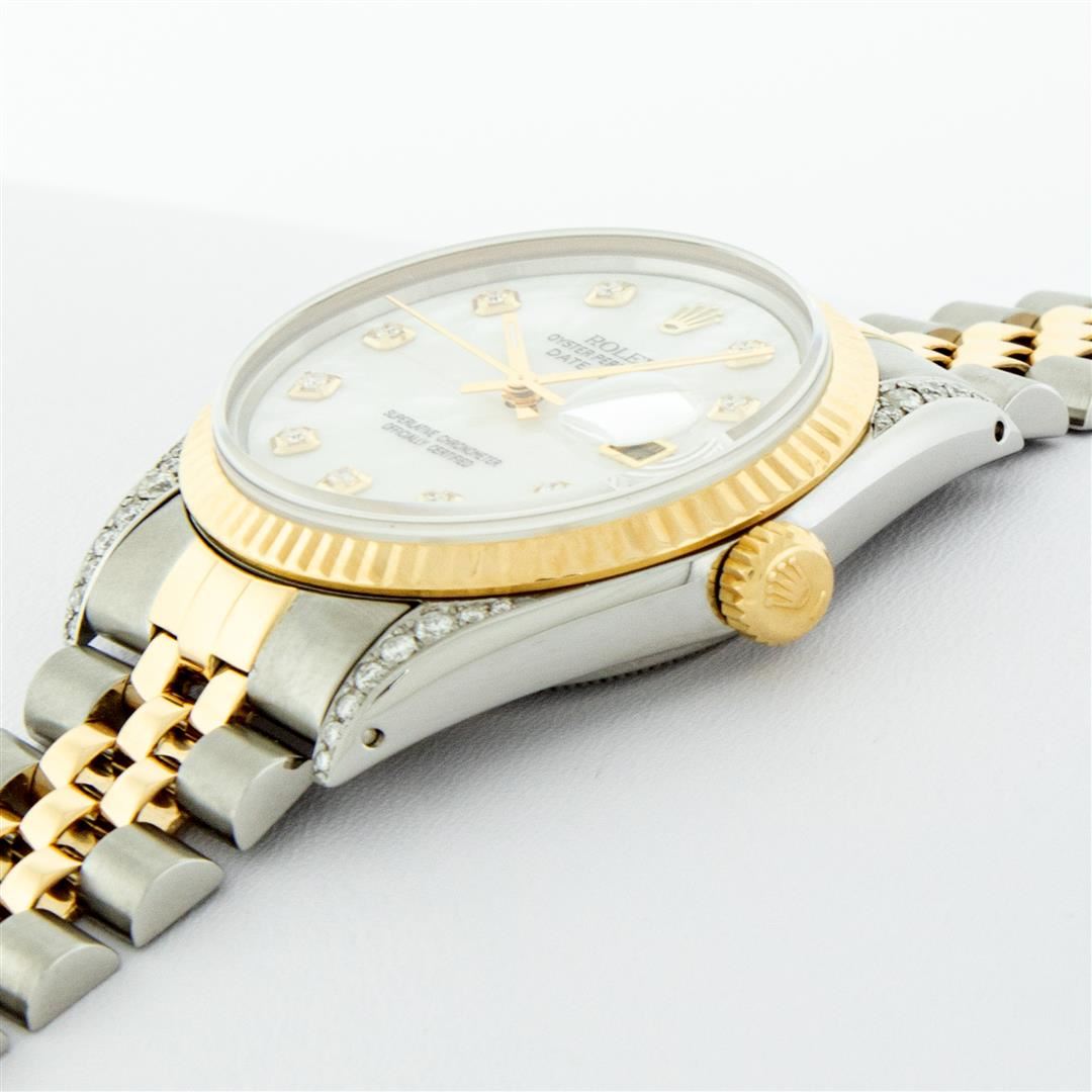 One Mens Yellow Gold & Stainless Steel Datejust Polished Bright with Satin Finish, Serviced & Electronically Tested, Stainless Steel Case: 36mm, Custom Diamond Lugs: 28 Diamonds On Lugs, Color: G to H, Clarity: SI-VS. Yellow Gold Crown, Bezel: Yellow Gold Fluted Bezel. Custom Crystal: New Scratch Resistant Acrylic Cyclops Lens. Custom Hands: New Luminecent Hands. Movement: Automatic Winding Movement. Custom Dial: Mother Of Pearl Diamond Dial, Stone Count: 10 Diamonds On Dial, Color: G to H, Clarity: VS2. Date Window: 3 O'Clock Position Date Display, Quickset, Model: Datejust. Condition: G-6 Extra Fine. Bracelet: Yellow Gold And Stainless Steel Jubilee Band. Bright Polish & Satin Finish. 7.0 Inch Length, Adjustable. Standard Clasp, With Rolex Logo. This Watch Has Been Serviced And Polished It Is Free Of All Scratches And Dents.