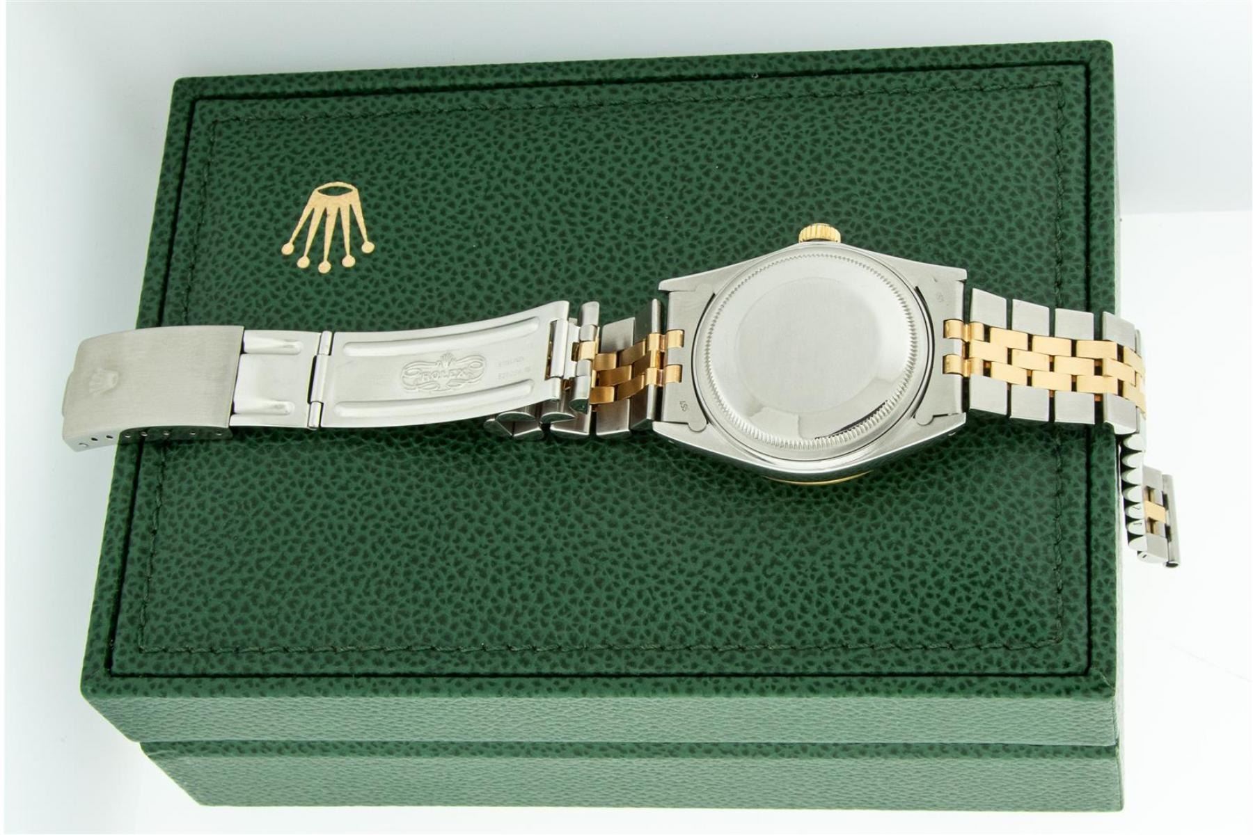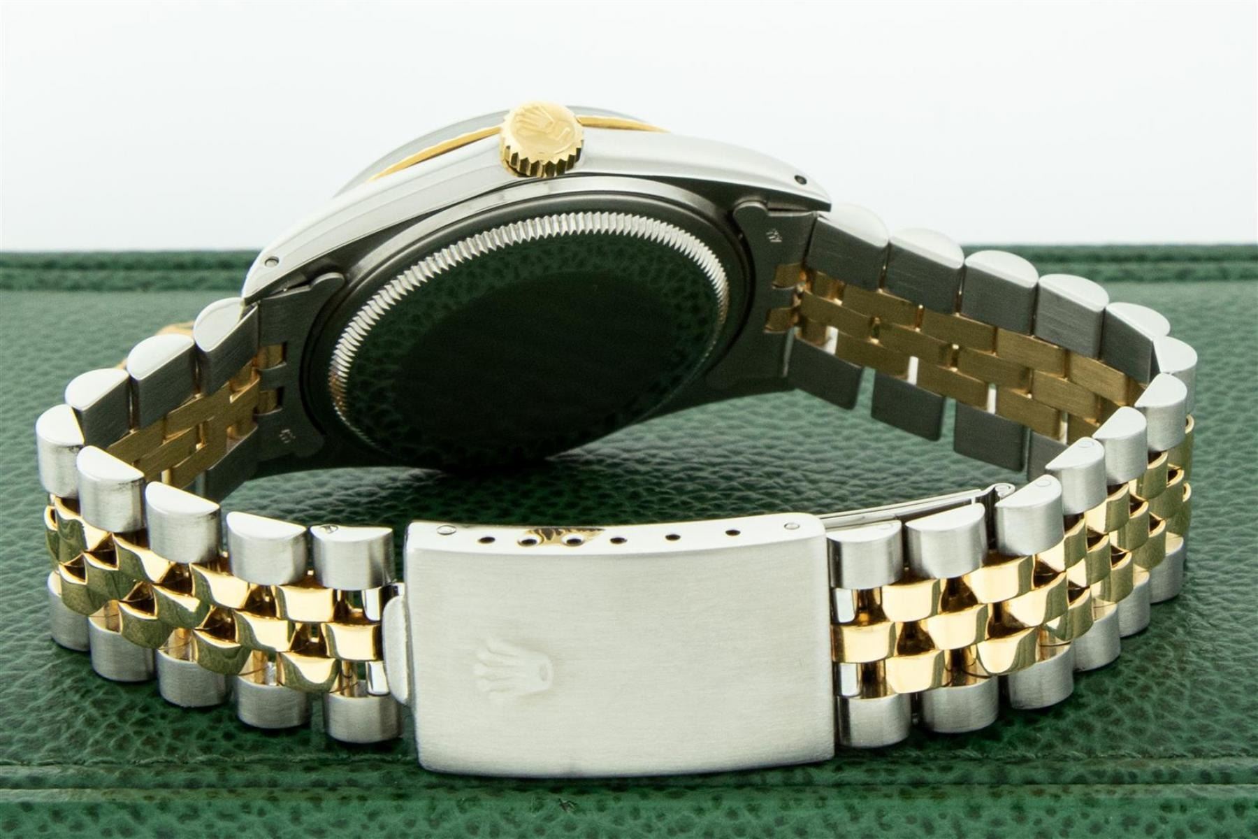 One Mens Yellow Gold Rolex Datejust Polished Bright with Satin Finish, Serviced & Electronically Tested, Stainless Steel Case: 36mm, Custom Diamond Lugs: 28 Diamonds On Lugs, Color: G to H, Clarity: SI-VS. Yellow Gold Crown, Bezel: Yellow Gold Fluted Bezel. Custom Crystal: New Scratch Resistant Acrylic Cyclops Lens. Custom Hands: New Luminecent Hands. Movement: Automatic Winding Movement . Custom Dial: Mother Of Pearl Diamond Dial, Stone Count: 10 Diamonds On Dial, Color: G to H, Clarity: VS2. Date Window: 3 O'Clock Position Date Display, Quickset, Model: Datejust. Condition: G-6 Extra Fine. Bracelet: Yellow Gold And Stainless Steel Jubilee Band. Bright Polish & Satin Finish. 7.0 Inch Length, Adjustable. Standard Clasp, With Rolex Logo. This Watch Has Been Serviced And Polished It Is Free Of All Scratches And Dents.