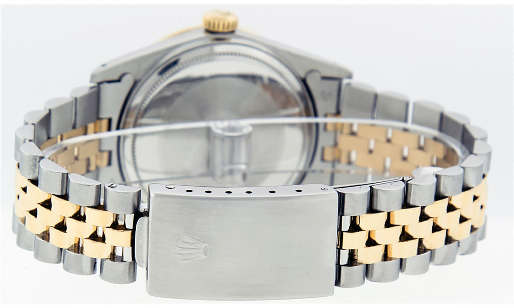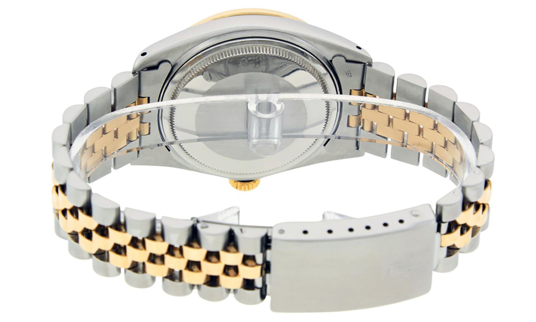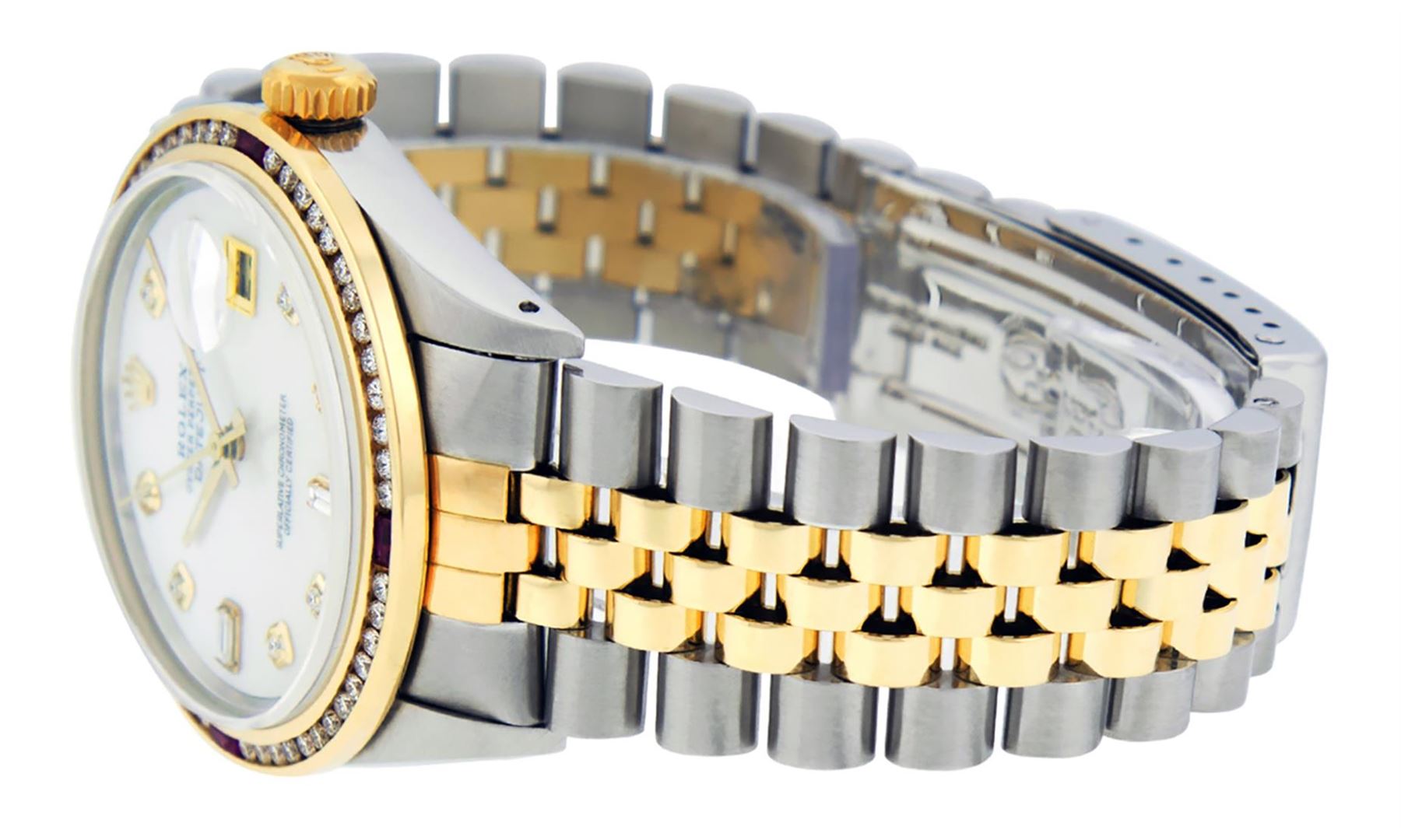 One Mens Yellow Gold Two Tone Rolex Datejust Polished, Serviced & Electronically Tested, Yellow Gold & Stainless Steel Case: 36mm, Yellow Gold Crown, Custom Bezel: 18K Yellow Gold Ruby Channel Set Diamond Bezel, Diamond Count: 52 Diamonds + 4 Rubies, Total Weight 1.30 Carat, Clarity: SI-VS, Color: G to H. Custom Crystal: New Scratch Resistant Synthetic Sapphire Cyclops Lens. Custom Hands: New Luminecent Hands. Movement: Automatic Winding Movement. Custom Dial: Mother Of Pearl Diamond Dial, Stone Count: 8 Diamonds + 2 Baguette Diamonds In Dial. Date Window: 3 O'Clock Position Date Display, Quickset, Model: Condition: G-6 Extra Fine. Bracelet: Two Tone Yellow Gold & Stainless Steel Jubilee. Bright Polish. 7.0 Inch Length, Adjustable. Standard Clasp, With Rolex Logo. This Watch Has Been Serviced Time Tested And Is In Excellent Condition It Is Free Of All Scratches And Dents.
