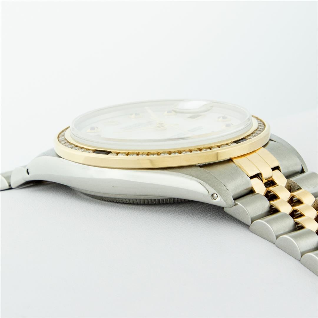 One Mens Yellow Gold Two Tone Rolex Datejust Polished, Serviced & Electronically Tested, Yellow Gold & Stainless Steel Case: 36mm, Yellow Gold Crown, Custom Bezel: 18K Yellow Gold Sapphire Channel Set Diamond Bezel, Diamond Count: 52 Diamonds + 4 Sapphires, Total Weight 1.30 Carat, Clarity: SI-VS, Color: G to H. Custom Crystal: New Synthetic Sapphire Cyclops Lens. Custom Hands: New Hands. Movement: Automatic Winding Movement . Custom Dial: Mother Of Pearl Dial With Sapphire Hour Markers, Stone Count: 10 Sapphires in Dial. Date Window: 3 O'Clock Position Date Display, Quickset, Model: Condition: G-6 Extra Fine. Bracelet: Two Tone Yellow Gold & Stainless Steel Jubilee. Bright Polish. 7.0 Inch Length, Adjustable. Standard Clasp, With Rolex Logo. This Watch Has Been Serviced Time Tested And Is In Excellent Condition It Is Free Of All Scratches And Dents.