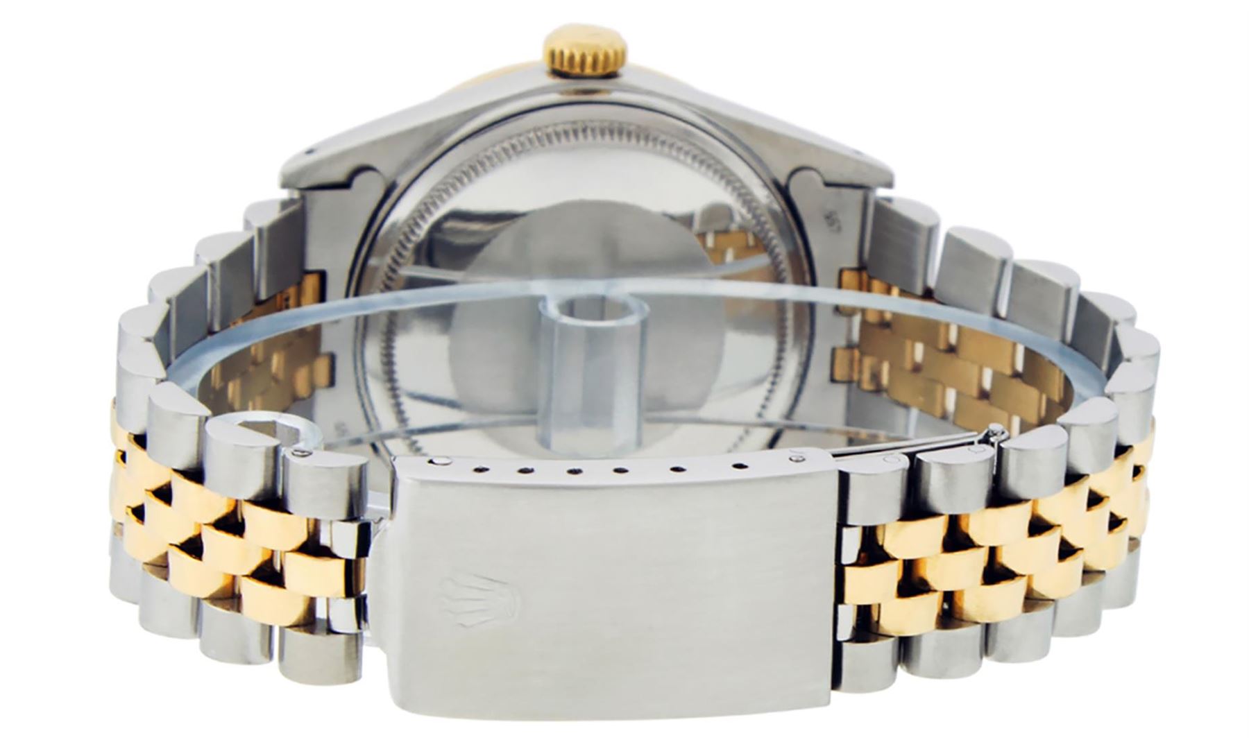 One Mens Yellow Gold Two Tone Rolex Datejust Polished, Serviced & Electronically Tested, 18K Yellow Gold & Stainless Steel Case: 36mm, 18K Yellow Gold Crown, Custom Bezel: New 18K White Gold Beadset Diamond Bezel, Diamond Count: 44 Diamonds, Total Weight 1.00 Carat, Clarity: SI-VS, Color: G to H. Crystal: New Synthetic Sapphire Cyclops Lens. Custom Hands: New Luminecent Hands. Movement: Automatic Winding Movement . Custom Dial: Maroon Diamond, Diamond Count: 10 Diamonds in Dial G To H In Color, Clarity: VS, Date Window: 3 O'Clock Position Date Display, Quickset, Model: Condition: G-6 Extra Fine. Bracelet: Two Tone Yellow Gold & Stainless Steel Jubilee. Bright Polish. 7.0 Inch Length, Adjustable. Standard Clasp, With Rolex Logo. This Watch Has Been Serviced Time Tested And Is In Excellent Condition It Is Free Of All Scratches And Dents.