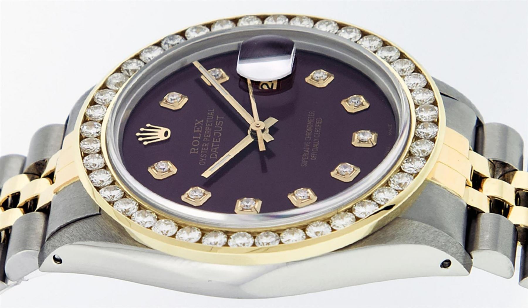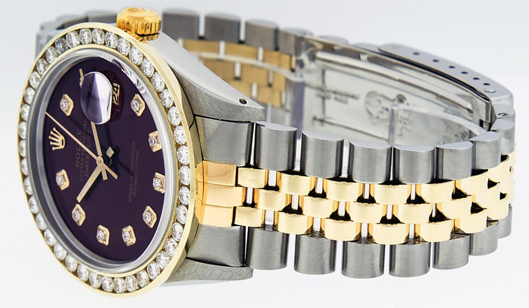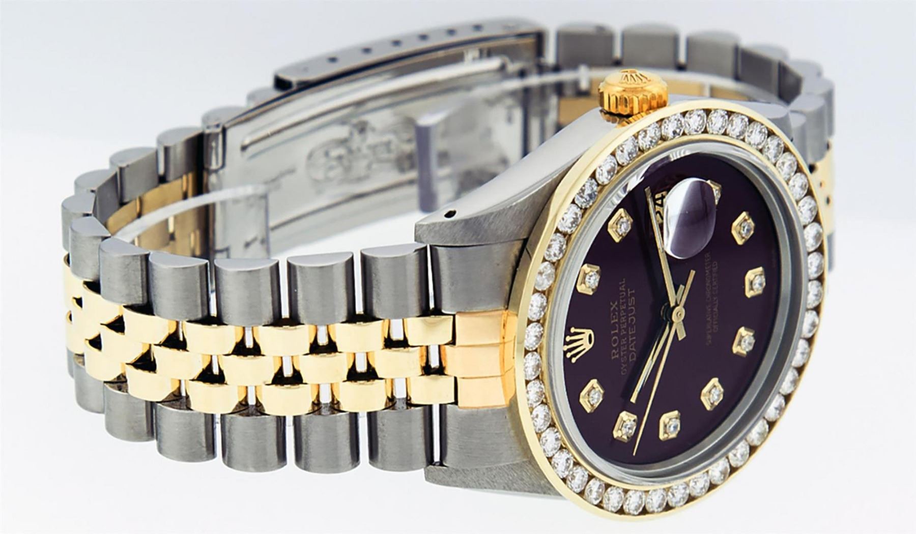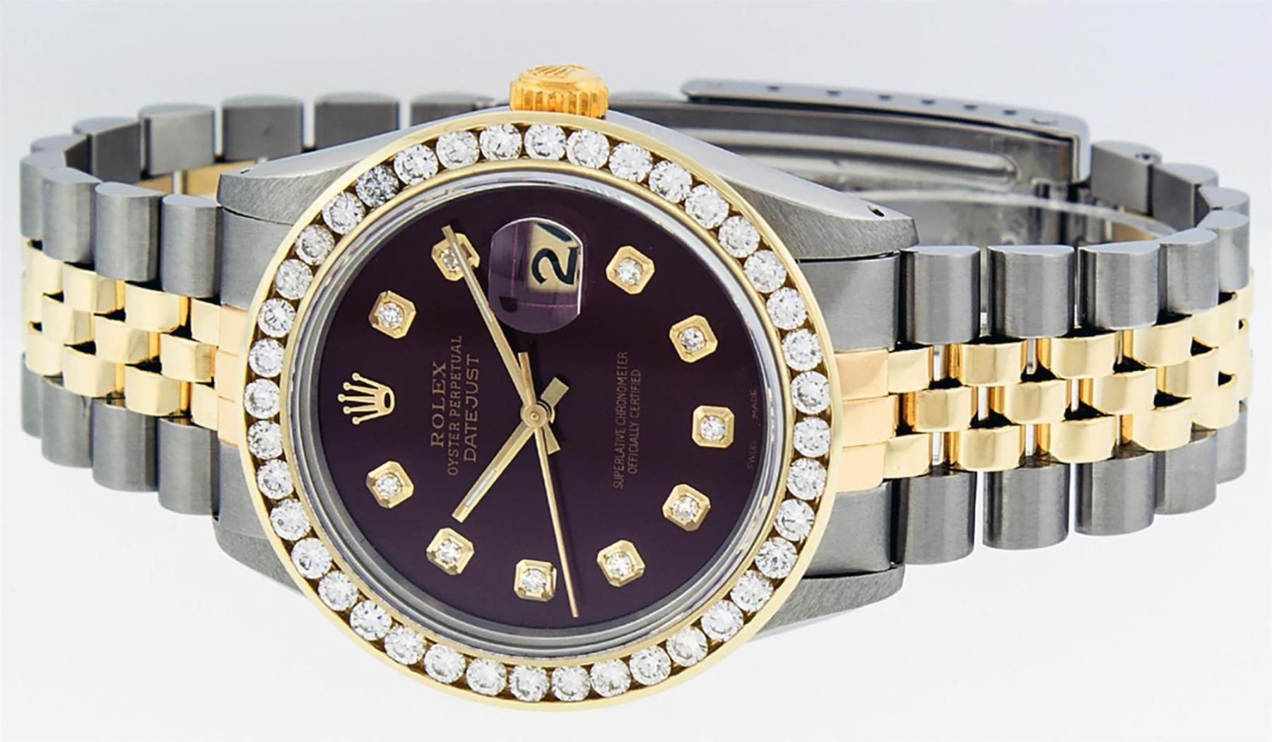 One Mens 14K Yellow Gold Rolex Datejust Polished Bright with Satin Finish, Serviced & Electronically Tested, Stainless Steel Case: 36mm, Yellow Gold Crown, Custom Bezel: New 18K Yellow Gold 3ct Channel Set Diamond Bezel, Diamond Count: 40 Diamonds In Bezel, Total Weight 3.00 Carat, Clarity: SI-VS, Color: G to H. Custom Crystal: New Scratch Resistent Synthetic Sapphire Cyclops Lens. Custom Hands: New Luminecent Hands. Movement: Automatic Winding Movement Caliber 3035. Custom Dial: Maroon Single Cut Diamond Dial, Diamond Count: 10 Diamonds In Dial, Color: G to H, Clarity: VS. Date Window: 3 O'Clock Position Date Display, Quickset, Model: Datejust. Condition: G-6 Extra Fine. Bracelet: 14K Yellow Gold And Stainless Steel Jubilee Band. Bright Polish & Satin Finish. 7.0 Inch Length, Adjustable. Standard Clasp, With Rolex Logo. This Watch Has Been Serviced And Polished It Is Free Of All Scratches And Dents.