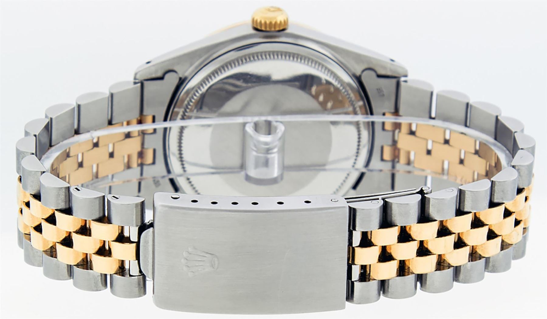 One Mens Yellow Gold Two Tone Rolex Datejust Polished, Serviced & Electronically Tested, Yellow Gold & Stainless Steel Case: 36mm, Yellow Gold Crown, Custom Bezel: New 18K Yellow Gold Beadset Diamond Bezel, Diamond Count: 44 Diamonds, Total Weight 1.00 Carat, Clarity: SI-VS, Color: G to H. Custom Crystal: New Synthetic Sapphire Cyclops Lens. Movement: Automatic Winding Movement . Custom Dial: Mother Of Pearl Dial Set With Diamond Hour Markers and Synthetic Sapphire Baguette Markers On 6 and 9, Diamond Count: 8 + 2 Synthetic Sapphire Bagguettes, Color: G To H In Color, Clarity: SI-VS, Date Window: 3 O'Clock Position Date Display, Quickset, Model: Condition: G-6 Extra Fine. Bracelet: Two Tone Yellow Gold & Stainless Steel Jubilee. Bright Polish. 7.0 Inch Length, Adjustable. Standard Clasp, With Rolex Logo. This Watch Has Been Serviced Time Tested And Is In Excellent Condition It Is Free Of All Scratches And Dents.