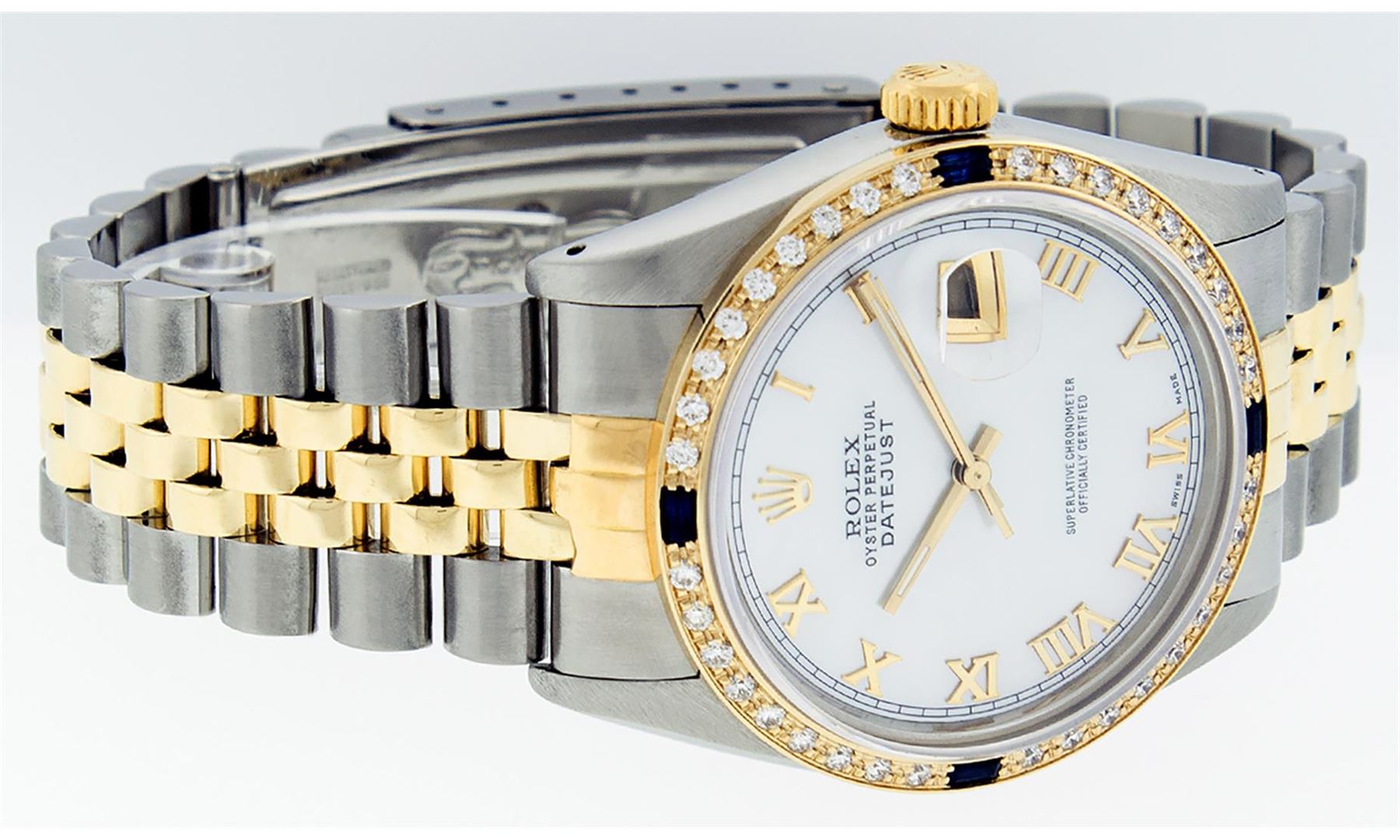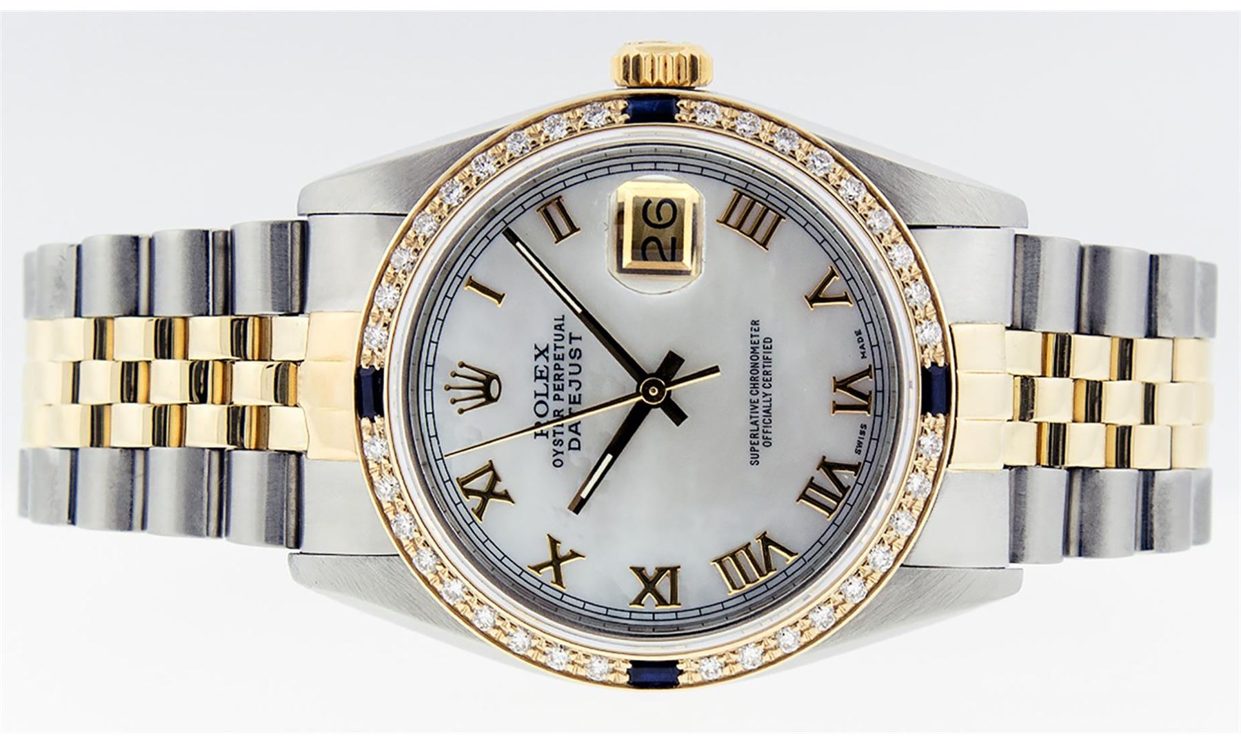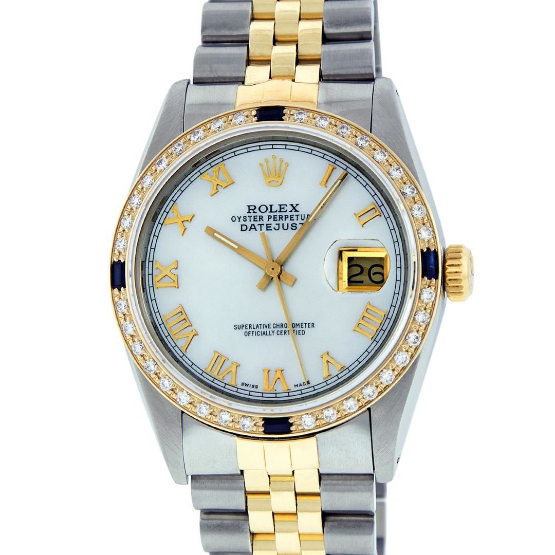 One Mens Yellow Gold Two Tone Rolex Datejust Polished, Serviced & Electronically Tested, Yellow Gold & Stainless Steel Case: 36mm, Yellow Gold Crown, Custom Bezel: 18K Yellow Gold Beadset & Sapphire Diamond Bezel, Stone Count: 36 Diamonds + 4 Sapphires, Total Weight 1.00 Carat, Clarity: SI-VS, Color: G to H. Custom Crystal: New Scratch Resistant Synthetic Sapphire Cyclops Lens. Custom Hands: New Luminecent Hands. Movement: Automatic Winding Movement. Custom Dial: Mother Of Pearl Roman Dial With Square Track. Date Window: 3 O'Clock Position Date Display, Quickset, Model: Datejust. Condition: G-6 Extra Fine. Bracelet: Two Tone Yellow Gold & Stainless Steel Jubilee Band. Bright Polish. 7.0 Inch Length, Adjustable. Standard Clasp, With Rolex Logo. This Watch Has Been Serviced Time Tested And Is In Excellent Condition It Is Free Of All Scratches And Dents.