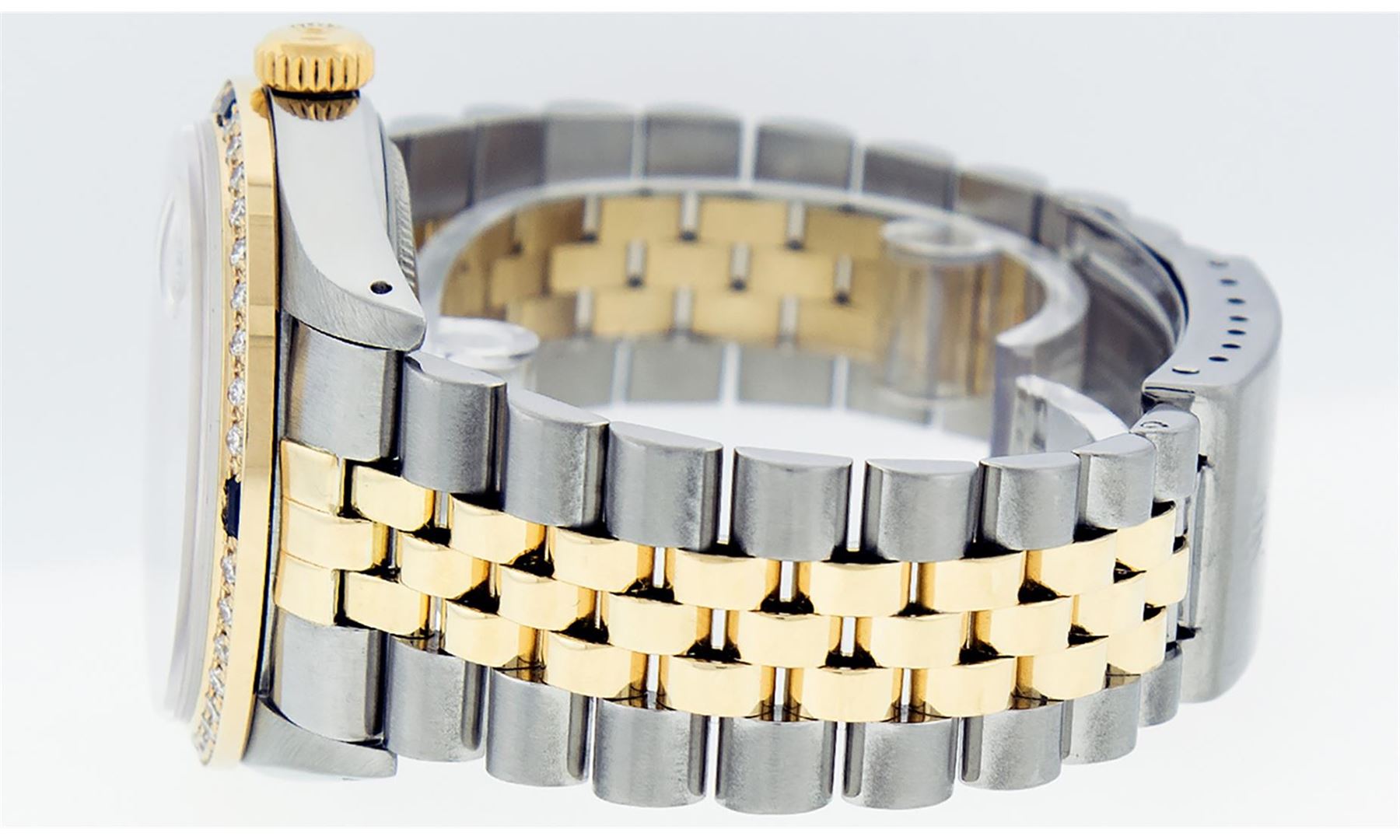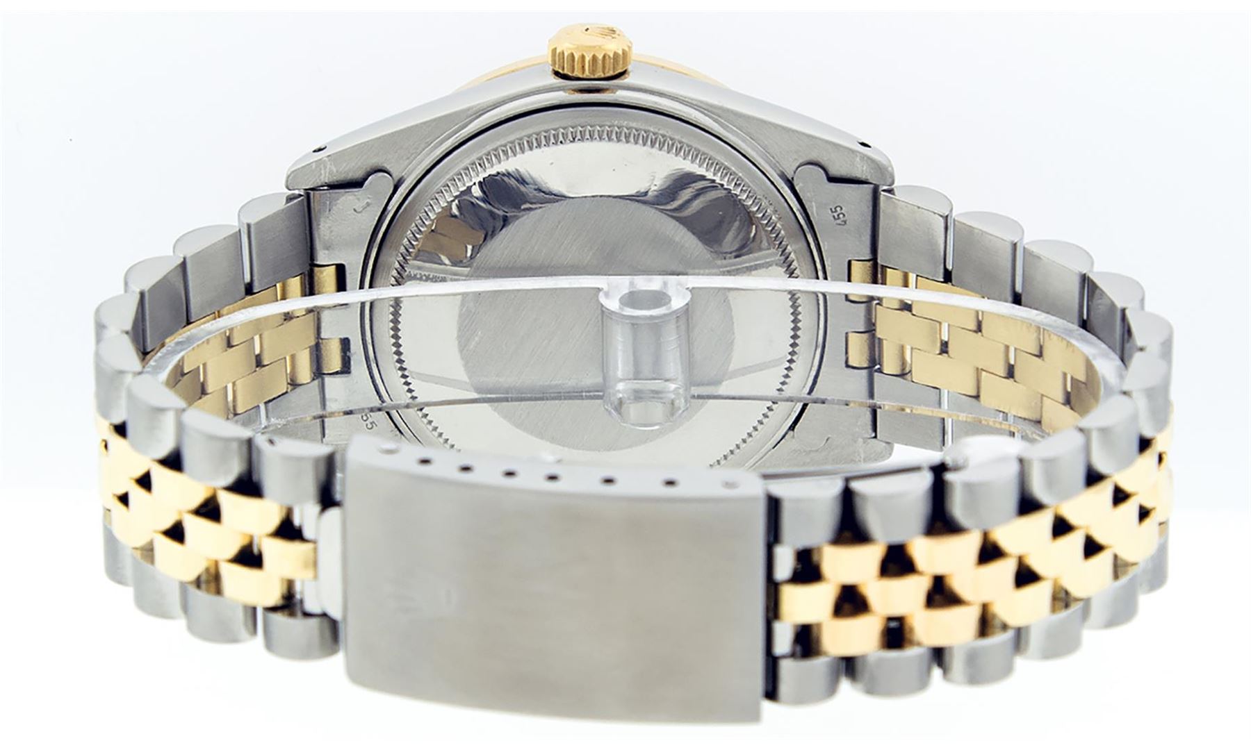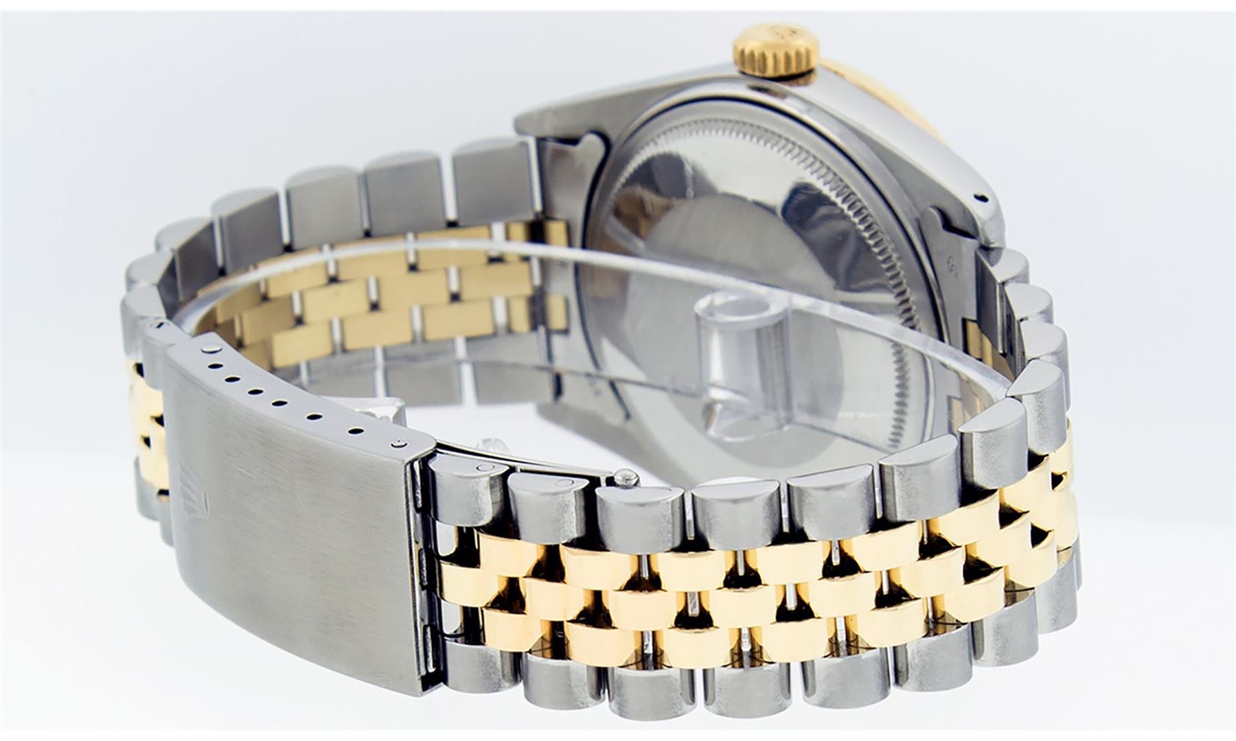 One Mens Yellow Gold Two Tone Rolex Datejust Polished, Serviced & Electronically Tested, Yellow Gold & Stainless Steel Case: 36mm, Yellow Gold Crown, Custom Bezel: 18K Yellow Gold Beadset & Sapphire Diamond Bezel, Stone Count: 36 Diamonds + 4 Sapphires, Total Weight 1.00 Carat, Clarity: SI-VS, Color: G to H. Custom Crystal: New Scratch Resistant Synthetic Sapphire Cyclops Lens. Custom Hands: New Luminecent Hands. Movement: Automatic Winding Movement. Custom Dial: Mother Of Pearl Roman Dial With Square Track. Date Window: 3 O'Clock Position Date Display, Quickset, Model: Datejust. Condition: G-6 Extra Fine. Bracelet: Two Tone Yellow Gold & Stainless Steel Jubilee Band. Bright Polish. 7.0 Inch Length, Adjustable. Standard Clasp, With Rolex Logo. This Watch Has Been Serviced Time Tested And Is In Excellent Condition It Is Free Of All Scratches And Dents.