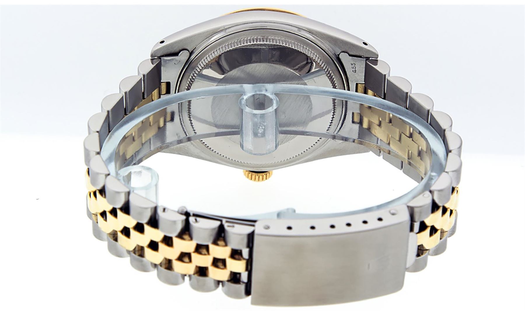 One Mens Yellow Gold Two Tone Rolex Datejust Polished, Serviced & Electronically Tested, Yellow Gold & Stainless Steel Case: 36mm, Yellow Gold Crown, Bezel: Yellow Gold Fluted Bezel. Custom Crystal: New Acrylic Cyclops Lens. Custom Hands: New Luminecent Hands. Movement: Automatic Winding Movement.. Custom Dial: Silver With Diamond Hour Markers, Diamond Count: 10 Diamonds in Dial, G To H In Color, VS Clarity. Date Window: 3 O'Clock Position Date Display, Quickset, Model: Datejust, Condition: G-6 Extra Fine. Bracelet: Two Tone Yellow Gold & Stainless Steel Jubilee Band. Bright Polish. 7.0 Inch Length, Adjustable. Standard Clasp, With Rolex Logo. This Watch Has Been Serviced And Polished It Is Free Of All Scratches And Dents.