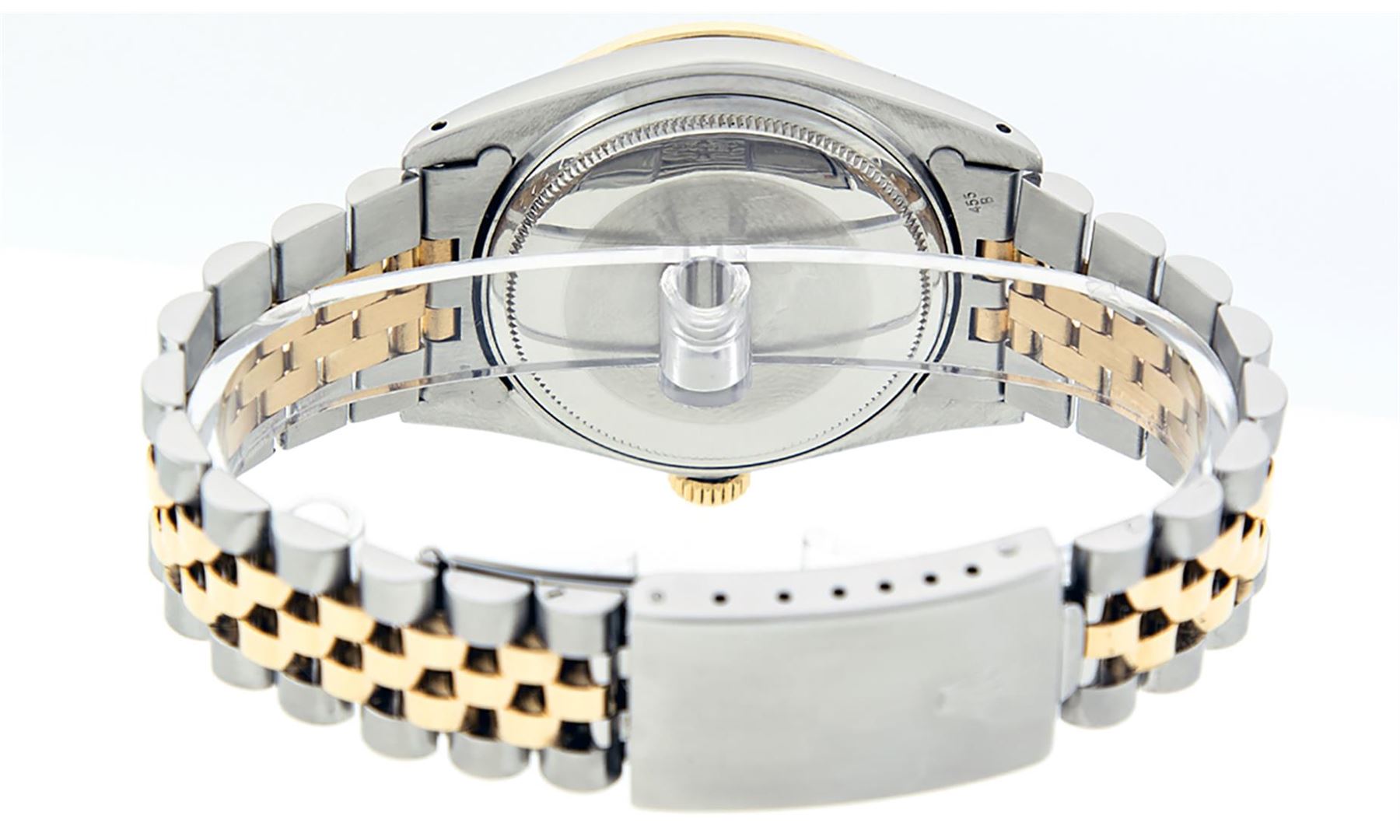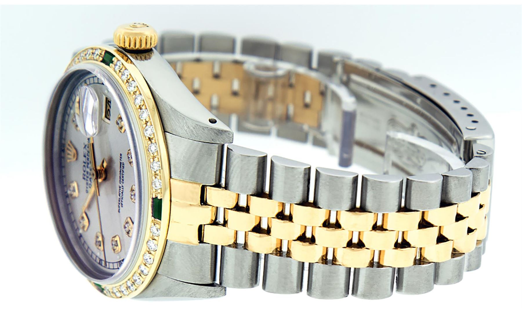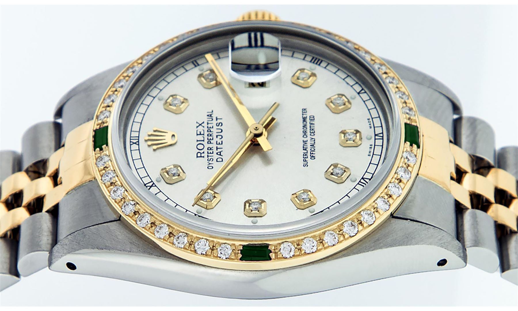 One Mens Yellow Gold Two Tone Rolex Datejust Polished, Serviced & Electronically Tested, Yellow Gold & Stainless Steel Case: 36mm, Yellow Gold Crown, Custom Bezel: New 18K Yellow Gold Emerald Beadset Diamond Bezel, Diamond Count: 36 Diamonds + 4 Emeralds, Total Weight 1.00 Carat, Clarity: SI-VS, Color: G to H. Custom Crystal: New Scratch Resistant Synthetic Sapphire Cyclops Lens. Custom Hands: New Luminecent Hands. Movement: Automatic Winding Movement. Custom Dial: Silver Diamond With Square Roman Track & Lumi Dots. Diamond Count: 10 Diamonds In Dial, Clarity: SI-VS, Color: Color G to H Date Window: 3 O'Clock Position Date Display, Quickset, Model: Datejust, Condition: G-6 Extra Fine. Bracelet:Two Tone Yellow Gold & Stainless Steel Jubilee. Bright Polish. 7.0 Inch Length, Adjustable. Standard Clasp, With Rolex Logo. This Watch Has Been Serviced Time Tested And Is In Excellent Condition It Is Free Of All Scratches And Dents.