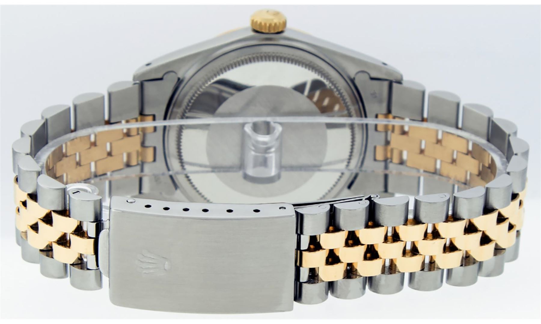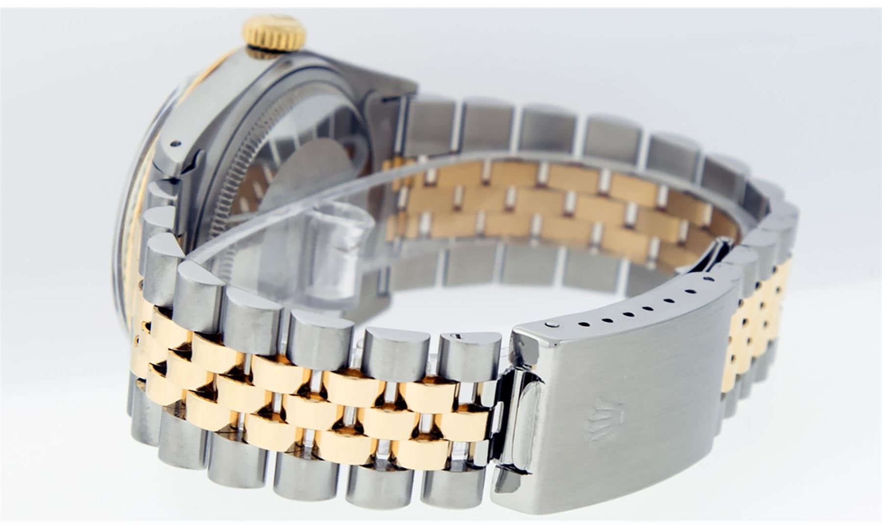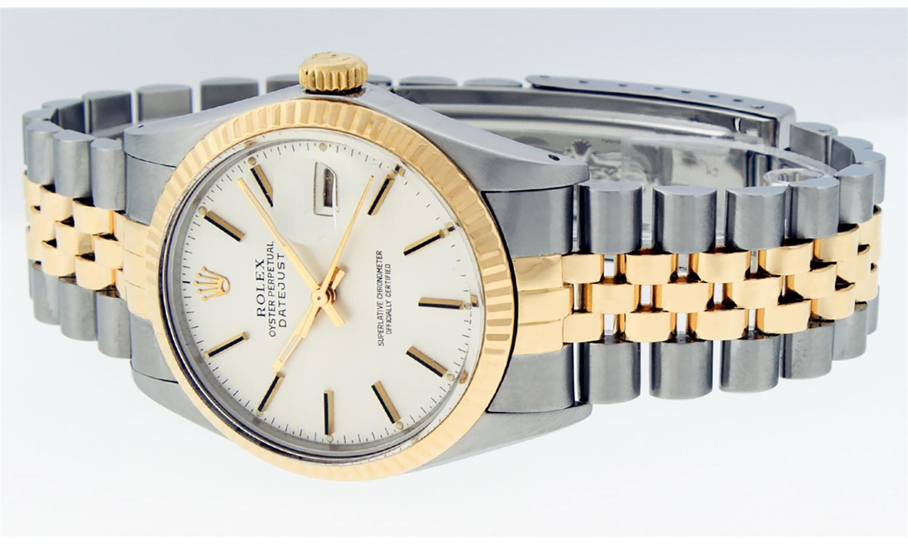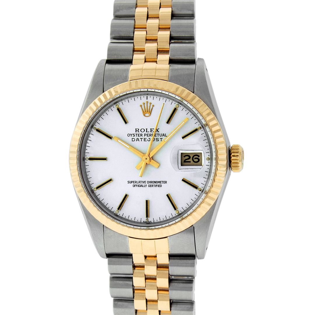 One Mens Rolex Pre Owned Two Tone Yellow Gold And Stainless Steel Rolex Datejust Polished, Serviced & Electronically Tested, Rolex Yellow Gold & Stainless Steel Case: 36mm, Rolex 14K Yellow Gold Crown, Rolex Bezel: 14K Yellow Gold Fluted Bezel. Custom Crystal: New Acrylic With Magnified Date Window. Custom Hands: New Luminescent Hands. Rolex Movement: Automatic Winding Movement 3035. Rolex Dial: Silver Index With Index Hour Markers and Small Track With Lumi Dots. Date Window: 3 O'Clock Position Date Display, Quickset, Model: Datejust. Condition: G-6 Extra Fine. Rolex Bracelet: Two Tone 14K Yellow Gold & Stainless Steel Jubilee Band. Bright Polish. 7.0 Inch Length, Adjustable. Standard Clasp, With Rolex Logo. This Watch Has Been Serviced Time Tested And Is In Excellent Condition It Is Free Of All Scratches And Dents.