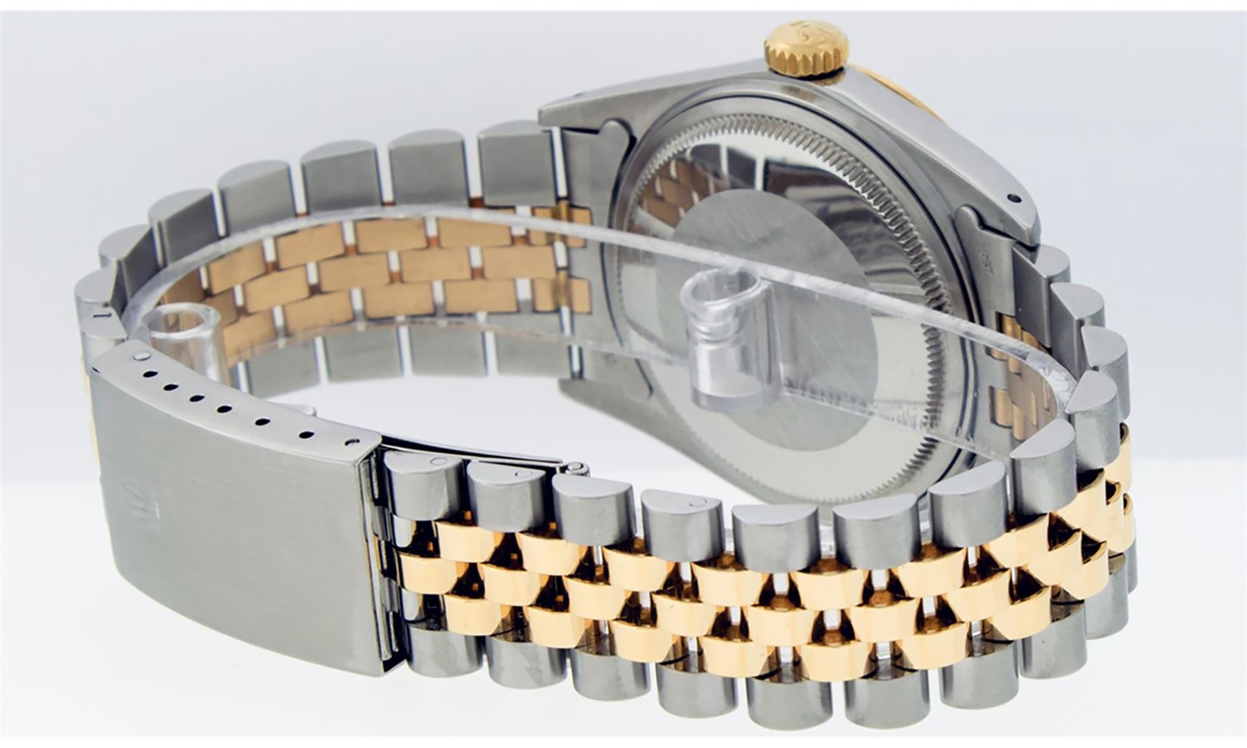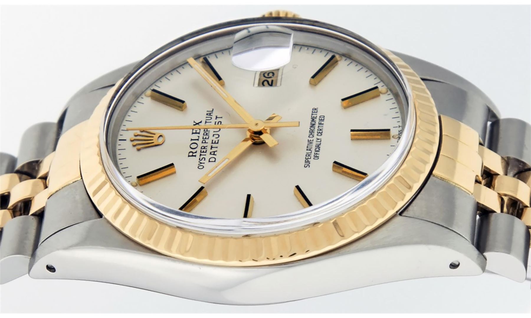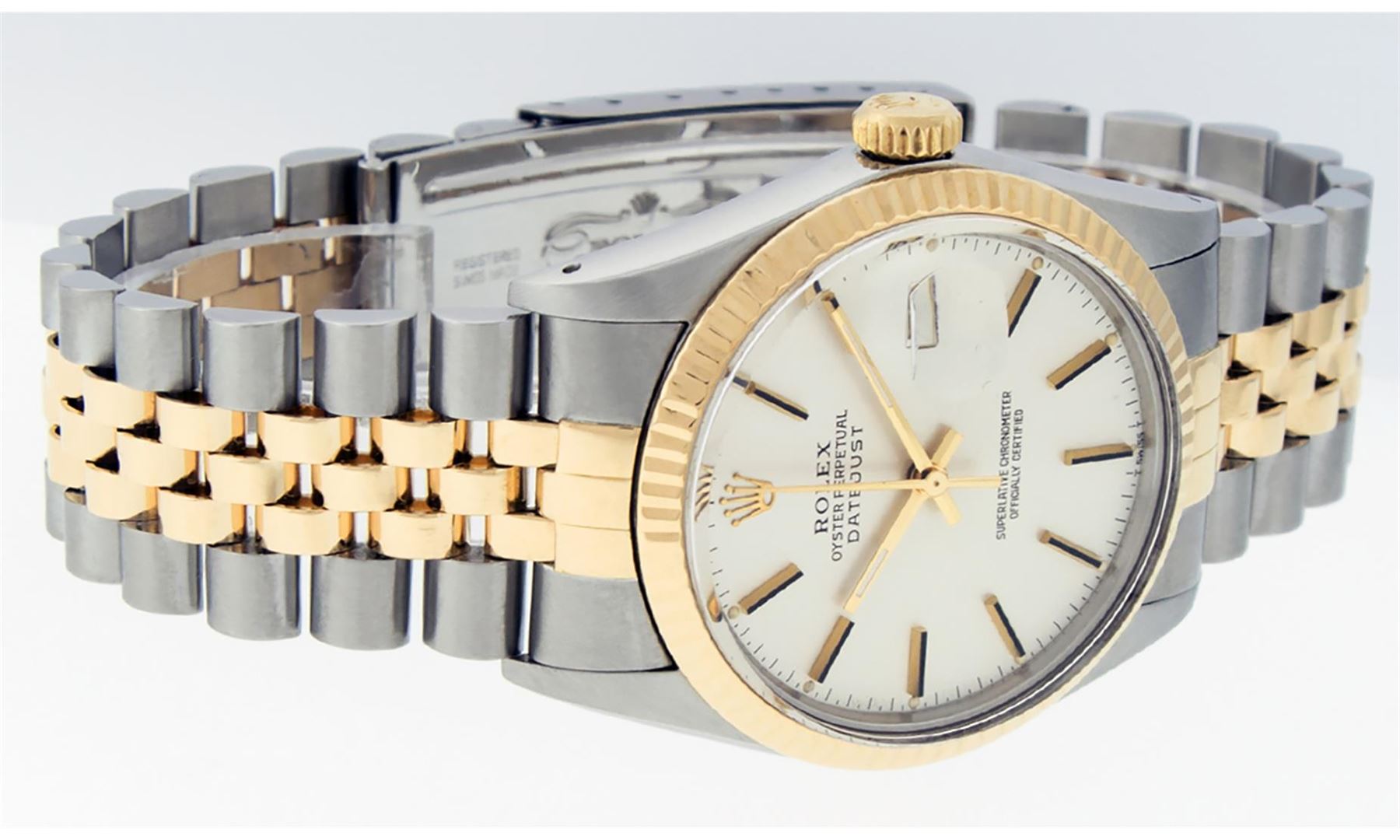 One Mens Rolex Pre Owned Two Tone Yellow Gold And Stainless Steel Rolex Datejust Polished, Serviced & Electronically Tested, Rolex Yellow Gold & Stainless Steel Case: 36mm, Rolex 14K Yellow Gold Crown, Rolex Bezel: 14K Yellow Gold Fluted Bezel. Custom Crystal: New Acrylic With Magnified Date Window. Custom Hands: New Luminescent Hands. Rolex Movement: Automatic Winding Movement 3035. Rolex Dial: Silver Index With Index Hour Markers and Small Track With Lumi Dots. Date Window: 3 O'Clock Position Date Display, Quickset, Model: Datejust. Condition: G-6 Extra Fine. Rolex Bracelet: Two Tone 14K Yellow Gold & Stainless Steel Jubilee Band. Bright Polish. 7.0 Inch Length, Adjustable. Standard Clasp, With Rolex Logo. This Watch Has Been Serviced Time Tested And Is In Excellent Condition It Is Free Of All Scratches And Dents.