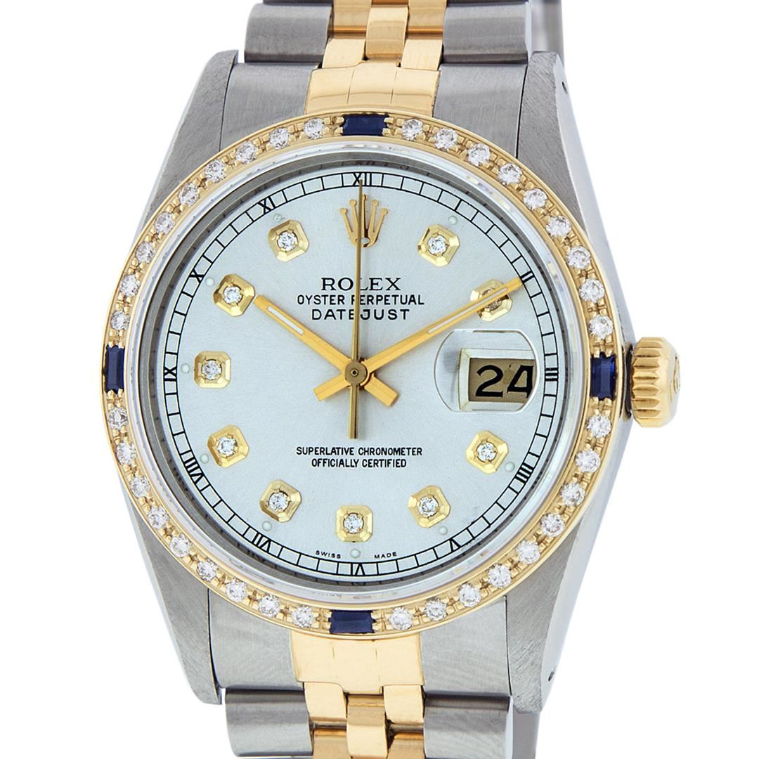 One Mens Yellow Gold Two Tone Rolex Datejust Polished, Serviced & Electronically Tested, Yellow Gold & Stainless Steel Case: 36mm, Yellow Gold Crown, Custom Bezel: New 18K Yellow Gold Sapphire Beadset Diamond Bezel, Diamond Count: 36 Diamonds + 4 Sapphires, Total Weight 1.00 Carat, Clarity: SI-VS, Color: G to H. Custom Crystal: New Scratch Resistant Synthetic Sapphire Cyclops Lens. Custom Hands: New Luminecent Hands. Movement: Automatic Winding Movement . Custom Dial: Silver Diamond With Square Roman Track & Lumi Dots. Diamond Count: 10 Diamonds In Dial, Clarity: SI-VS, Color: Color G to H Date Window: 3 O'Clock Position Date Display, Quickset, Model: Datejust. Condition: G-6 Extra Fine. Bracelet:Two Tone Yellow Gold & Stainless Steel Jubilee. Bright Polish. 7.0 Inch Length, Adjustable. Standard Clasp, With Rolex Logo. This Watch Has Been Serviced Time Tested And Is In Excellent Condition It Is Free Of All Scratches And Dents.