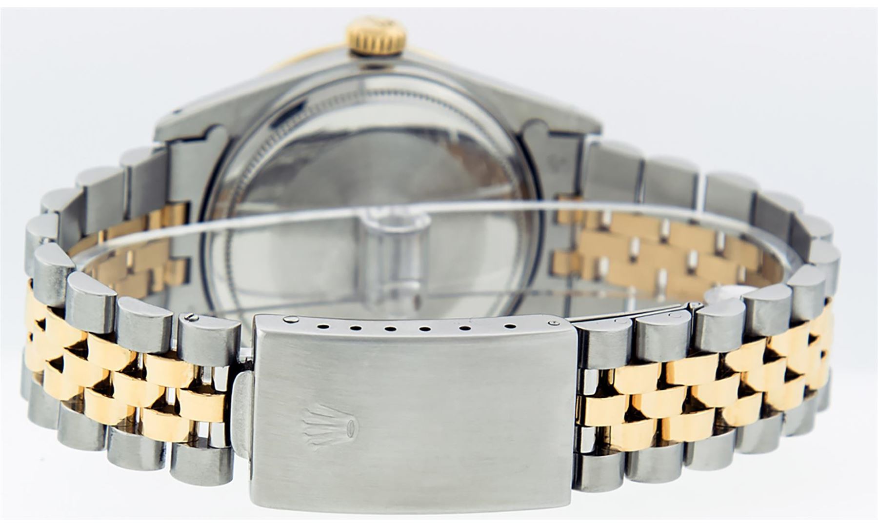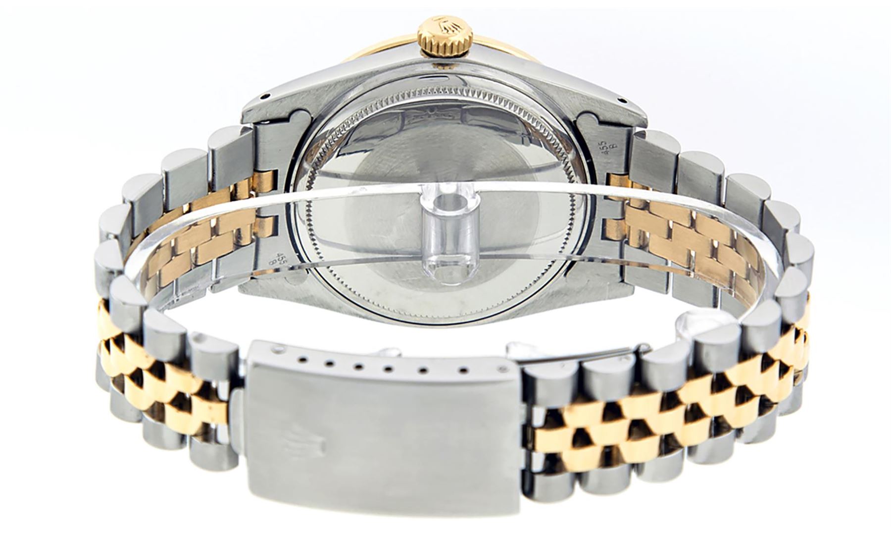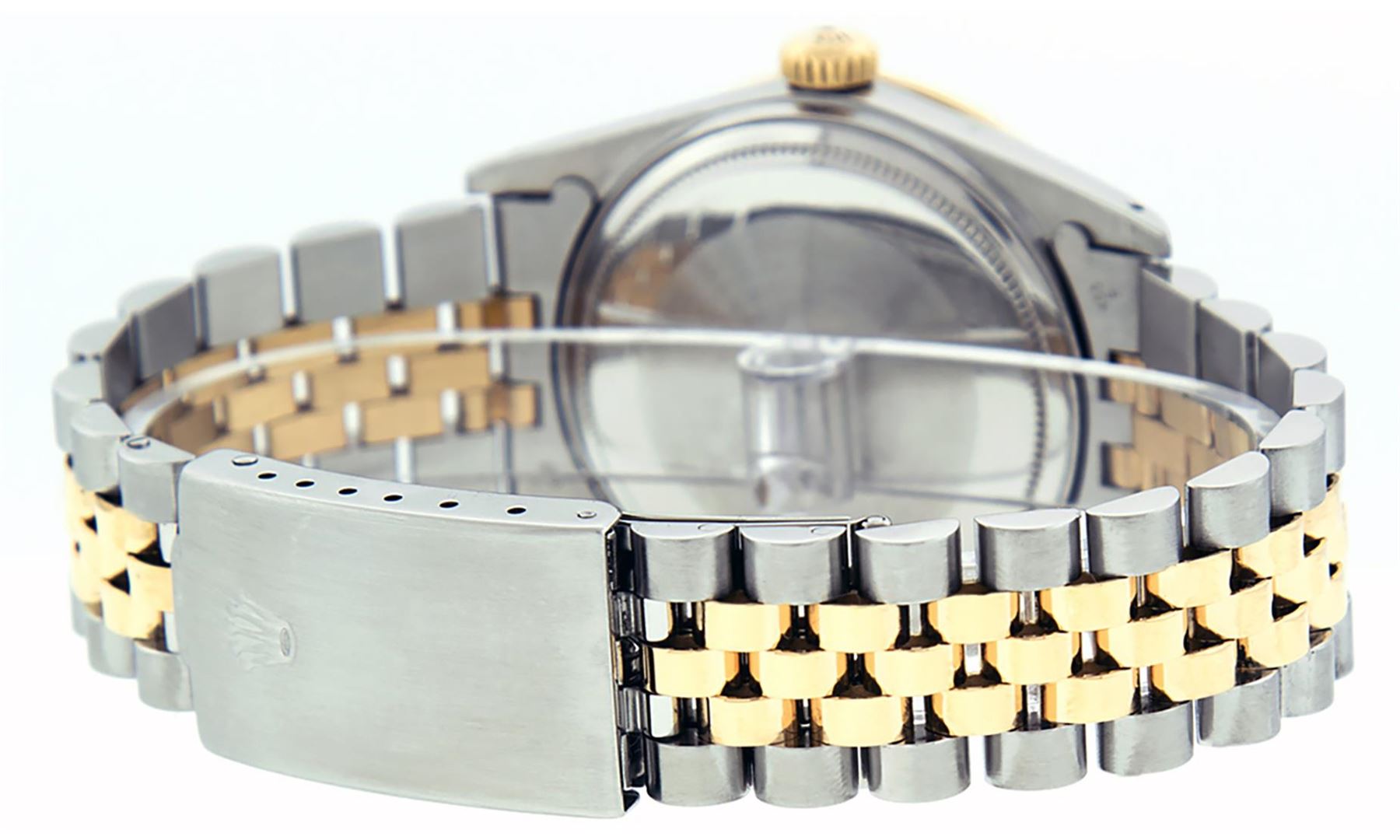 One Mens Yellow Gold Two Tone Rolex Datejust Polished, Serviced & Electronically Tested, Yellow Gold & Stainless Steel Case: 36mm, Yellow Gold Crown, Custom Bezel: New 18K Yellow Gold Sapphire Beadset Diamond Bezel, Diamond Count: 36 Diamonds + 4 Sapphires, Total Weight 1.00 Carat, Clarity: SI-VS, Color: G to H. Custom Crystal: New Scratch Resistant Synthetic Sapphire Cyclops Lens. Custom Hands: New Luminecent Hands. Movement: Automatic Winding Movement . Custom Dial: Silver Diamond With Square Roman Track & Lumi Dots. Diamond Count: 10 Diamonds In Dial, Clarity: SI-VS, Color: Color G to H Date Window: 3 O'Clock Position Date Display, Quickset, Model: Datejust. Condition: G-6 Extra Fine. Bracelet:Two Tone Yellow Gold & Stainless Steel Jubilee. Bright Polish. 7.0 Inch Length, Adjustable. Standard Clasp, With Rolex Logo. This Watch Has Been Serviced Time Tested And Is In Excellent Condition It Is Free Of All Scratches And Dents.