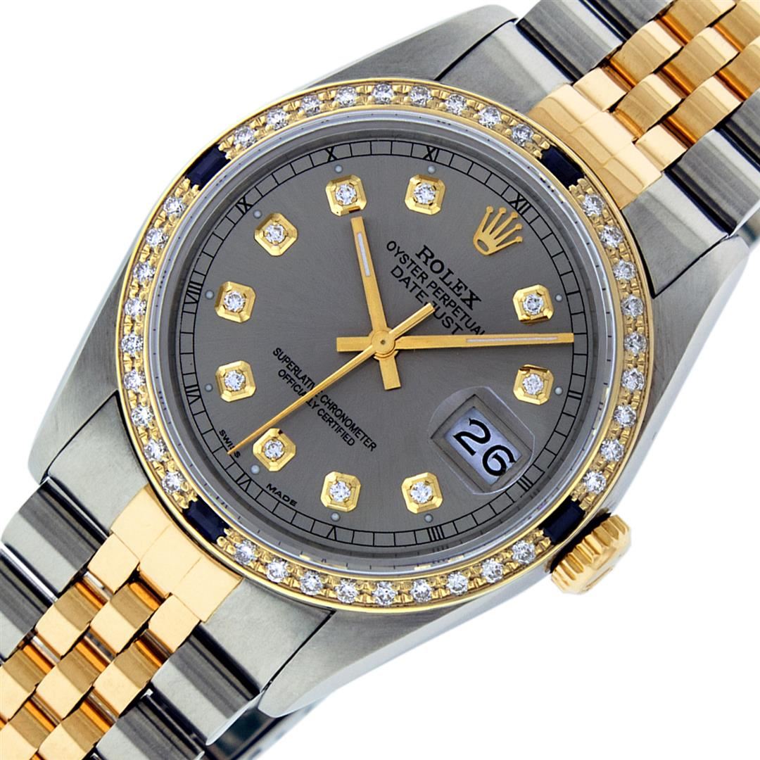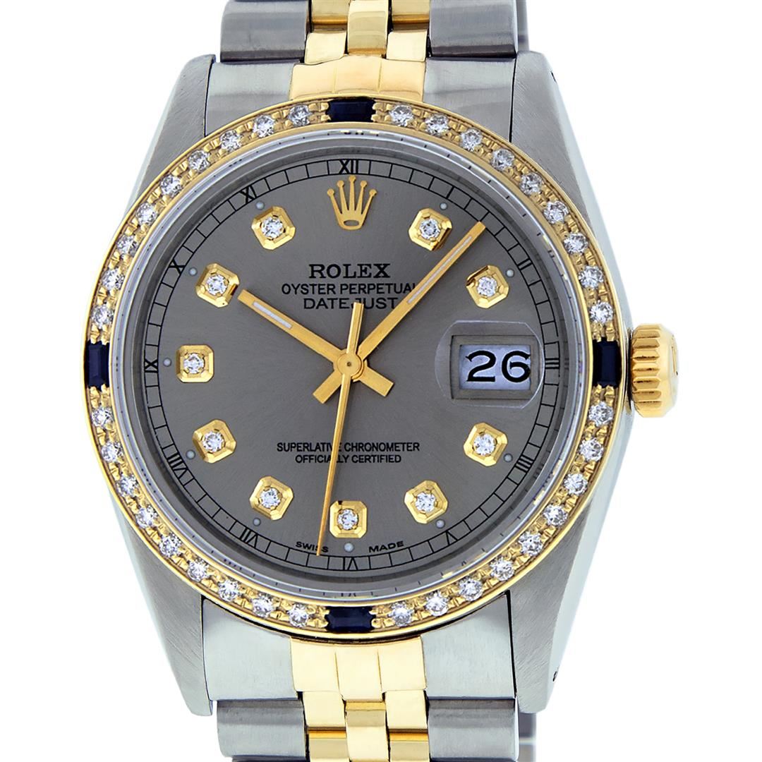 One Mens Yellow Gold Two Tone Rolex Datejust Polished, Serviced & Electronically Tested, Yellow Gold & Stainless Steel Case:36mm, Yellow Gold Crown, Custom Bezel: New 18K Yellow Gold Sapphire Beadset Diamond Bezel, Diamond Count: 36 Diamonds + 4 Sapphires, Total Weight 1.00 Carat, Clarity: SI-VS, Color: G to H. Custom Crystal: New Scratch Resistant Synthetic Sapphire Cyclops Lens. Custom Hands: New Luminecent Hands. Movement: Automatic Winding Movement. Custom Dial: Slate Grey With Diamond Hour Markers And Roman Track With Lumi Dots. Diamond Count: 10 Diamonds On Dial, Clarity: SI-VS, Color: Color G to H Date Window: 3 O'Clock Position Date Display, Quickset, Model: Datejust, Condition: G-6 Extra Fine. Bracelet:Two Tone Yellow Gold & Stainless Steel Jubilee Band. Bright Polish. 7.0 Inch Length, Adjustable. Standard Clasp, With Rolex Logo. This Watch Has Been Serviced Time Tested And Is In Excellent Condition It Is Free Of All Scratches And Dents.