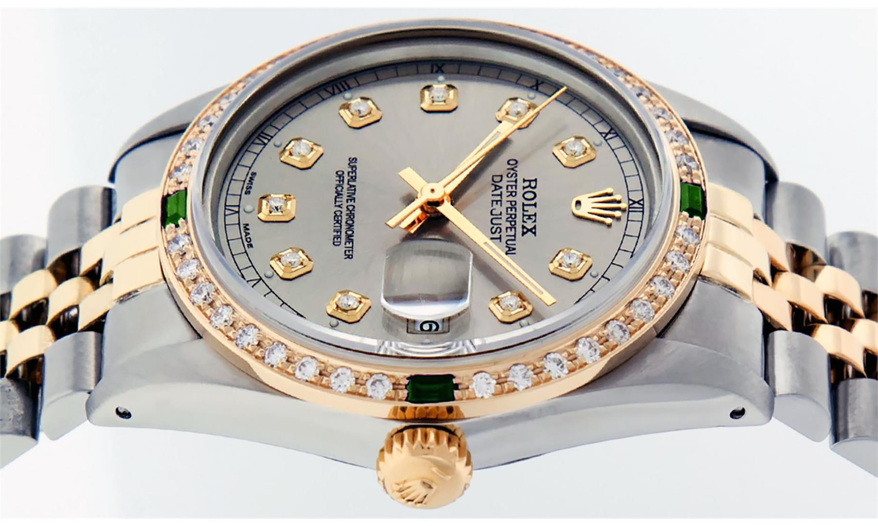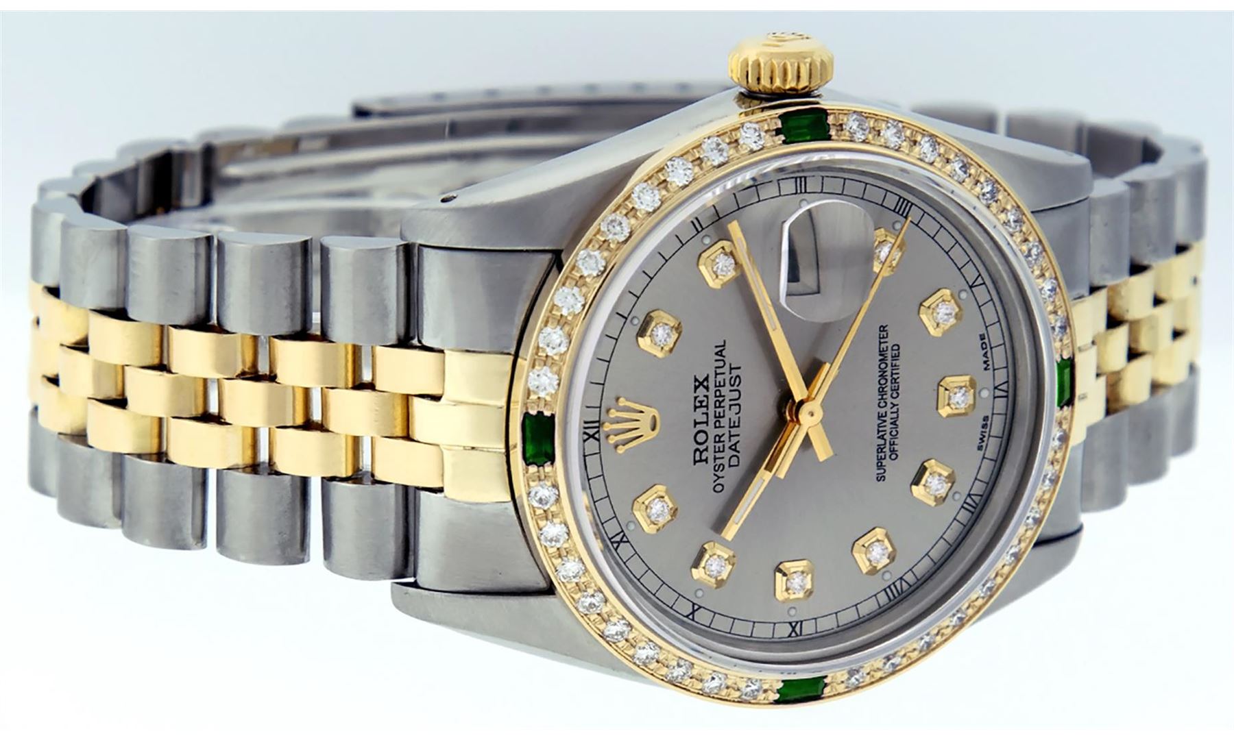 One Mens Yellow Gold Two Tone Rolex Datejust Polished, Serviced & Electronically Tested, Yellow Gold & Stainless Steel Case: 36mm, Yellow Gold Crown, Custom Bezel: New 18K Yellow Gold Emerald Beadset Diamond Bezel, Diamond Count: 36 Diamonds + 4 Emeralds, Total Weight 1.00 Carat, Clarity: SI-VS, Color: G to H. Custom Crystal: New Scratch Resistant Synthetic Sapphire Cyclops Lens. Custom Hands: New Luminecent Hands. Movement: Automatic Winding Movement . Custom Dial: Slate Grey Diamond With Square Roman Track & Lumi Dots. Diamond Count: 10 Diamonds In Dial, Clarity: SI-VS, Color: Color G to H Date Window: 3 O'Clock Position Date Display, Quickset, Model: Datejust. Condition: G-6 Extra Fine. Bracelet:Two Tone Yellow Gold & Stainless Steel Jubilee. Bright Polish. 7.0 Inch Length, Adjustable. Standard Clasp, With Rolex Logo. This Watch Has Been Serviced Time Tested And Is In Excellent Condition It Is Free Of All Scratches And Dents.