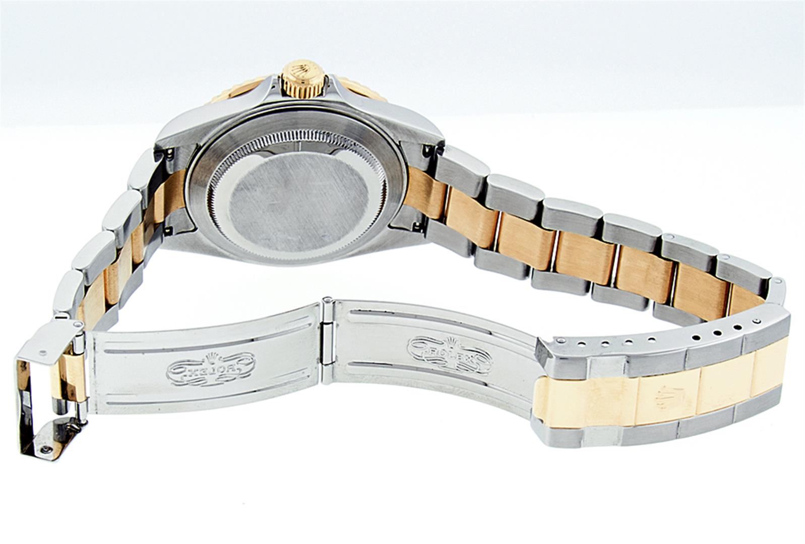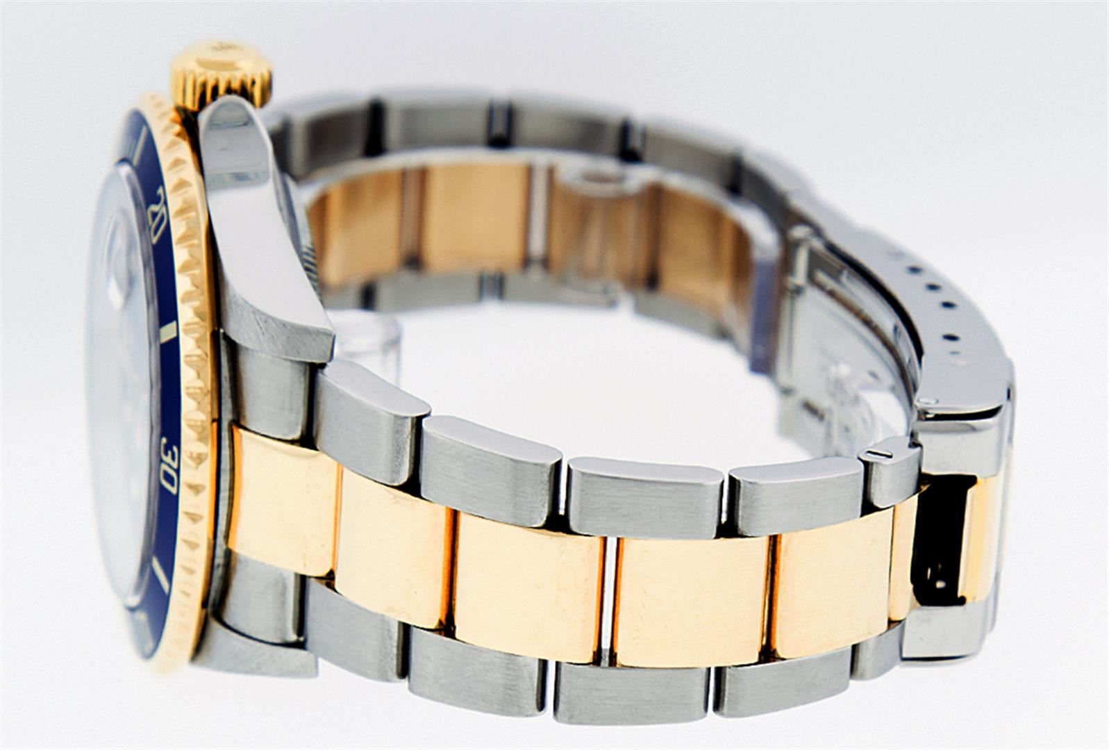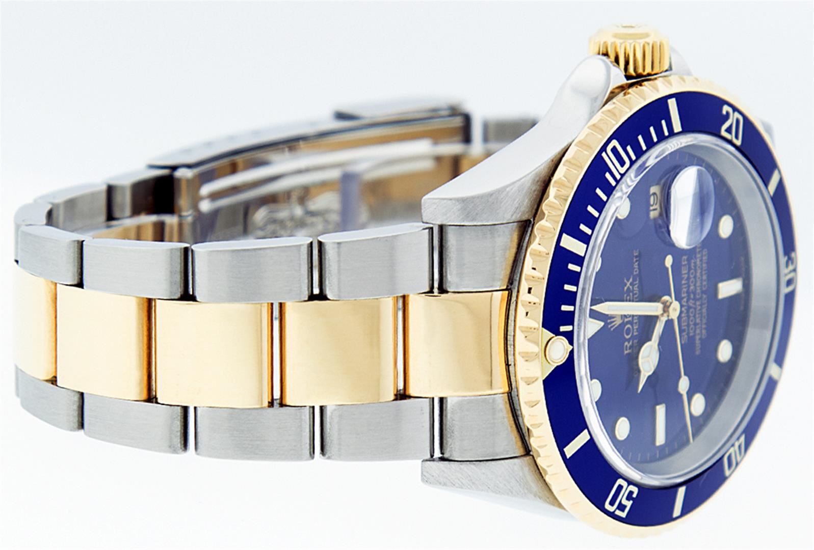 One Mens Pre Owned Rolex 18K Yellow Gold And Stainless Steel Two Tone Submariner With Date Polished, Serviced & Electronically Tested, Rolex Stainless Steel Case: 40mm, Rolex Yellow Gold Crown, Rolex Bezel: Yellow Gold Rotatable Bezel With Blue Insert. Crystal: Sapphire With Magnified Date Window Lens. Rolex Movement: Automatic Winding Movement Caliber 3135. Rolex Dial: Rolex Blue Submariner Dial with Luminous Index Hour Markers, Date Window: 3 O'Clock Position Date Display, Model: Submariner, Quickset, Condition: G-6 Extra Fine. Rolex Bracelet: Stainless Steel and Yellow Gold Oyster Band With Gold Through The Buckle. Bright Polish & Satin Finish. 7.0 Inch Length, Adjustable. Standard Yellow Gold Clasp, With Rolex Logo.
