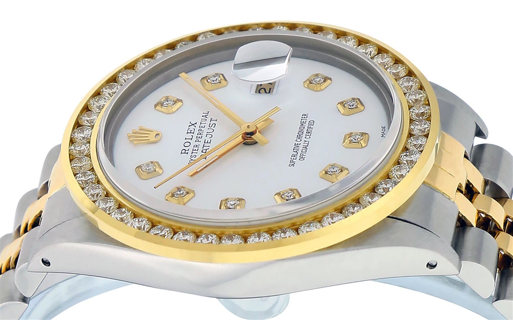 One Mens 14K Yellow Gold Rolex Datejust Polished Bright with Satin Finish, Serviced & Electronically Tested, Stainless Steel Case: 36mm, Yellow Gold Crown, Custom Bezel: New 18K Yellow Gold 3ct Channel Set Diamond Bezel, Diamond Count: 40 Diamonds, Total Weight 3.00 Carat, Clarity: SI-VS, Color: G to H. Custom Crystal: New Synthetic Sapphire Cyclops Lens. Custom Hands: New Luminecent Hands. Movement: Automatic Winding Movement Caliber 3035. Custom Dial: White Diamond Dial, Diamond Count: 10 Diamonds In Dial, Color: G to H, Clarity: SI-VS. Date Window: 3 O'Clock Position Date Display, Quickset, Model: 16013 Datejust Condition: G-6 Extra Fine. Bracelet: 14K Yellow Gold And Stainless Steel Jubilee Band. Bright Polish & Satin Finish. 7.0 Inch Length, Adjustable. Standard Clasp, With Rolex Logo. This Watch Has Been Serviced And Polished It Is Free Of All Scratches And Dents.