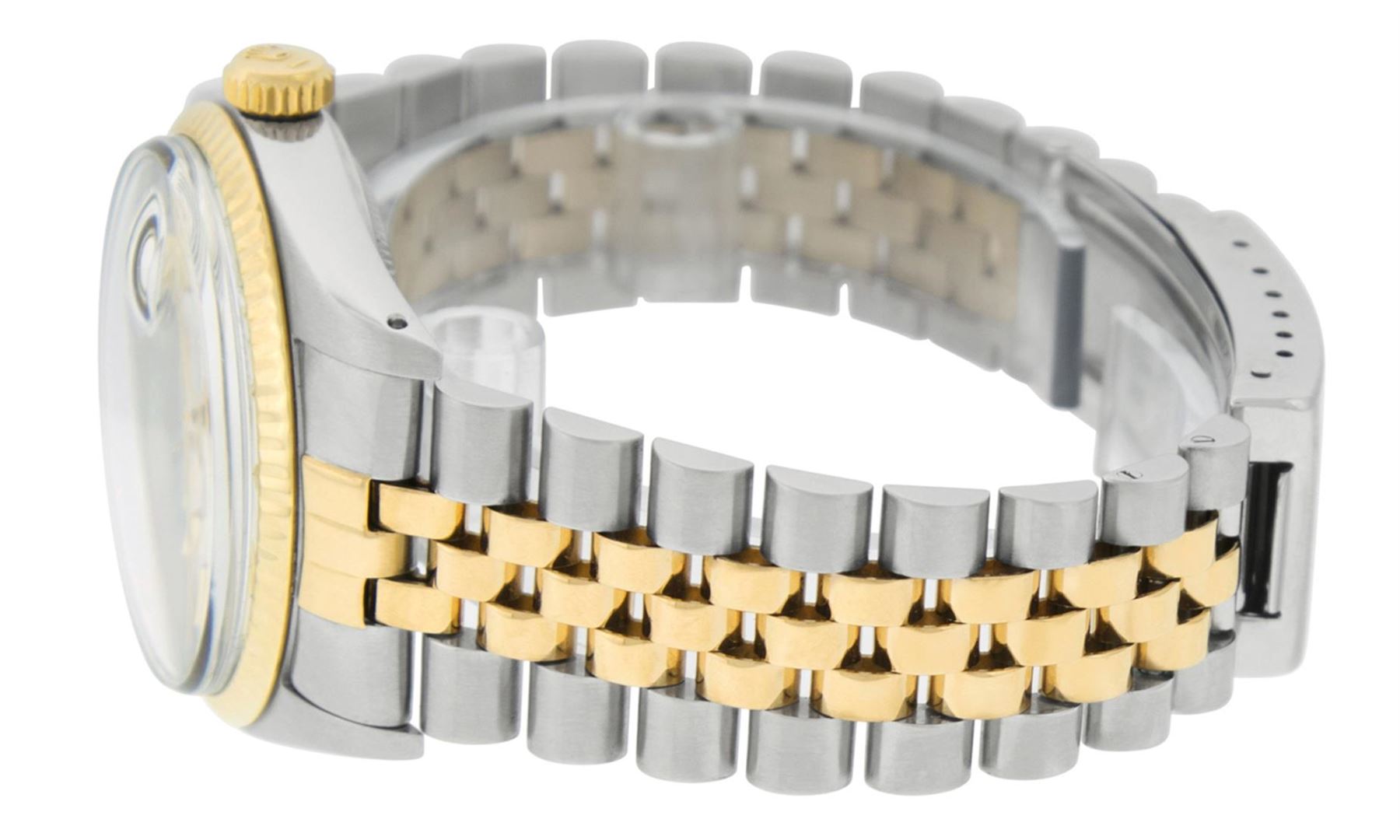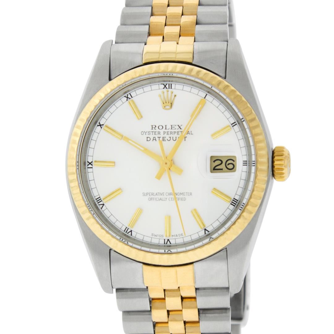 One Mens Yellow Gold Two Tone Rolex Datejust Polished, Serviced & Electronically Tested, Yellow Gold & Stainless Steel Case: 36mm,14K Yellow Gold Crown, Bezel: Yellow Gold Fluted Bezel. Custom Crystal: New Acrylic Cyclops Lens. Custom Hands: New Luminecent Hands. Movement: Automatic Winding Movement . Custom Dial: White Index With Square Roman Track. Date Window: 3 O'Clock Position Date Display, Quickset, Model: Datejust. Condition: G-6 Extra Fine. Bracelet:Two Tone Yellow Gold & Stainless Steel Jubilee Band. Bright Polish. 7.0 Inch Length, Adjustable. Standard Clasp, With Rolex Logo. This Watch Has Been Serviced Time Tested And Is In Excellent Condition It Is Free Of All Scratches And Dents.