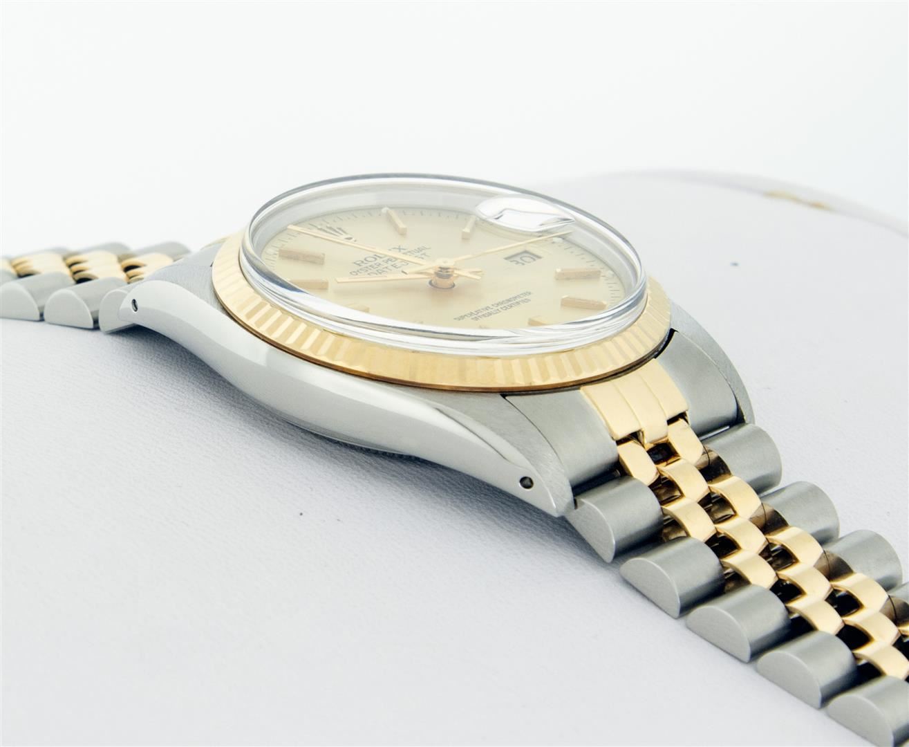 One Mens Rolex Pre Owned 14K Two Tone Yellow Gold And Stainless Steel Datejust Polished, Serviced & Electronically Tested, Yellow Gold & Stainless Steel Case: 36mm, Yellow Gold Crown, Rolex Bezel: 14K Yellow Gold Fluted Bezel. Custom Crystal: New Acrylic With Magnified Date Window. Custom Hands: New Luminescent Hands. Rolex Movement: Automatic Winding Movement 3035. Rolex Dial: Champagne Index Dial With Dash Track & Lumi Dots. Date Window: 3 O'Clock Position Date Display, Quickset, Model: Datejust. Condition: G-6 Extra Fine. Rolex Bracelet: Two Tone 14K Yellow Gold And Stainless Steel Jubilee Band. Bright Polish. 7.0 Inch Length, Adjustable. Standard Clasp, With Rolex Logo. This Watch Has Been Serviced Time Tested And Is In Excellent Condition It Is Free Of All Scratches And Dents.