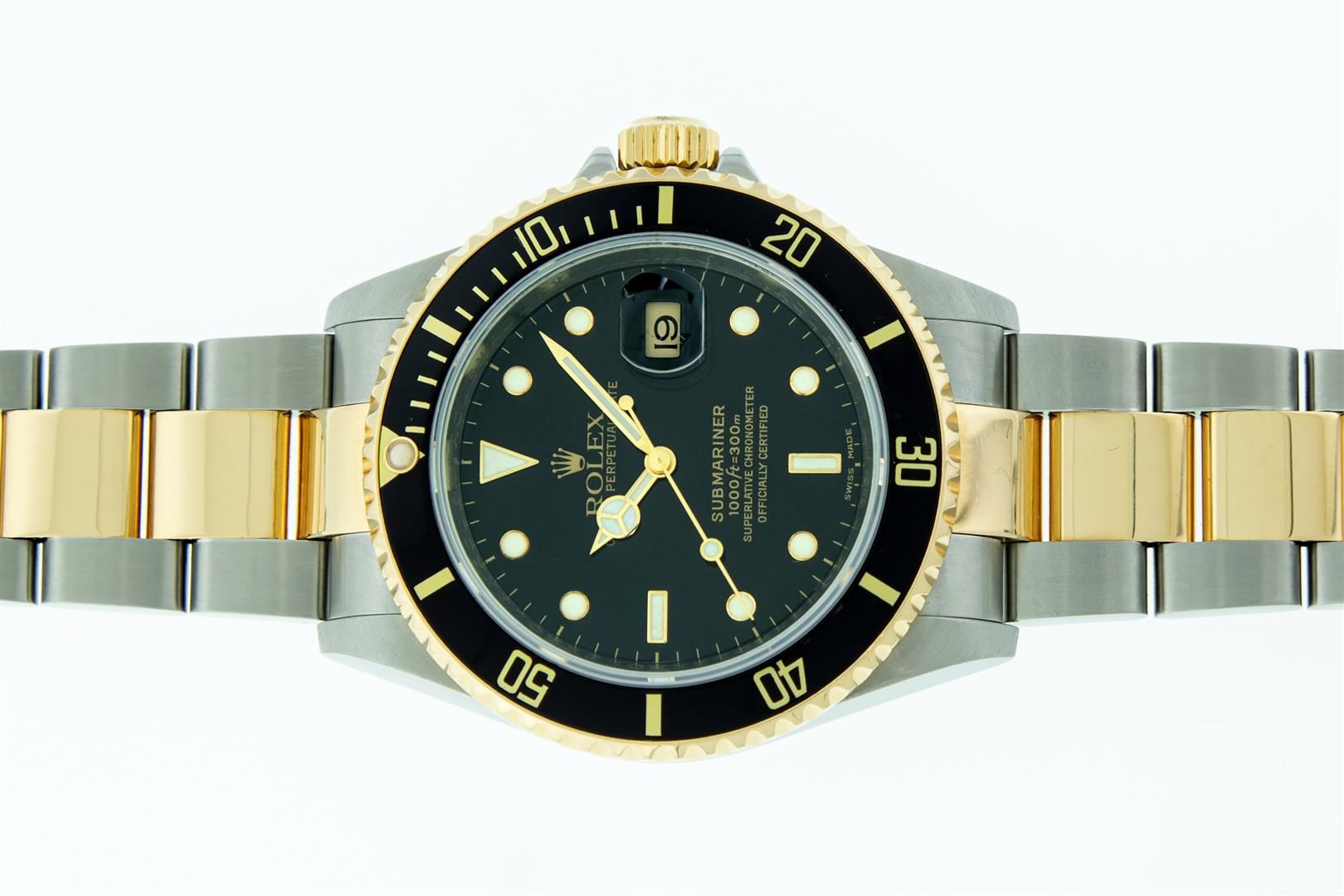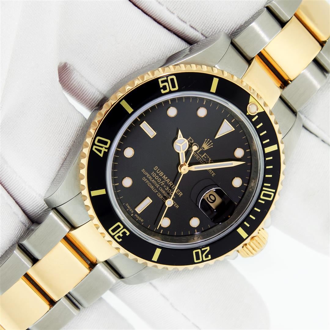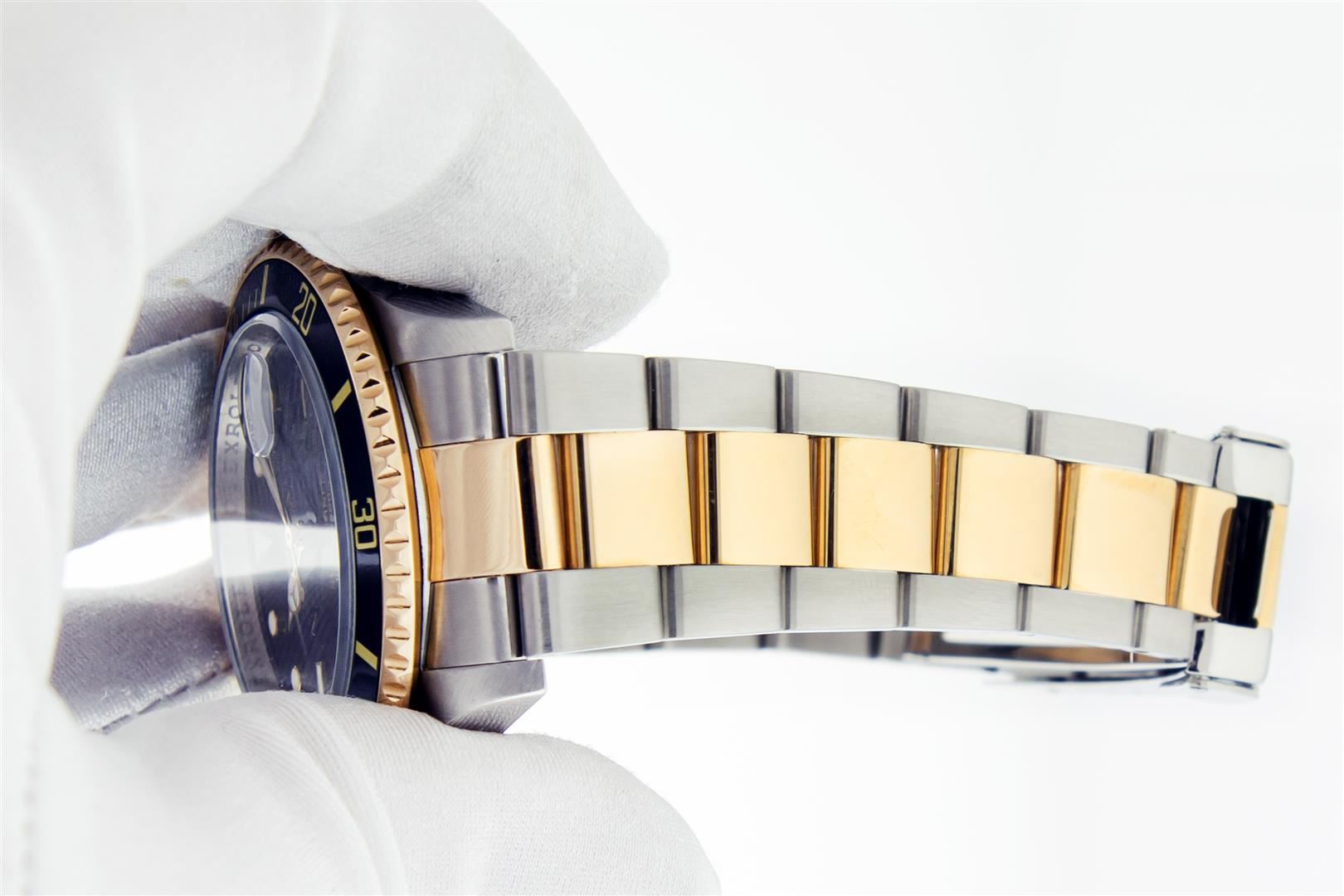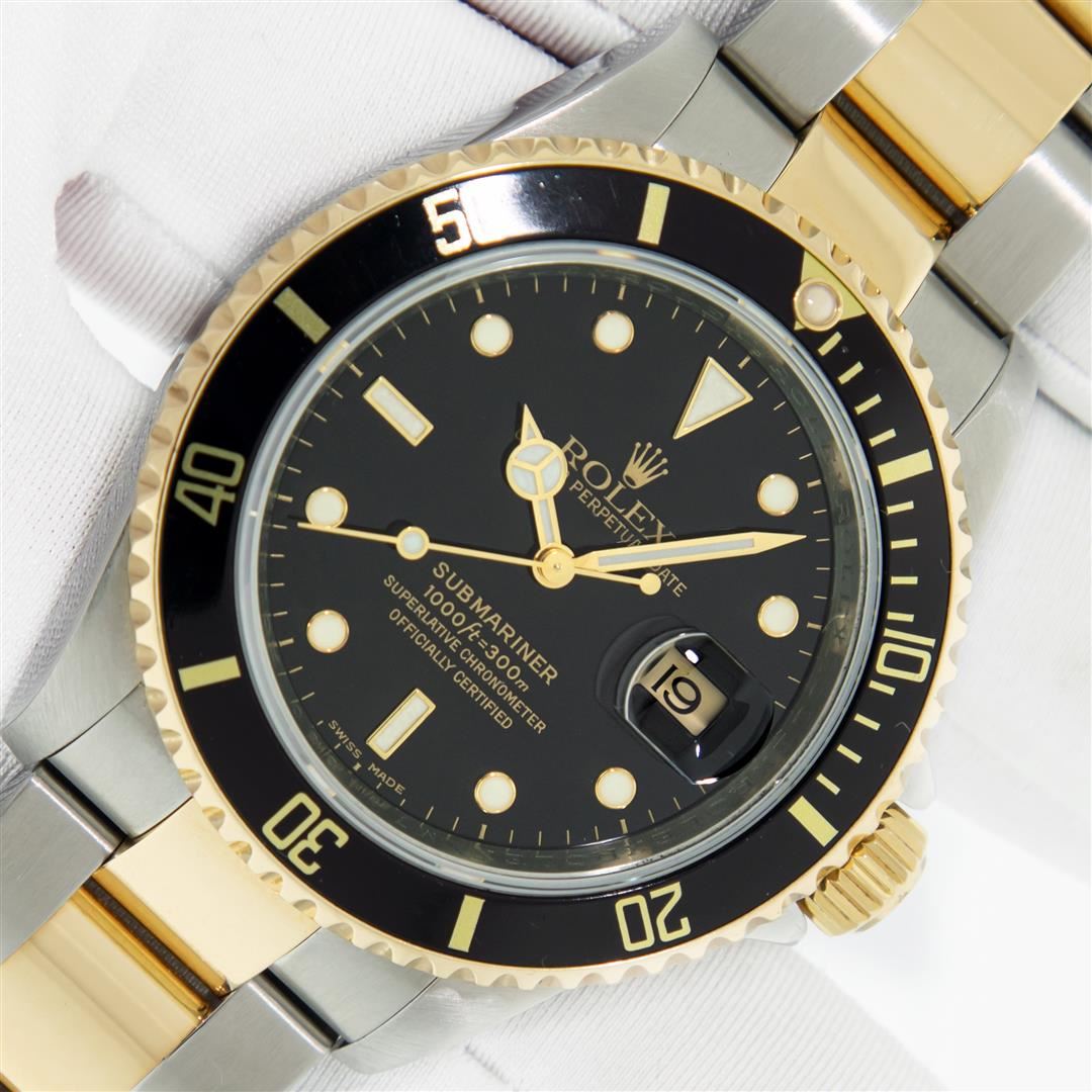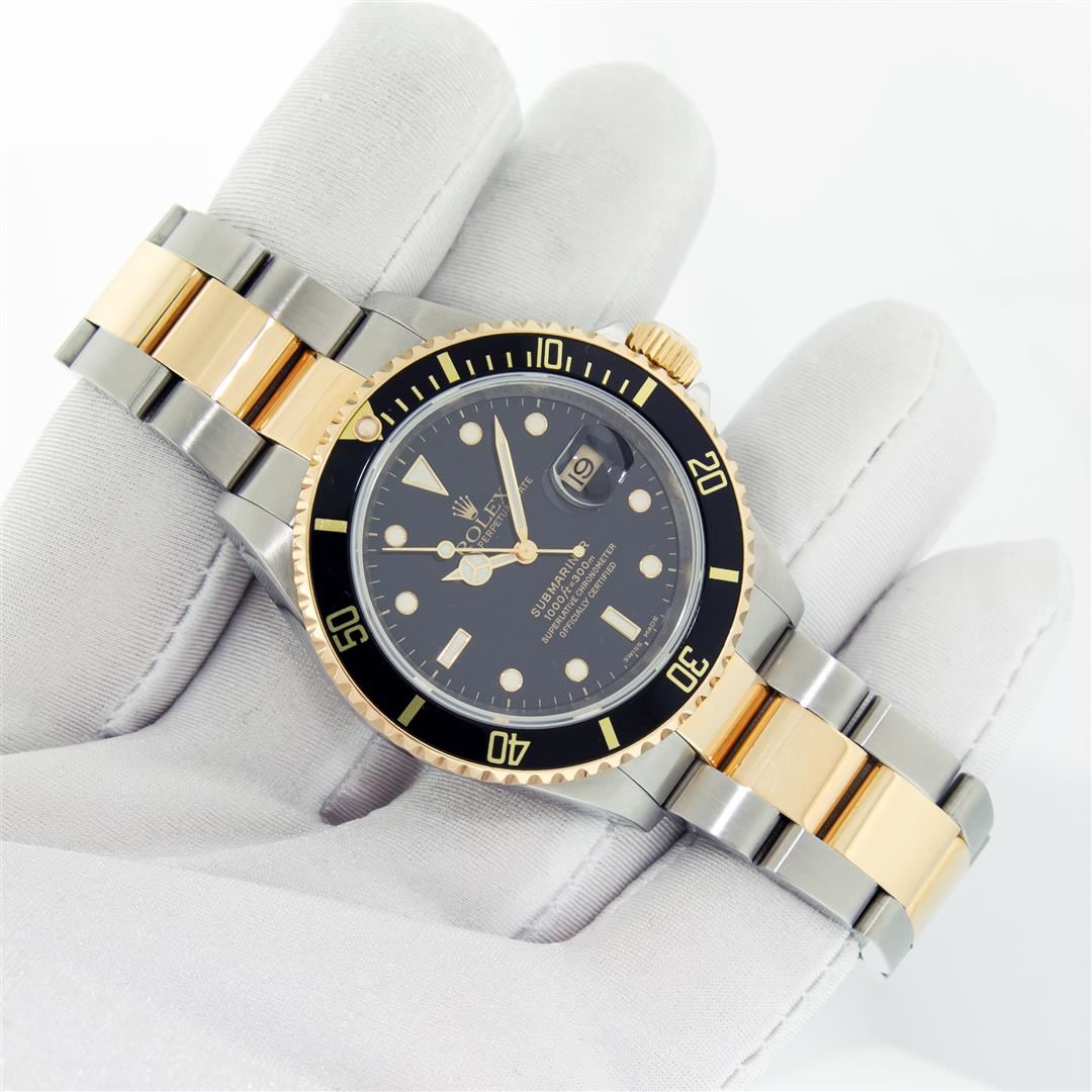 One Mens Pre Owned Rolex Two Tone 18K Yellow Gold And Stainless Steel Submariner With Date Polished, Serviced & Electronically Tested, Rolex Stainless Steel Case: 40mm, Yellow Gold Crown, Rolex Bezel: 18K Yellow Gold Rotatable Bezel With Blue Insert. Rolex Crystal: Sapphire With Cyclops Lens. Rolex Movement: Automatic Winding Movement Caliber 3135. Rolex Dial: Rolex Black Submariner Dial with Luminous Index Hour Markers, Date Window: 3 O'Clock Position Date Display, Model: Submariner, Quickset, Condition: G-6 Extra Fine. Rolex Bracelet: Stainless Steel and Yellow Gold Oyster Band. Bright Polish & Satin Finish. 7.0 Inch Length, Adjustable. Standard Yellow Gold Clasp, With Rolex Logo. This Watch Comes With A Rolex Box.