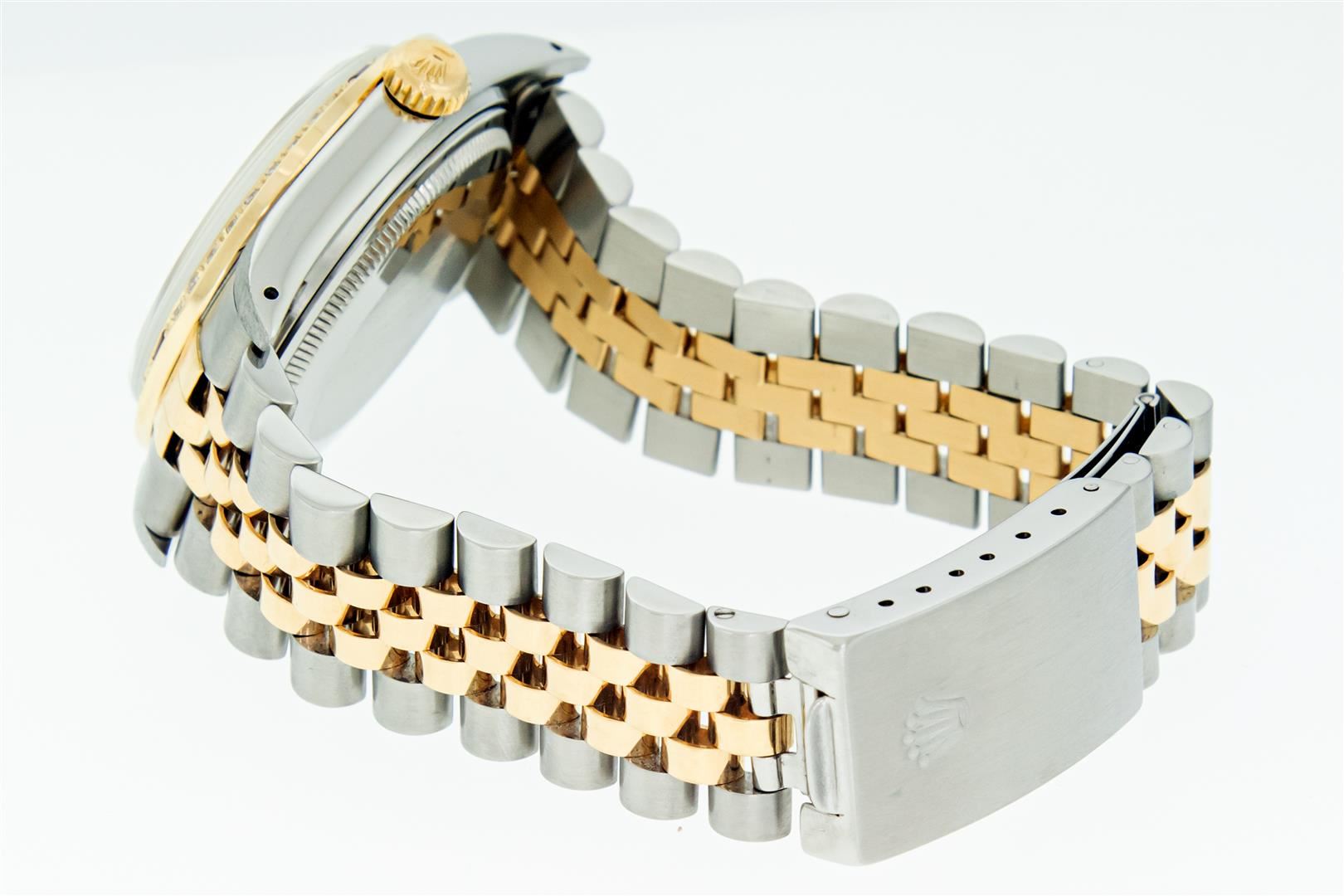 One Mens Pre owned Two Tone Yellow Gold & Stainless Steel Rolex Datejust Polished, Serviced & Electronically Tested, Yellow Gold & Stainless Steel Case: 36mm, Rolex Yellow Gold Crown, Custom Bezel: New 18K Yellow Gold Sapphire Beadset Diamond Bezel, Diamond Count: 36 Diamonds + 4 Sapphires, Clarity: SI-VS, Color: G to H. Custom Crystal: New Sapphire With Magnified Date Window. Custom Hands: New Hands. Rolex Movement: Automatic Winding Movement. Rolex Factory Dial: Champagne Dial With Diamond Hour Markers. Diamond Count: 10 Diamonds In Dial. Date Window: 3 O'Clock Position Date Display, Quickset, Model: Datejust. Condition: G-6 Extra Fine. Rolex Bracelet: Two Tone Yellow Gold & Stainless Steel Jubilee Band. Bright Polish. 7.0 Inch Length, Adjustable. Standard Clasp, With Rolex Logo. This Pre Owned Watch Has Been Serviced Time Tested And Is In Excellent Condition It Is Free Of All Scratches And Dents.