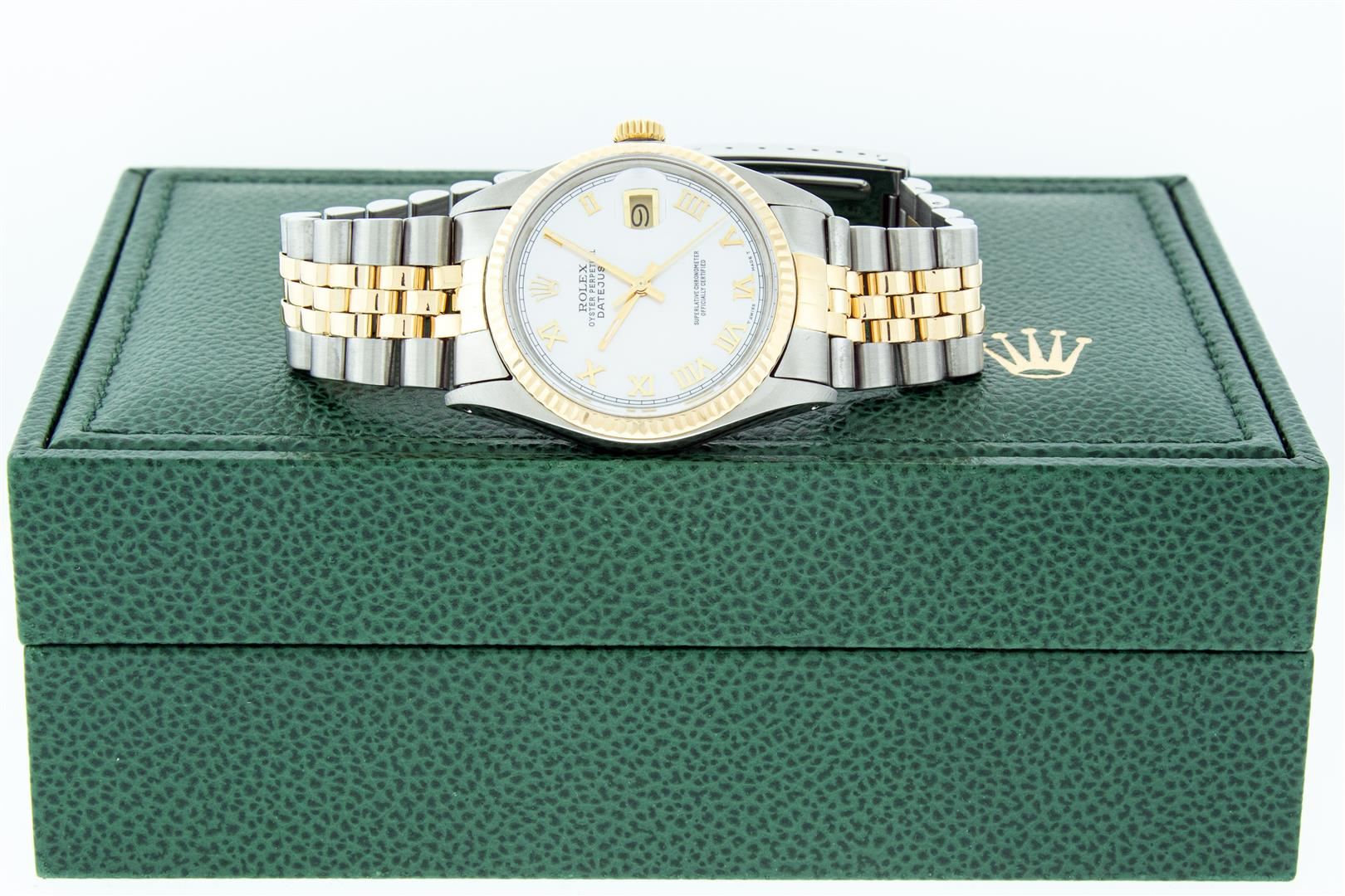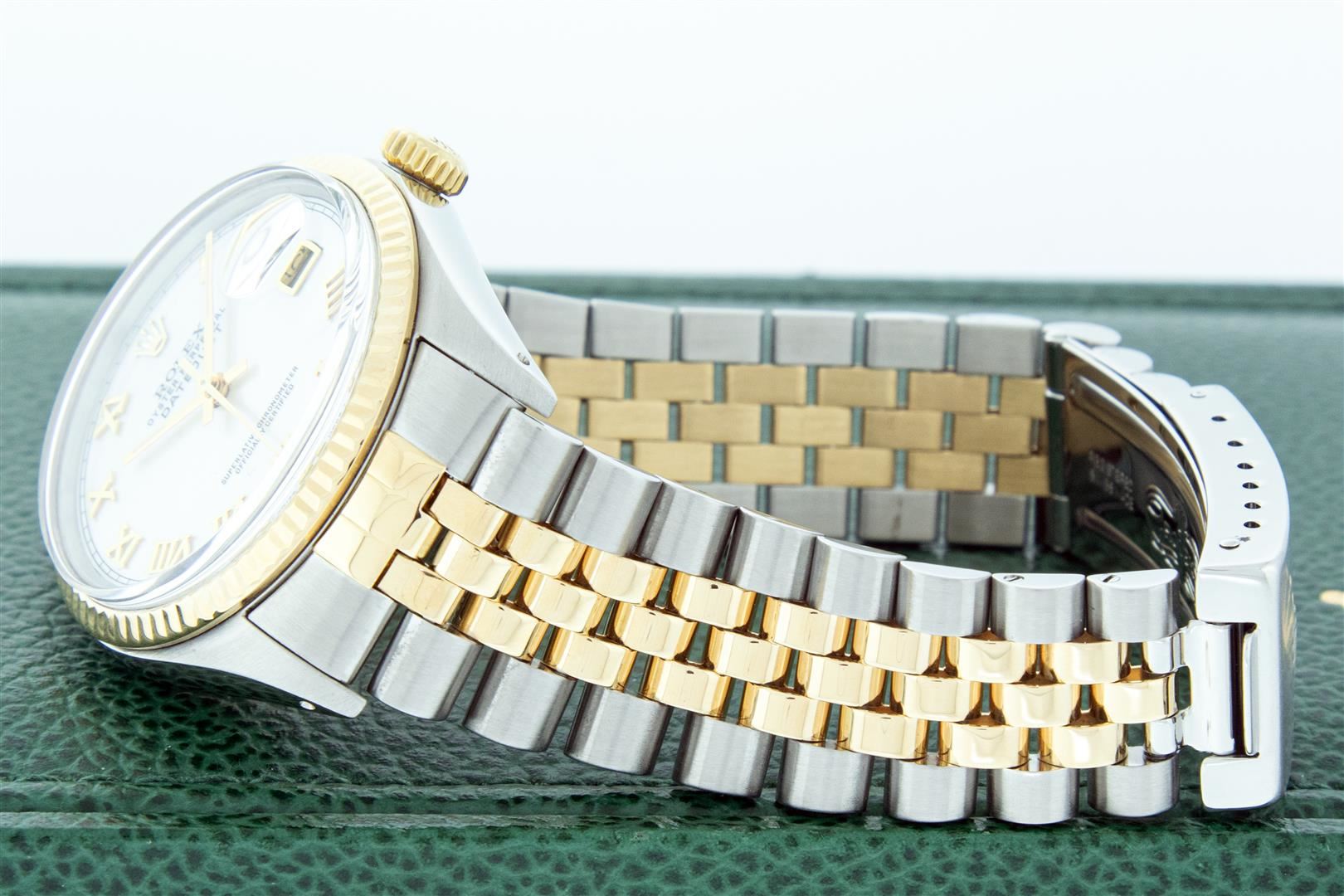 One Mens Pre Owned Yellow Gold Two Tone Rolex Datejust Polished, Serviced & Electronically Tested, Rolex Yellow Gold & Stainless Steel Case: 36mm, Rolex Yellow Gold Crown, Rolex Bezel: Yellow Gold Fluted Bezel. Custom Crystal: New Acrylic Cyclops Lens. Custom Hands: New Luminescent Hands. Rolex Movement: Automatic Winding Movement. Custom Dial: Refinished To Mother Of Pearl Roman With Square Track. Date Window: 3 O'Clock Position Date Display, Quickset, Model: Datejust. Condition: G-6 Extra Fine. Rolex Bracelet: Two Tone Yellow Gold & Stainless Steel Jubilee Band. Bright Polish. 7.0 Inch Length, Adjustable. Standard Clasp, With Rolex Logo. This Watch Has Been Serviced Time Tested And Is In Excellent Condition It Is Free Of All Scratches And Dents.