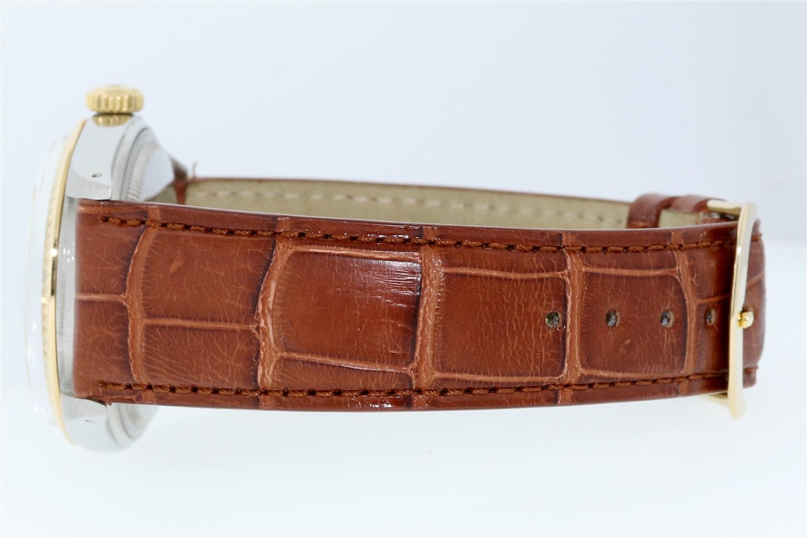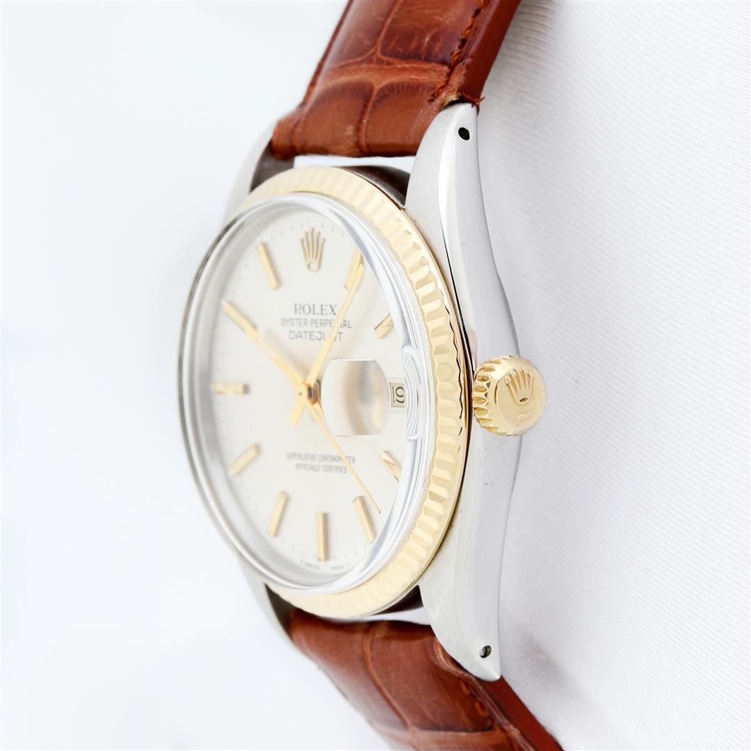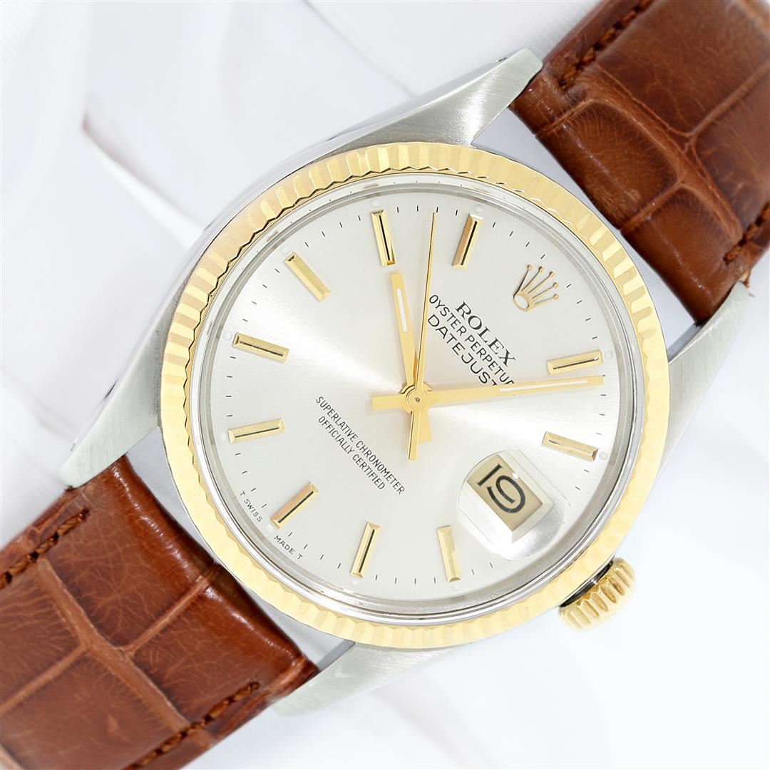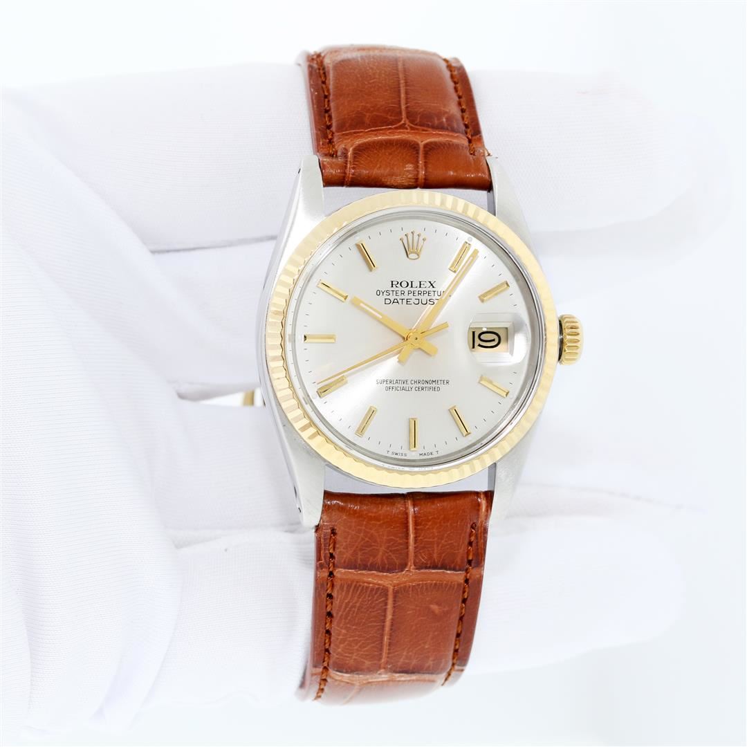 One Mens Pre Owned Two Tone Yellow Gold And Stainless Steel Rolex Datejust Polished, Serviced & Electronically Tested, Rolex Yellow Gold & Stainless Steel Case: 36mm, Rolex Yellow Gold Crown, Rolex Bezel: Yellow Gold Fluted Bezel. Custom Crystal: New Plastic With Date Window. Custom Hands: New Hands. Rolex Movement: Automatic Winding Movement. Rolex Dial: Silver With Index Hour Markers. Date Window: 3 O'Clock Position Date Display, Quickset, Model: Datejust. Condition: G-6 Extra Fine. Custom Band: New Brown Leather Band 7.0 Inch Length with New Custom Pin Buckle Clasp. This Watch Has Been Serviced And Polished It Is Free Of All Scratches And Dents.