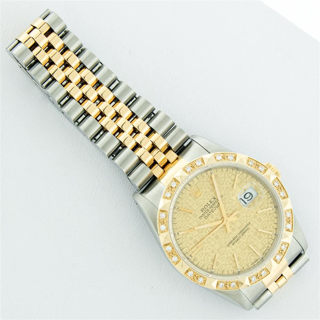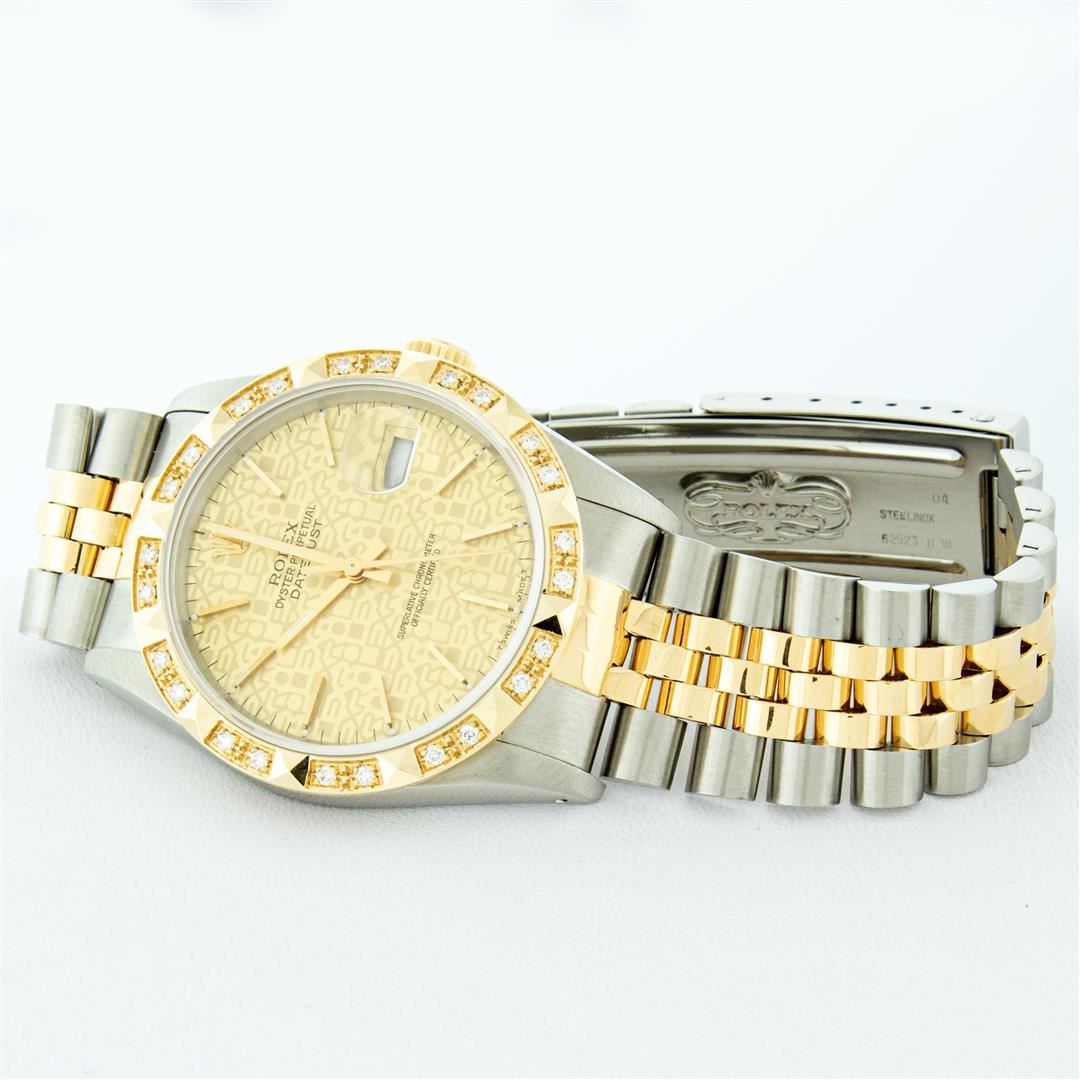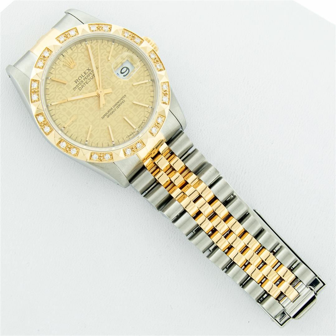One Mens Quickset Pre Owned Two Tone 14K Yellow Gold And Stainless Steel Datejust Polished, Serviced & Electronically Tested, Rolex Yellow Gold & Stainless Steel Case: 36mm, Rolex 14K Yellow Gold Crown, Custom Bezel: New 18K Yellow Gold Pyramid Diamond Bezel, Diamond Count: 24 Diamonds, Total Weight.75 Carat, Clarity: SI-VS, Color: G to H. Custom Crystal: New Sapphire With Magnified Date Window. Custom Hands: New Luminecent Hands. Rolex Movement: Automatic Winding Movement 3035. Rolex Dial: Champagne Jubilee Dial With Index Hour Markers and Small Track With Lumi Dots. Date Window: 3 O'Clock Position Date Display, Quickset, Model: Datejust. Condition: G-6 Extra Fine. Rolex Bracelet: Two Tone 14K Yellow Gold & Stainless Steel Jubilee Band. Bright Polish. 7.0 Inch Length, Adjustable. Standard Clasp, With Rolex Logo. This Watch Has Been Serviced Time Tested And Is In Excellent Condition It Is Free Of All Scratches And Dents.