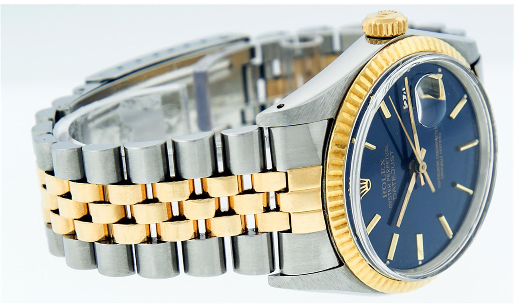One Mens Rolex Pre Owned Two Tone 14K Yellow Gold And Stainless Steel Datejust Polished, Serviced & Electronically Tested, Rolex Yellow Gold & Stainless Steel Case: 36mm, Rolex Yellow Gold Crown, Rolex Bezel: 14K Yellow Gold Fluted Bezel. Custom Crystal: New Acrylic With Magnified Date Window. Rolex Hands: Luminecent Hands. Rolex Movement: Automatic Winding Movement 3035. Rolex Dial: Blue Index Dial With Index Track. Date Window: 3 O'Clock Position Date Display, Quickset, Model: Datejust. Condition: G-6 Extra Fine. Rolex Bracelet: Two Tone 14K Yellow Gold & Stainless Steel Jubilee Band. Bright Polish. 7.0 Inch Length, Adjustable. Standard Clasp, With Rolex Logo. This Watch Has Been Serviced Time Tested And Is In Excellent Condition It Is Free Of All Scratches And Dents.