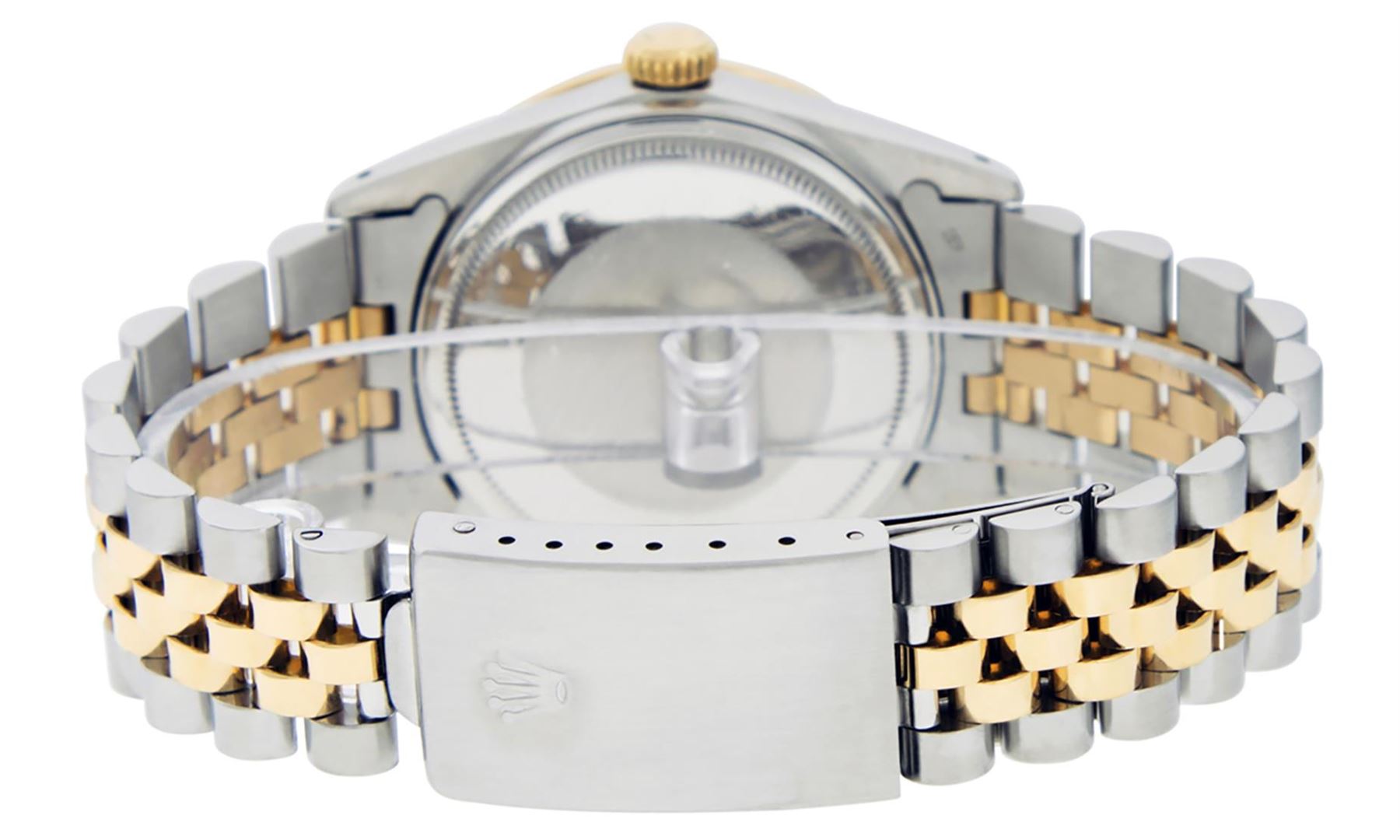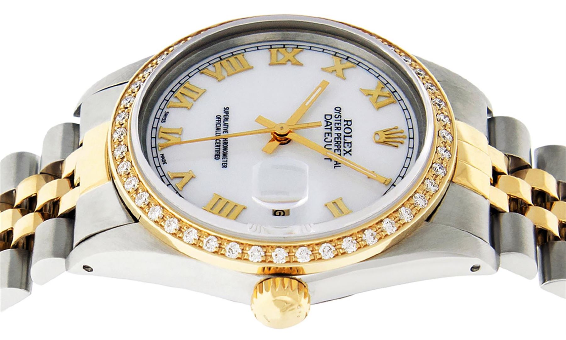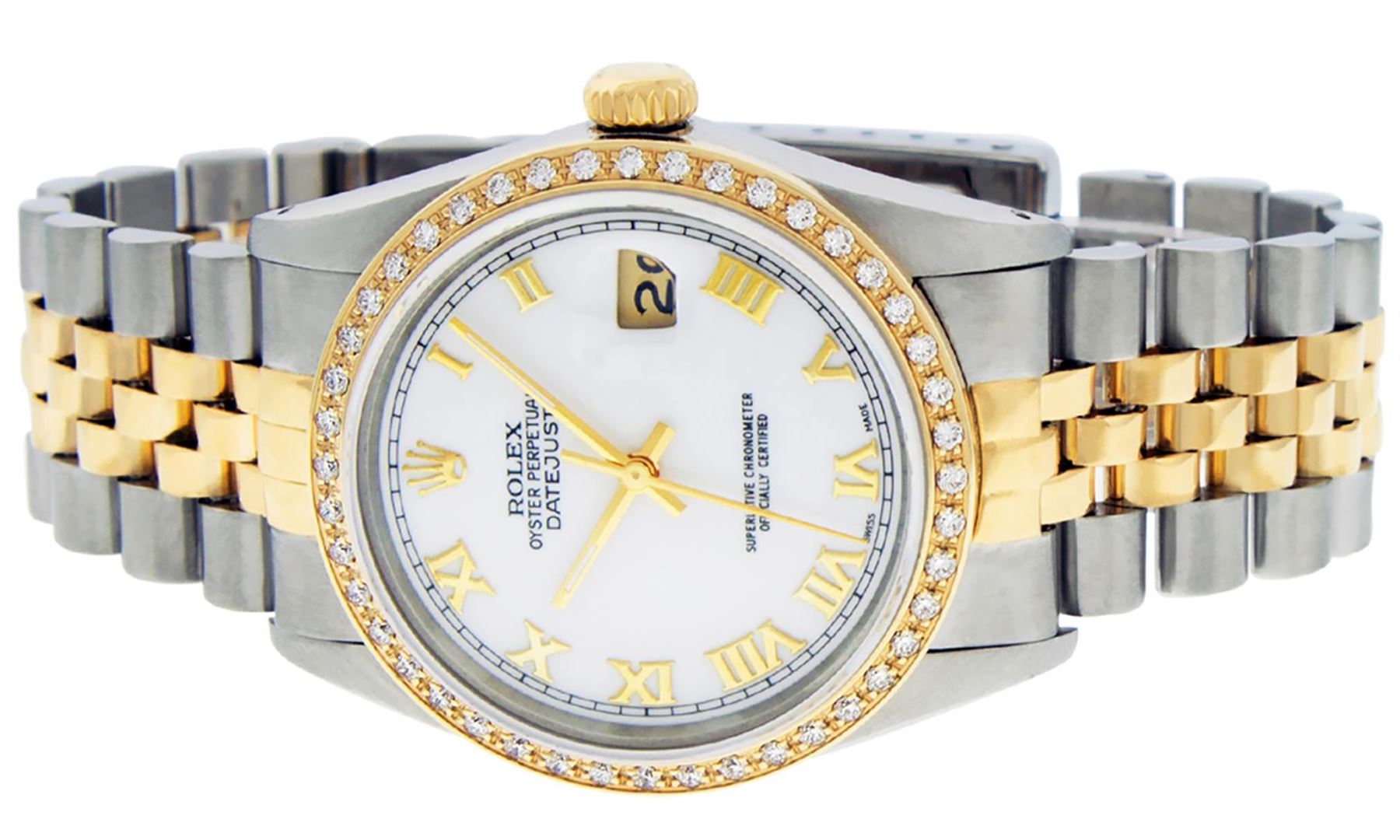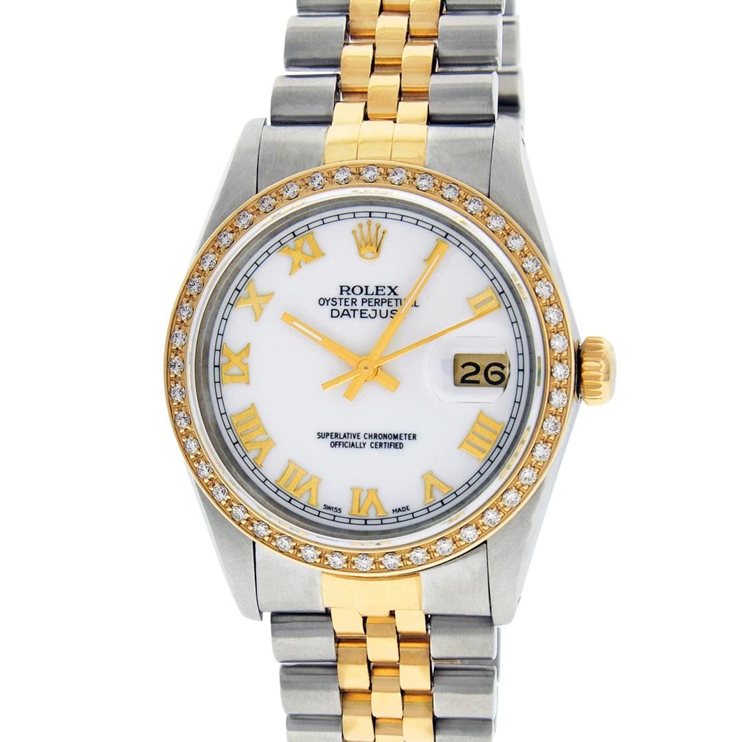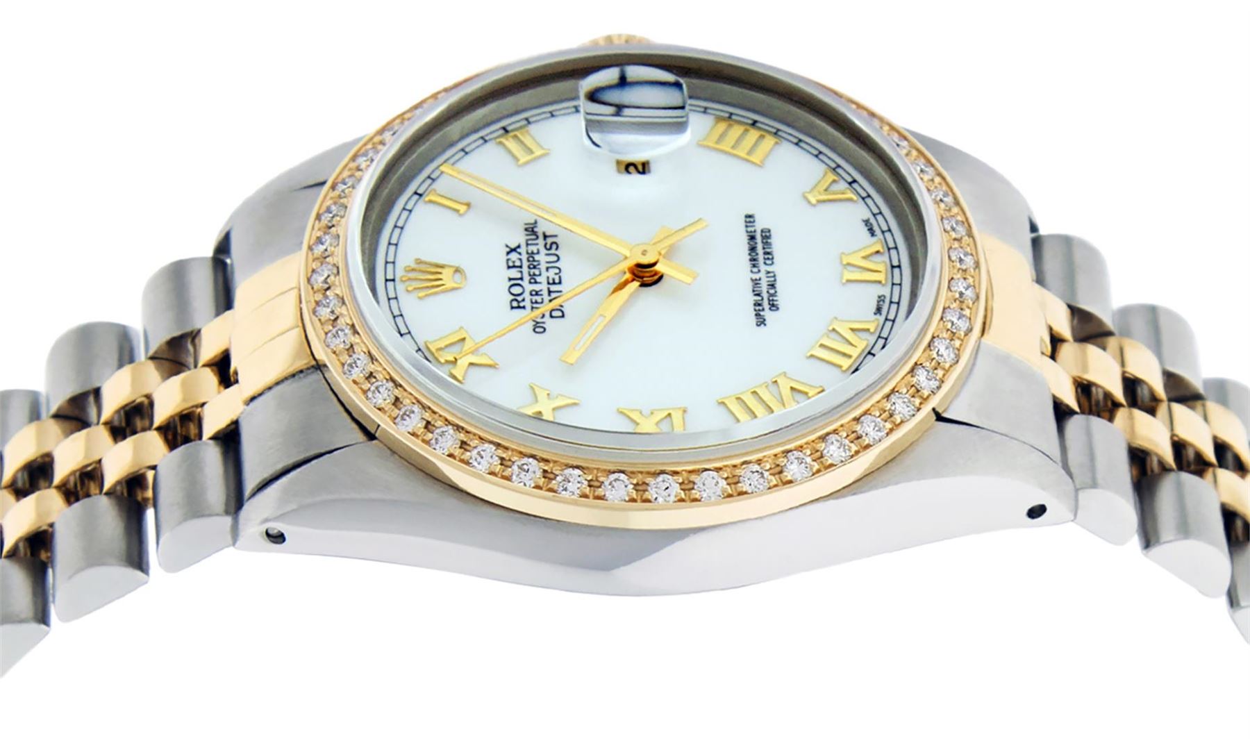 One Mens Rolex Pre Owned 14K Yellow Gold and Stainless Steel Two Tone Datejust Polished, Serviced & Electronically Tested, Rolex Yellow Gold & Stainless Steel Case: 36mm, Rolex Yellow Gold Crown, Custom Bezel: New 18K Yellow Gold Beadset Diamond Bezel, Diamond Count: 44 Diamonds, Total Weight 1.00 Carat, Clarity: SI-VS, Color: G to H. Custom Crystal: New Sapphire With Magnified Lens. Custom Hands: New Luminecent Hands. Rolex Movement: Automatic Winding Movement 3035. Rolex Dial: White Roman With Square Track. Date Window: 3 O'Clock Position Date Display, Quickset, Model: Condition: G-6 Extra Fine. Rolex Bracelet: Two Tone 14K Yellow Gold & Stainless Steel Jubilee Band. Bright Polish. 7.0 Inch Length, Adjustable. Standard Clasp, With Rolex Logo. This Watch Has Been Serviced Time Tested And Is In Excellent Condition It Is Free Of All Scratches And Dents.