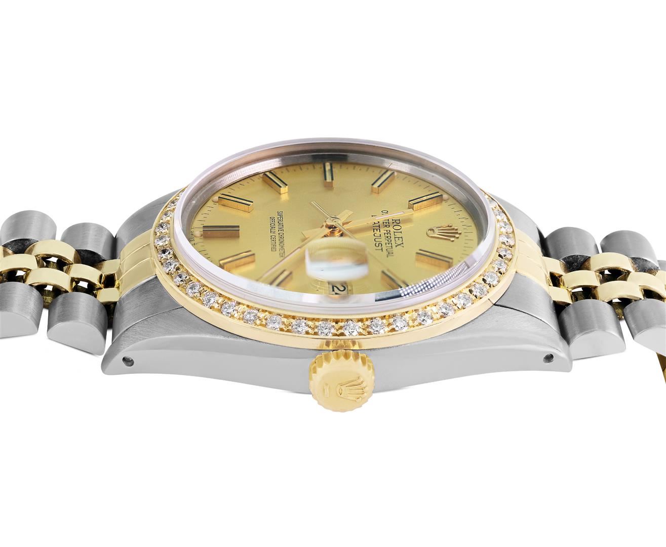 One Mens Pre Owned Yellow Gold And Steel Two Tone Rolex Datejust Polished, Serviced & Electronically Tested, Rolex Yellow Gold & Stainless Steel Case: 36mm, Rolex Yellow Gold Crown, Custom Bezel: New 18K Yellow Gold Beadset Diamond Bezel, Diamond Count: 44 Diamonds, Clarity: SI-VS, Color: G to H. Custom Crystal: New Sapphire With Magnified Date Window. Custom Hands: New Luminecent Hands. Rolex Movement: Automatic Winding Movement 3035. Rolex Dial: Champagne Dial With Index Hour Markers and Dash Track With Lumi Dots. Date Window: 3 O'Clock Position Date Display, Quickset, Model: Quickset Datejust. Condition: G-6 Extra Fine. Rolex Bracelet: Two Tone Yellow Gold & Stainless Steel Jubilee Band. Bright Polish. 7.0 Inch Length, Adjustable. Fold Clasp, With Rolex Logo. This Watch Has Been Serviced Time Tested And Is In Excellent Condition It Is Free Of All Scratches And Dents. This Watch Comes With A Rolex Box.