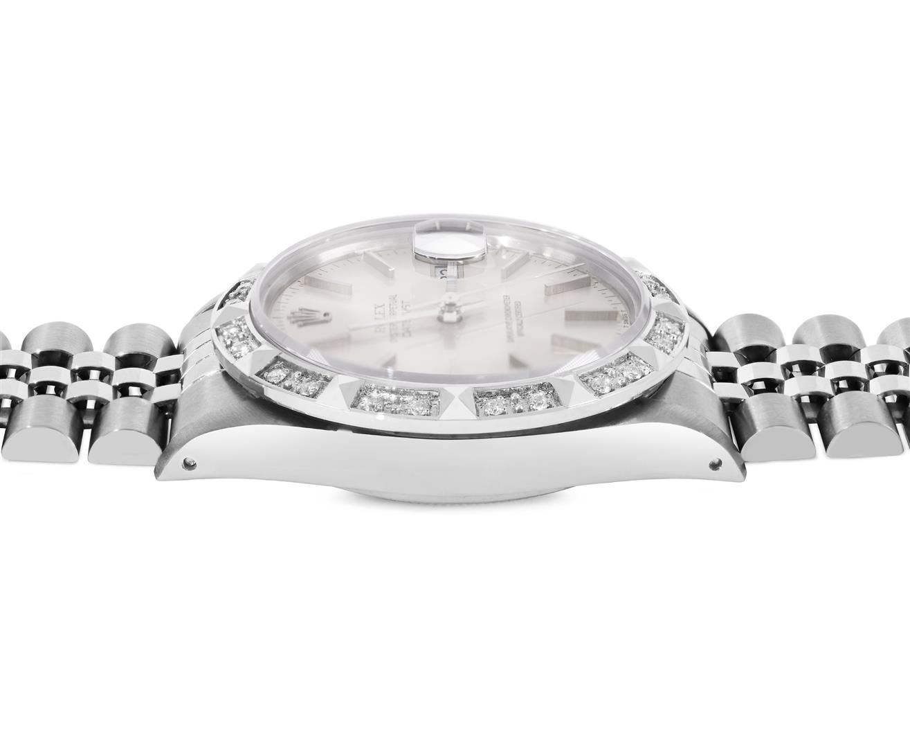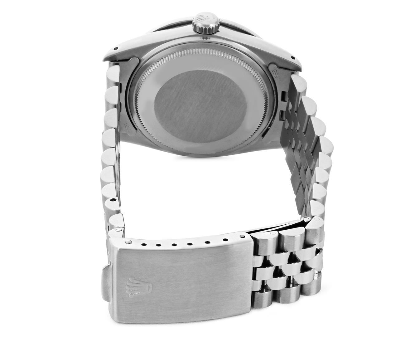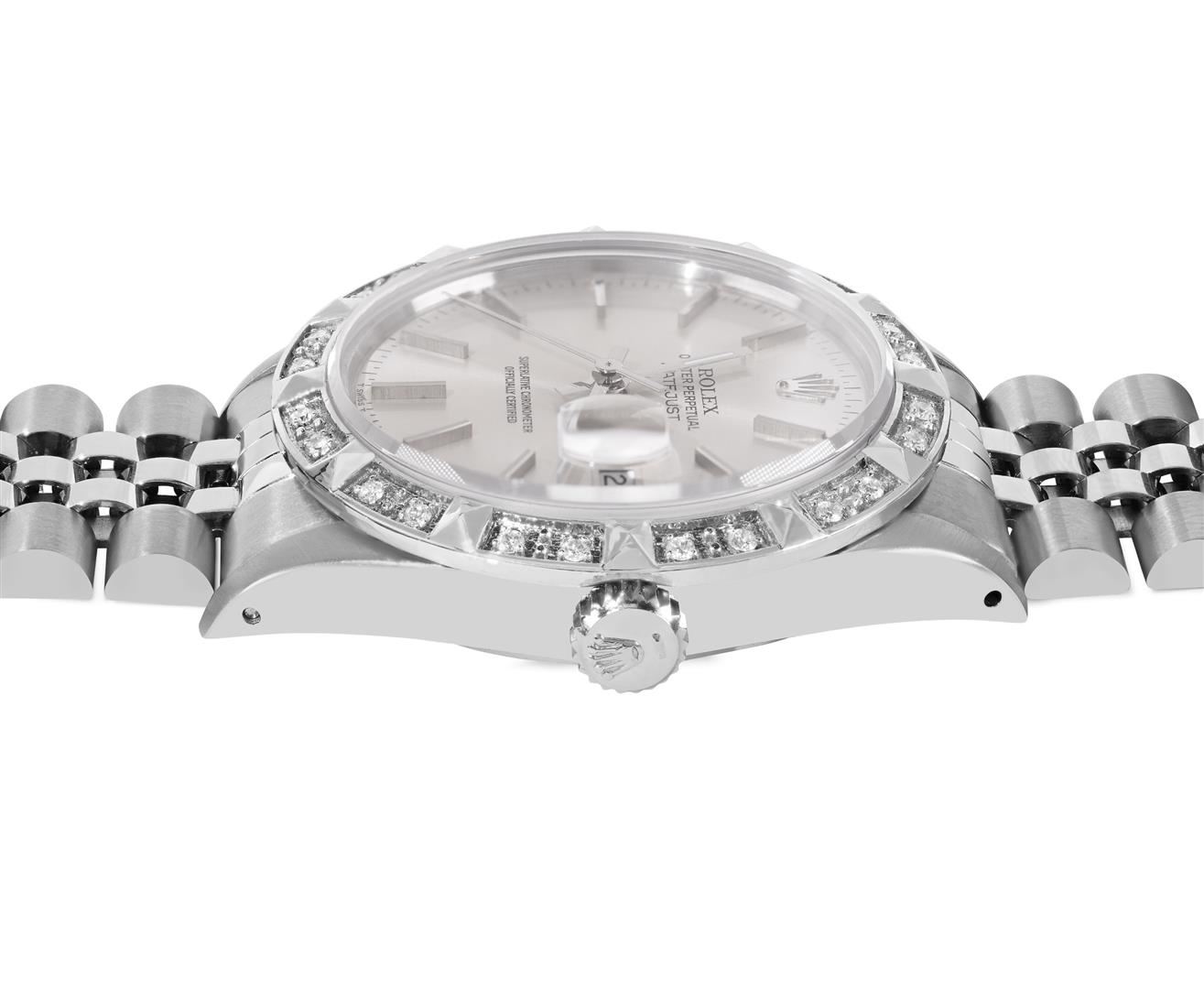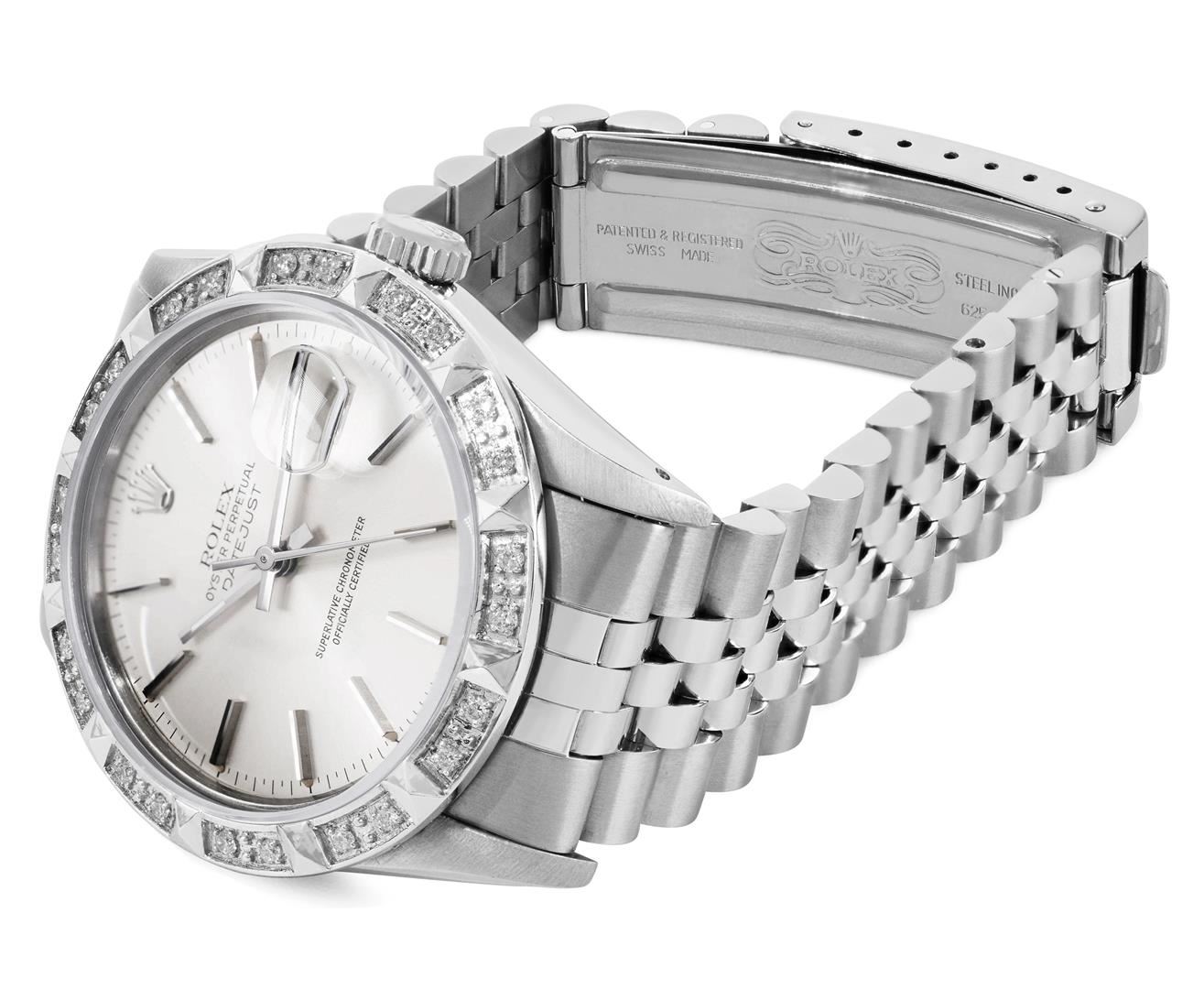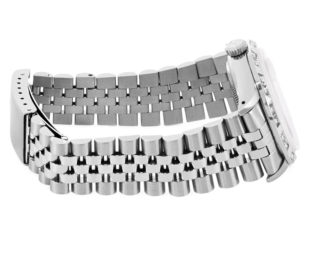 One Mens Pre Owned Rolex Stainless Steel Datejust Polished Bright with Satin Finish, Serviced & Electronically Tested, Rolex Stainless Steel Case: 36mm, Rolex Stainless Steel Crown, Custom Bezel: New 18K White Gold Pyramid Bezel, Diamond Count: 24 Diamond on Bezel. Custom Crystal: New Sapphire With Magnified Date Window. Rolex Movement: Automatic Winding Movement Caliber 3035. Rolex Dial: Silver Index Dial With Open Track and Lumi Dots. Custom Hands: New Lumi Hands. Date Window: 3 O'Clock Position Date Display, Quickset, Model: Quickset Datejust. Condition: G-6 Extra Fine. Rolex Bracelet: Stainless Steel Jubilee Band. Bright Polish & Satin Finish. 7.0 Inch Length, Adjustable. Fold Clasp, With Rolex Logo. This Pre Owned Watch Has Been Serviced Time Tested And Is In Excellent Condition It Is Free Of All Scratches And Dents. This Watch Comes With A Rolex Box.