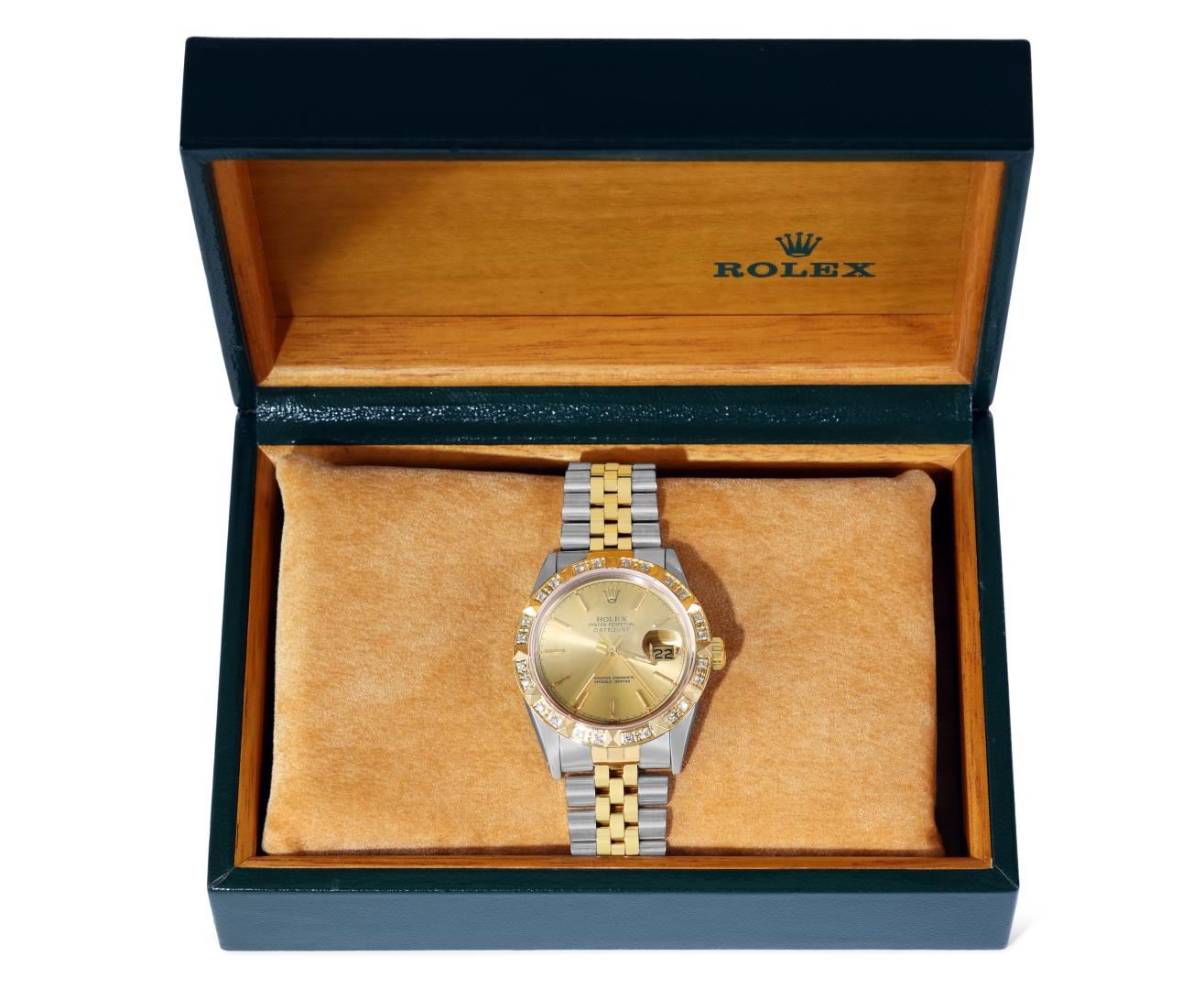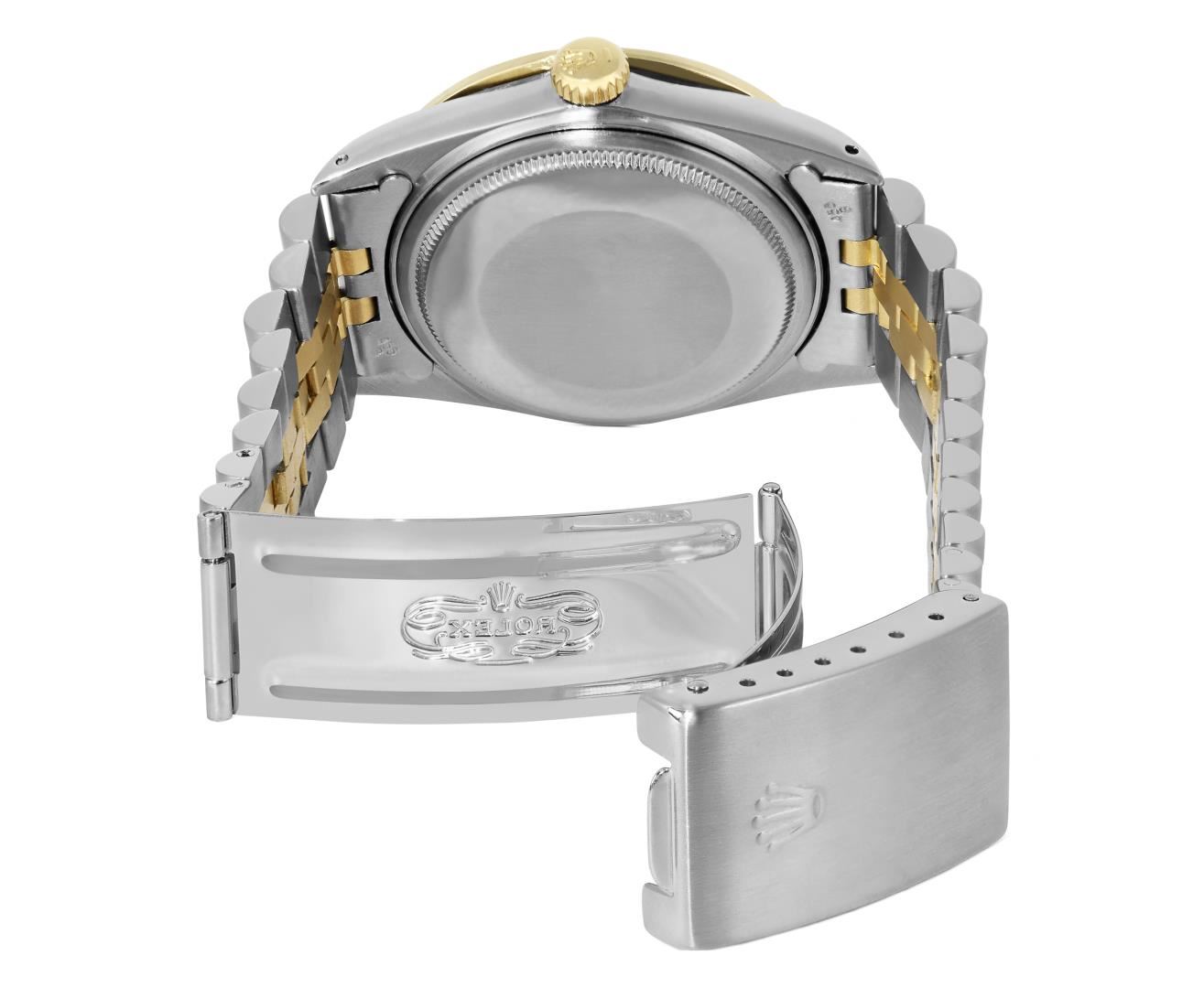 One Mens Pre Owned Yellow Gold Two Tone Rolex Datejust Polished, Serviced And Electronically Tested, Rolex Yellow Gold And Stainless Steel Case: 36mm, Rolex Yellow Gold Crown, Custom Bezel: New 18K Yellow Gold Pyramid Diamond Bezel, Diamond Count: 24 Diamonds. Custom Crystal: New Sapphire With Magnified Date Window. Custom Hands: New Luminecent Hands. Rolex Movement: Automatic Winding Movement 3035. Rolex Dial: Champagne Dial With Index Hour Markers and Small Track With Lumi Dots. Date Window: 3 O'Clock Position Date Display, Quickset, Model: Quickset Datejust. Condition: G-6 Extra Fine. Rolex Bracelet: Two Tone Yellow Gold And Stainless Steel Jubilee Band. Bright Polish. 7.0 Inch Length, Adjustable. Standard Clasp, With Rolex Logo. This Watch Has Been Serviced Time Tested And Is In Excellent Condition It Is Free Of All Scratches And Dents. This Watch Comes With A Rolex Box.