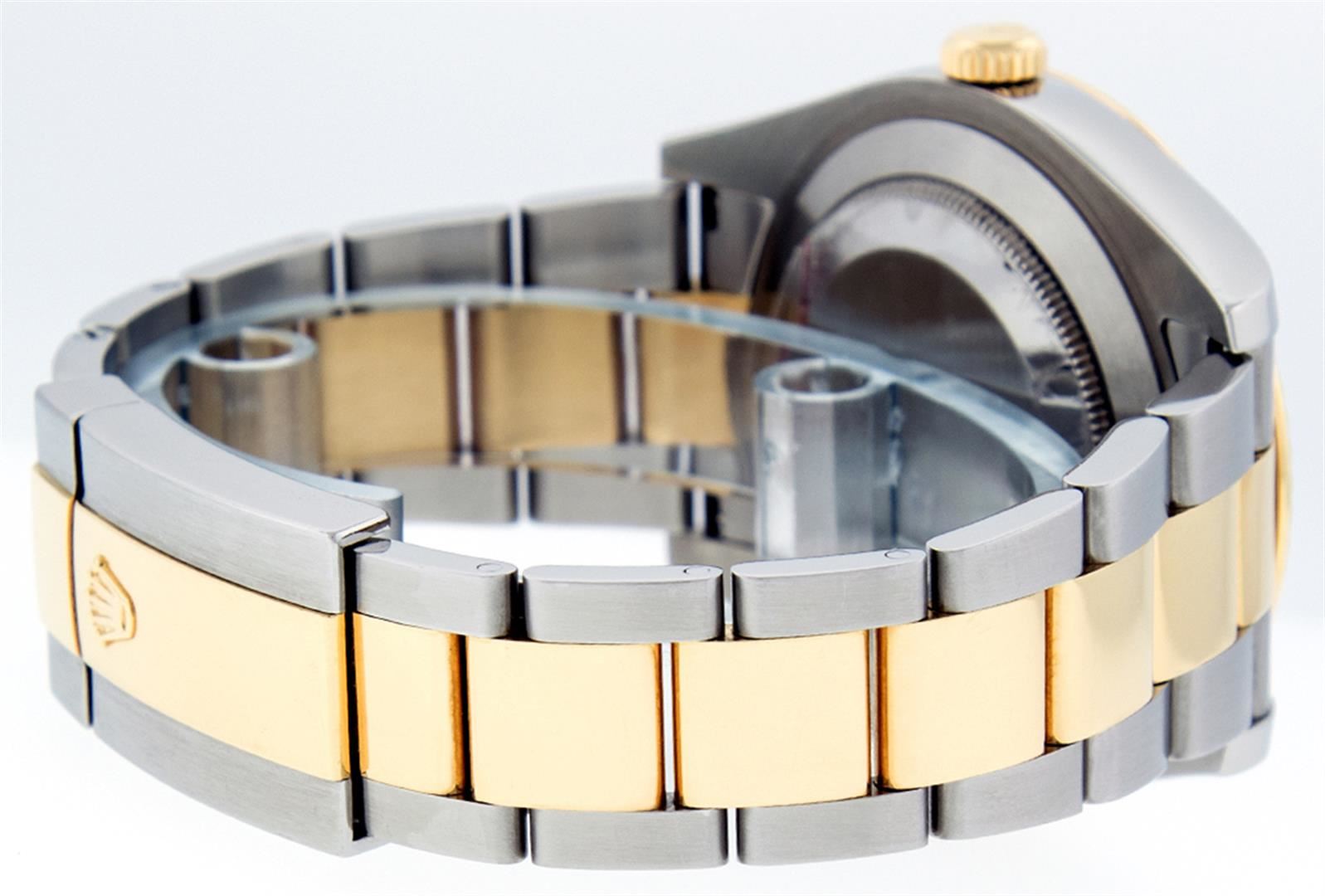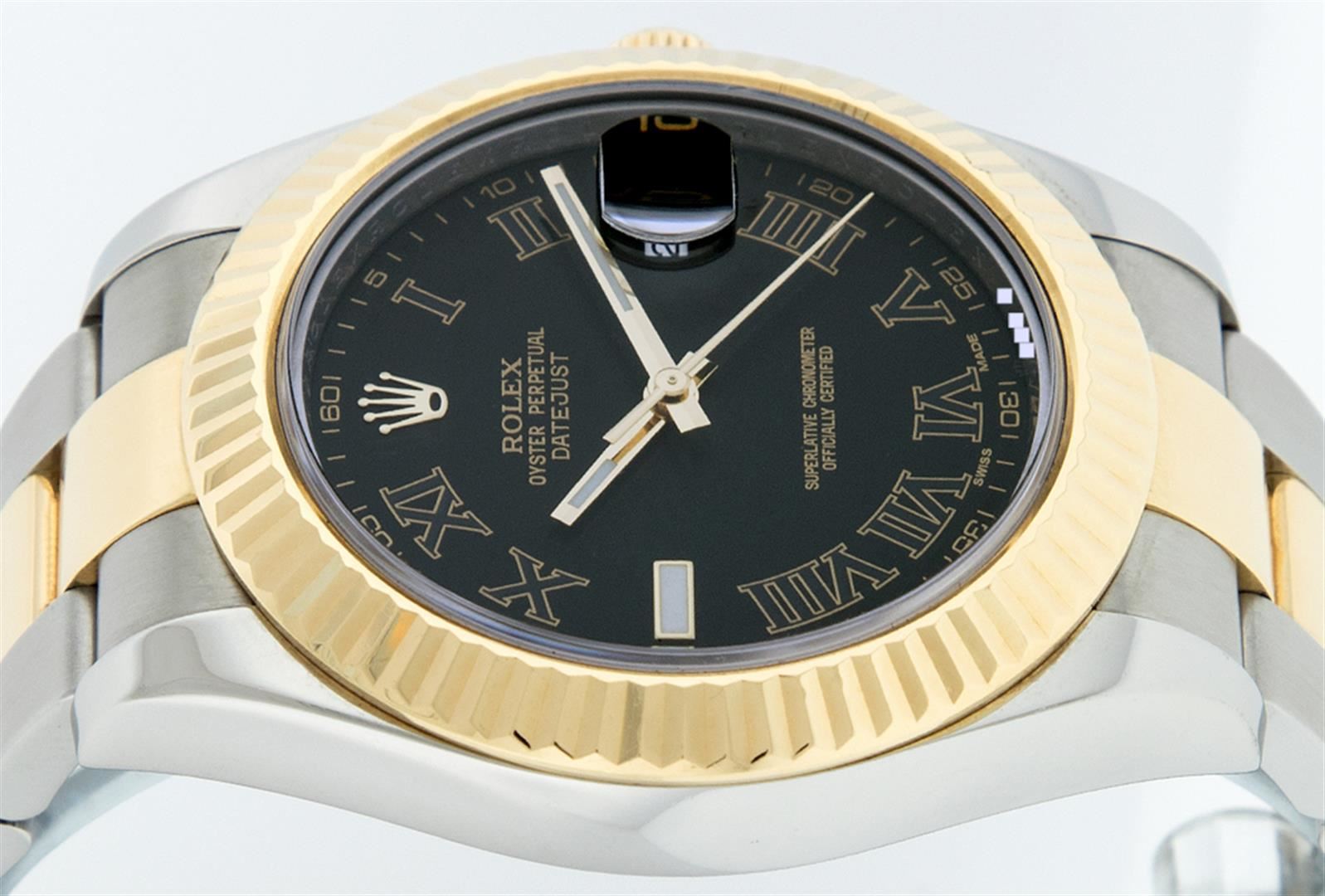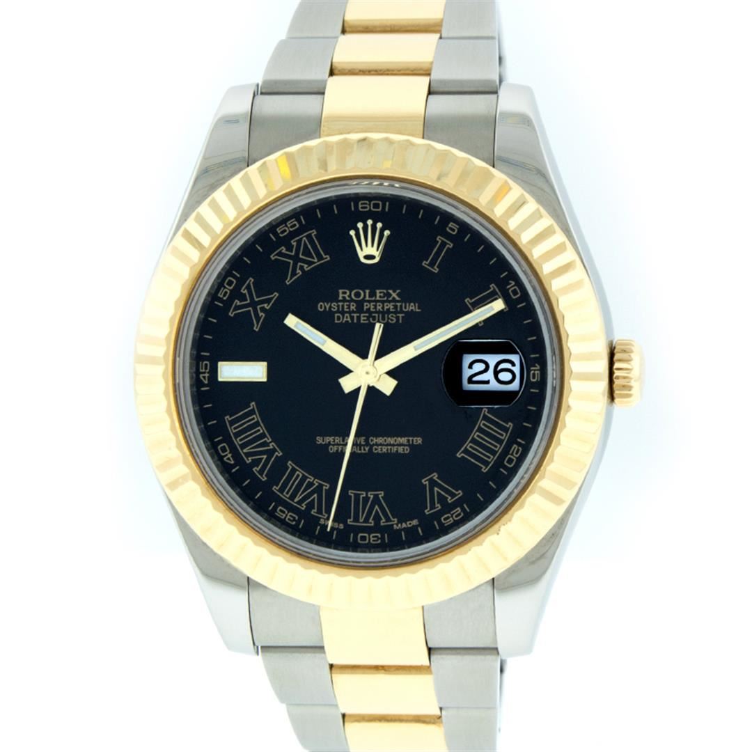 One Mens Rolex Datejust 2 41MM Polished, Serviced & Electronically Tested, Stainless Steel Case: 41mm, Rolex Yellow Gold Crown, Rolex Bezel: 18K Yellow Gold Fluted Bezel, Rolex Crystal: Sapphire With Magnified Date Window. Hands: Luminescent Hands. Rolex Movement: Automatic Winding Movement 3136. Rolex Dial: Black Roman With Dash Track, Date Window: 3 O'Clock Position Date Display, Quickset, Model: Datejust 2 116333. Condition: G-6 Extra Fine, Rolex Bracelet: 18K Yellow Gold And Stainless Oyster Band. Bright Polish & Satin Finish. 7.0 Inch Length, Adjustable. Standard Clasp, With Rolex Logo. This Watch Has Been Serviced Time Tested And Is In Excellent Condition It Is Free Of All Scratches And Dents.