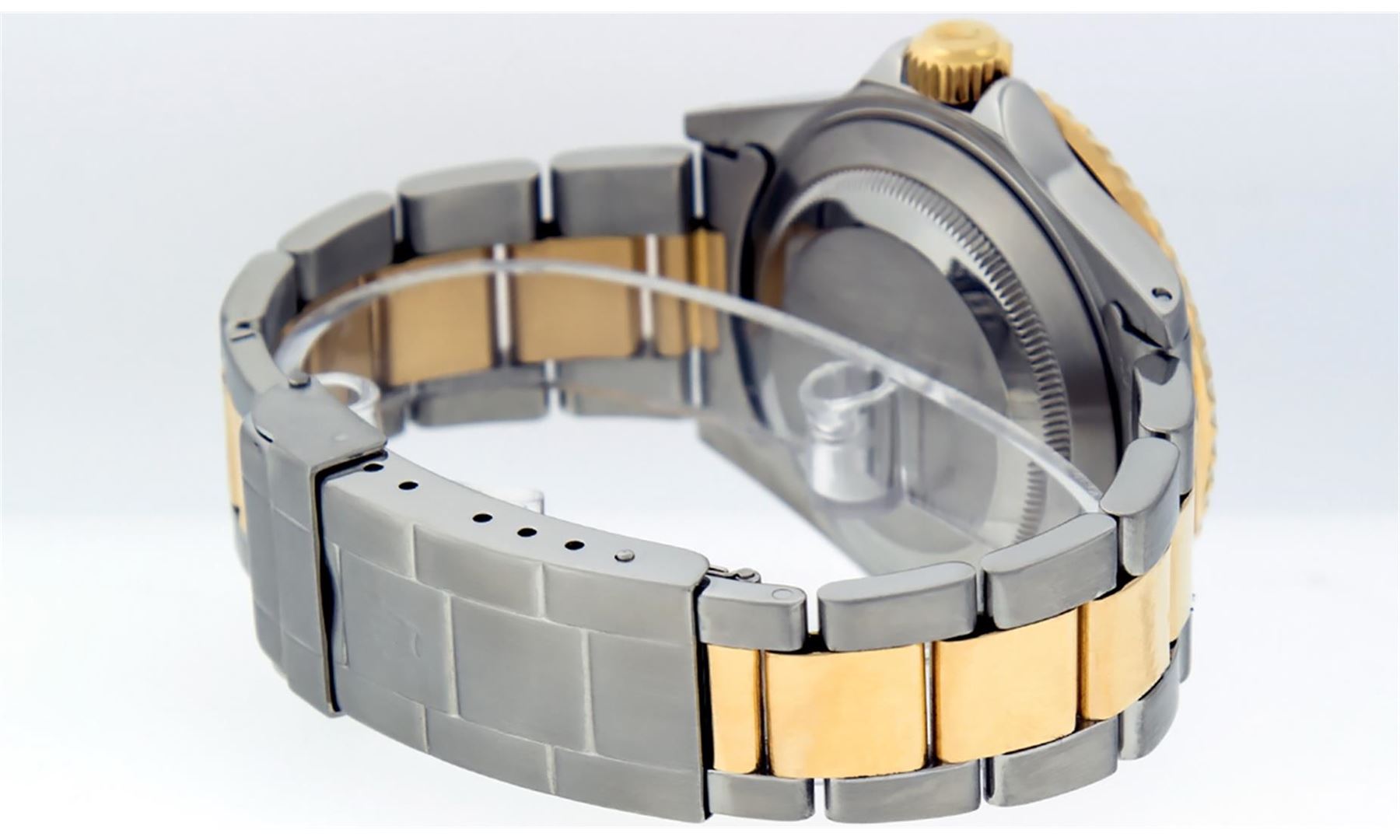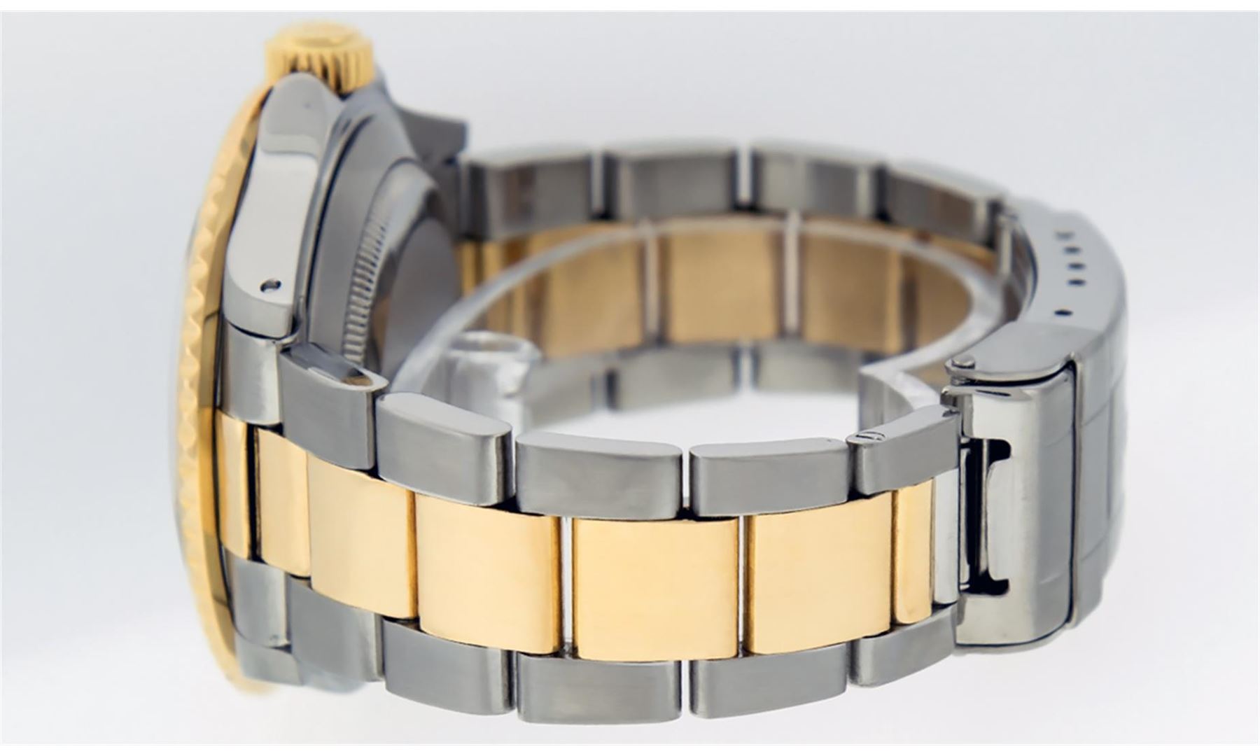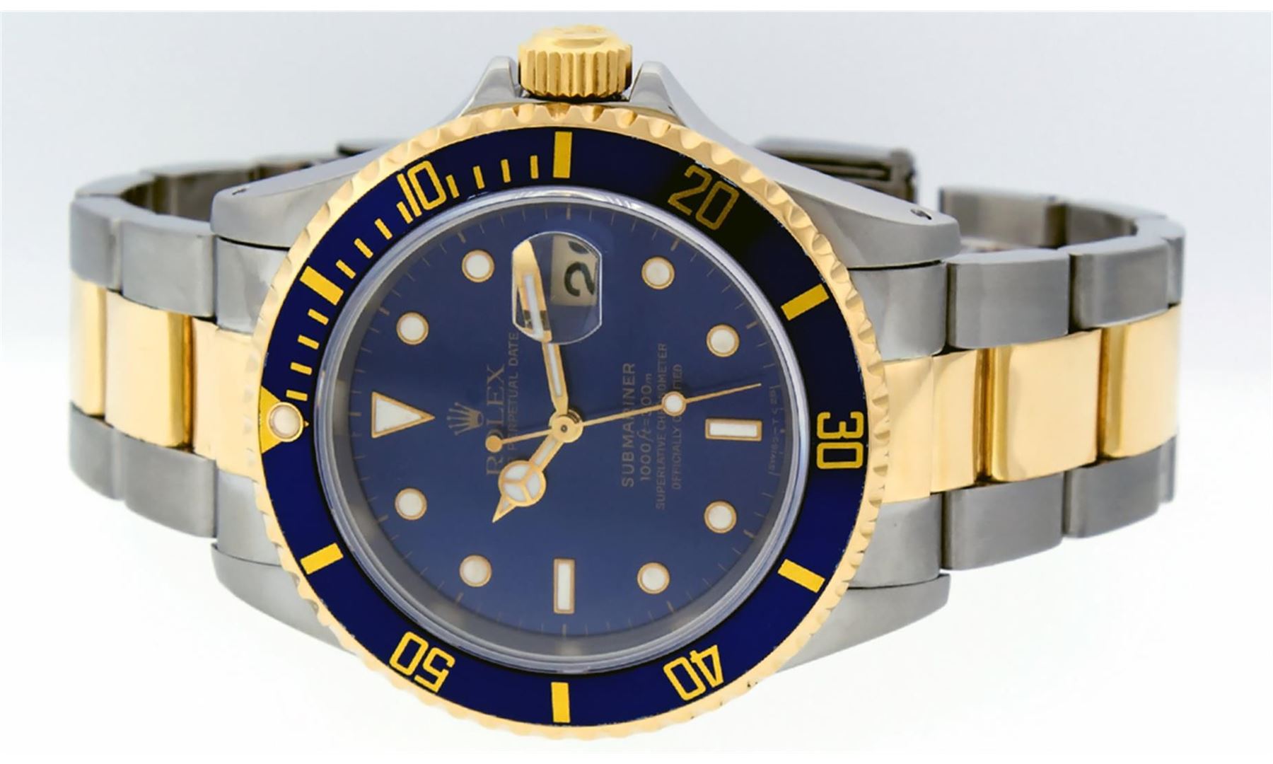 One Mens Pre Owned Rolex Two Tone Yellow Gold And Stainless Steel Submariner With Date Polished, Serviced & Electronically Tested, Rolex Stainless Steel Case: 40mm, Rolex 18K Yellow Gold Crown, Rolex Bezel: 18K Yellow Gold Rotatable Bezel With Blue Insert. Crystal: Sapphire With Magnified Date Window. Rolex Movement: Automatic Winding Movement Caliber 3135. Rolex Dial: Blue Submariner Dial with Luminous Index Hour Markers. Date Window: 3 O'Clock Position Date Display, Model: Submariner, Quickset, Condition: G-6 Extra Fine. Rolex Bracelet: 18K Yellow Gold And Stainless Steel Oyster Band. Bright Polish & Satin Finish. 7.0 Inch Length, Adjustable. Standard Clasp, With Rolex Logo.