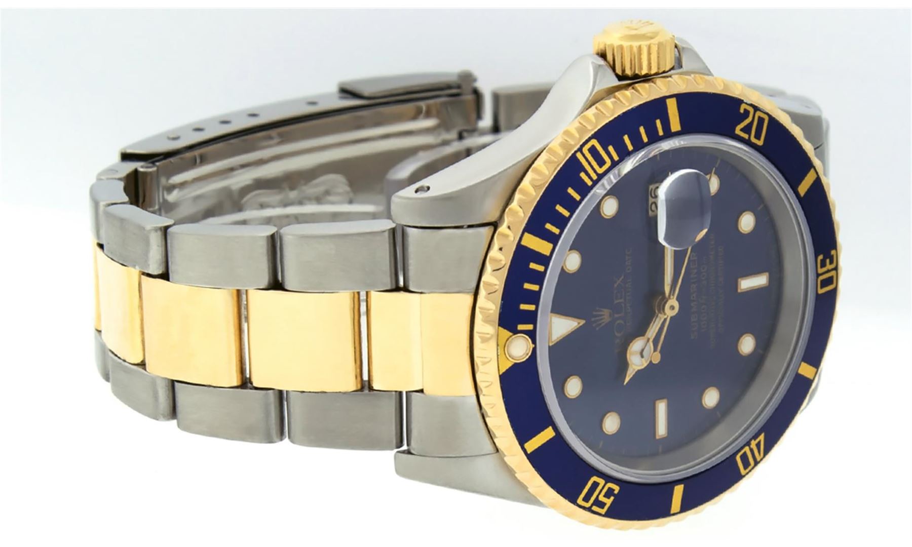 One Mens Pre Owned Rolex Two Tone Yellow Gold And Stainless Steel Submariner With Date Polished, Serviced & Electronically Tested, Rolex Stainless Steel Case: 40mm, Rolex 18K Yellow Gold Crown, Rolex Bezel: 18K Yellow Gold Rotatable Bezel With Blue Insert. Crystal: Sapphire With Magnified Date Window. Rolex Movement: Automatic Winding Movement Caliber 3135. Rolex Dial: Blue Submariner Dial with Luminous Index Hour Markers. Date Window: 3 O'Clock Position Date Display, Model: Submariner, Quickset, Condition: G-6 Extra Fine. Rolex Bracelet: 18K Yellow Gold And Stainless Steel Oyster Band. Bright Polish & Satin Finish. 7.0 Inch Length, Adjustable. Standard Clasp, With Rolex Logo.