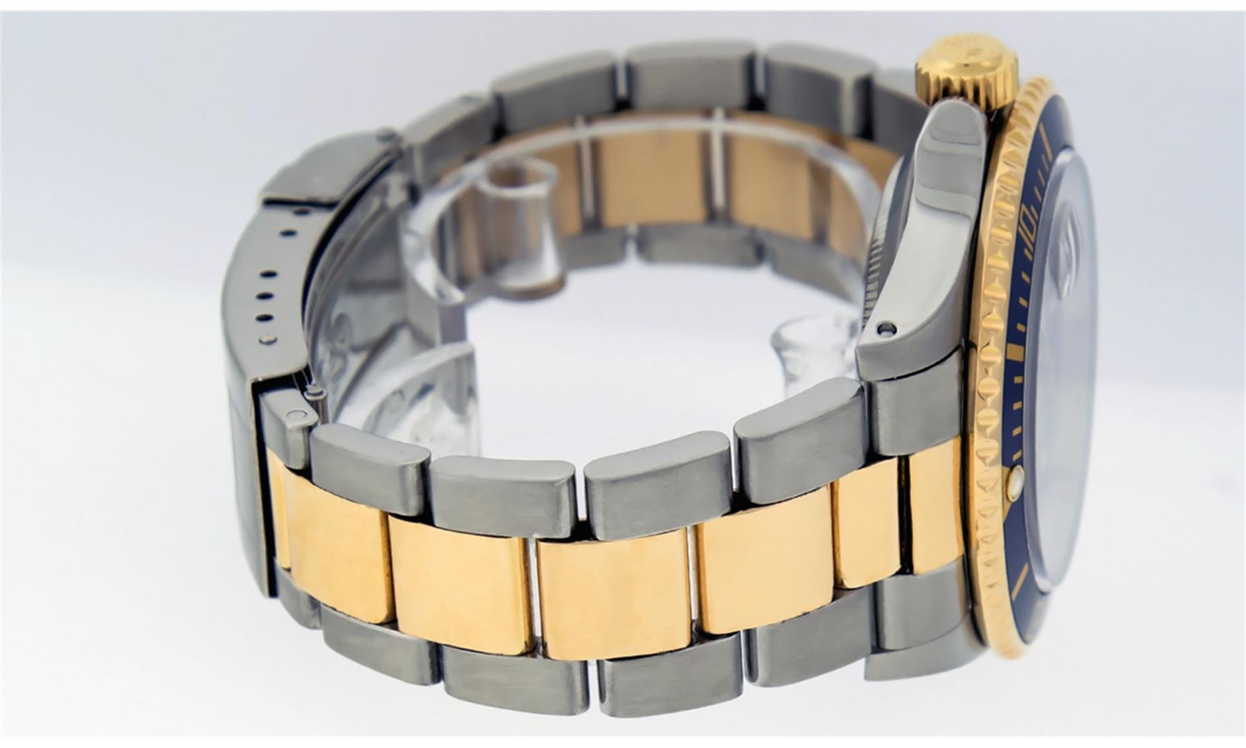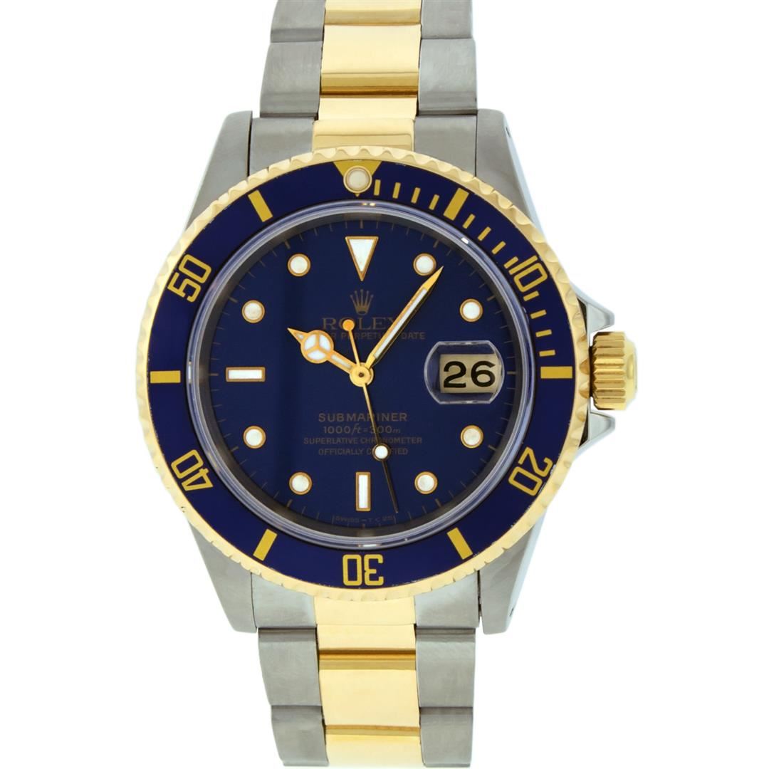 One Mens Pre Owned Rolex Two Tone Yellow Gold And Stainless Steel Submariner With Date Polished, Serviced & Electronically Tested, Rolex Stainless Steel Case: 40mm, Rolex 18K Yellow Gold Crown, Rolex Bezel: 18K Yellow Gold Rotatable Bezel With Blue Insert. Crystal: Sapphire With Magnified Date Window. Rolex Movement: Automatic Winding Movement Caliber 3135. Rolex Dial: Blue Submariner Dial with Luminous Index Hour Markers. Date Window: 3 O'Clock Position Date Display, Model: Submariner, Quickset, Condition: G-6 Extra Fine. Rolex Bracelet: 18K Yellow Gold And Stainless Steel Oyster Band. Bright Polish & Satin Finish. 7.0 Inch Length, Adjustable. Standard Clasp, With Rolex Logo.