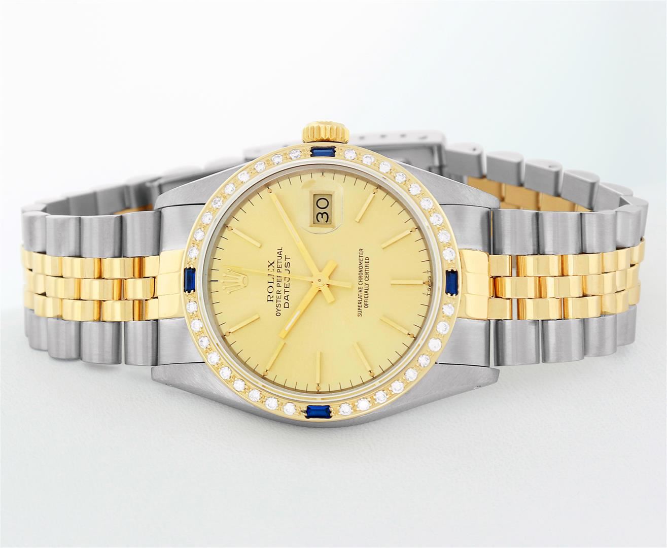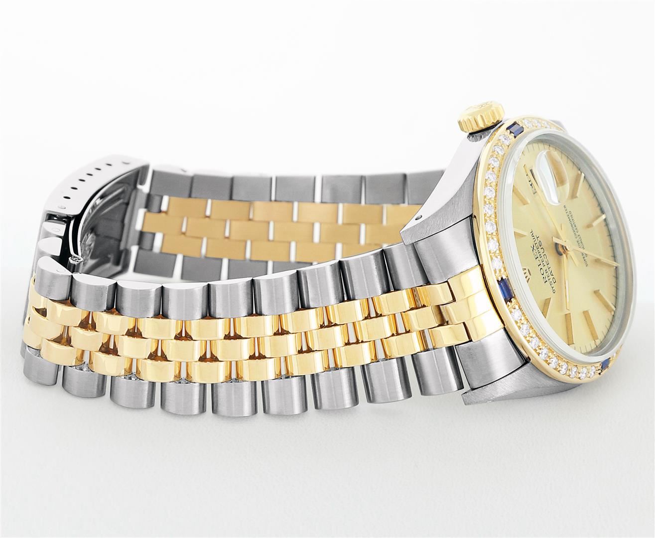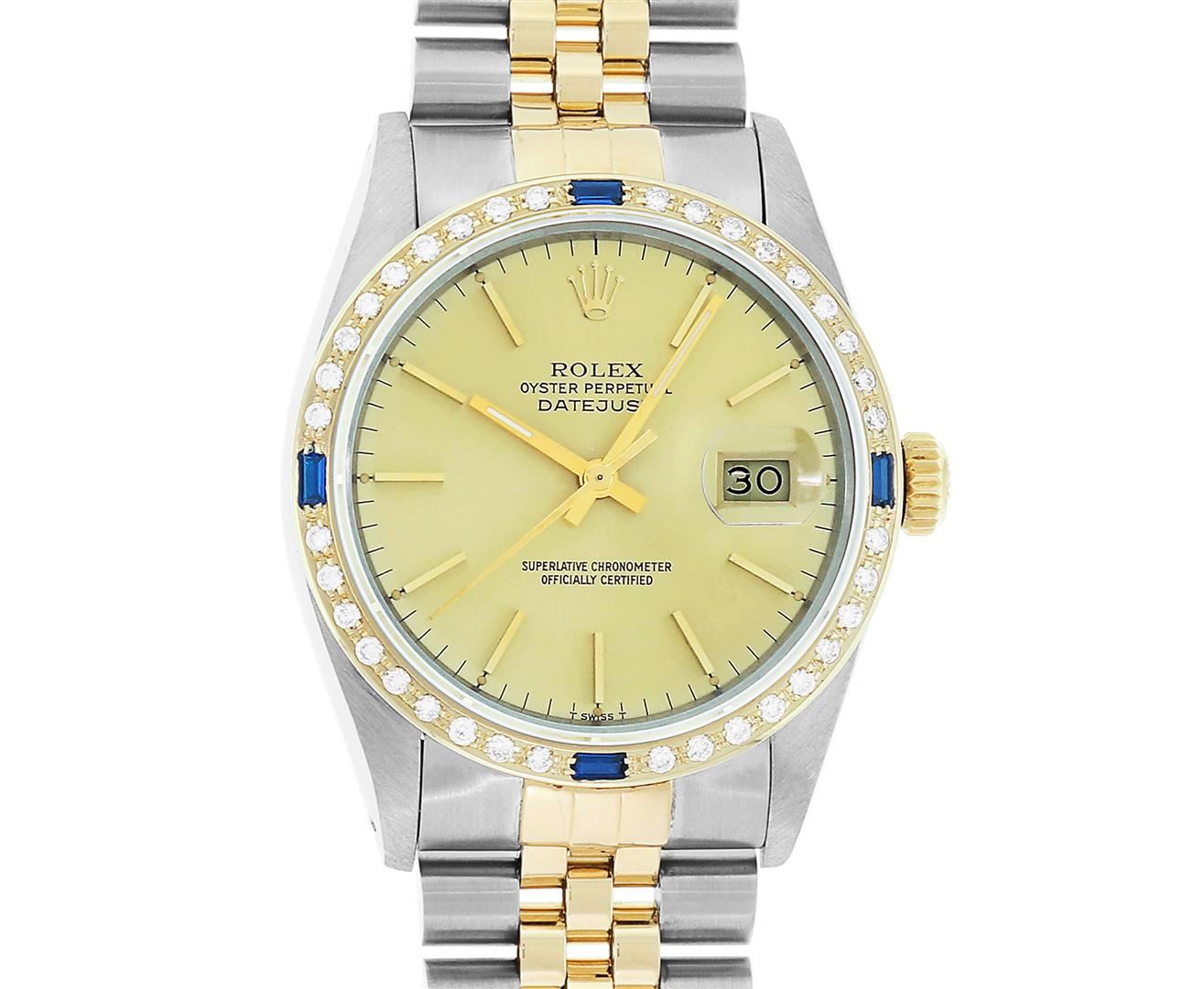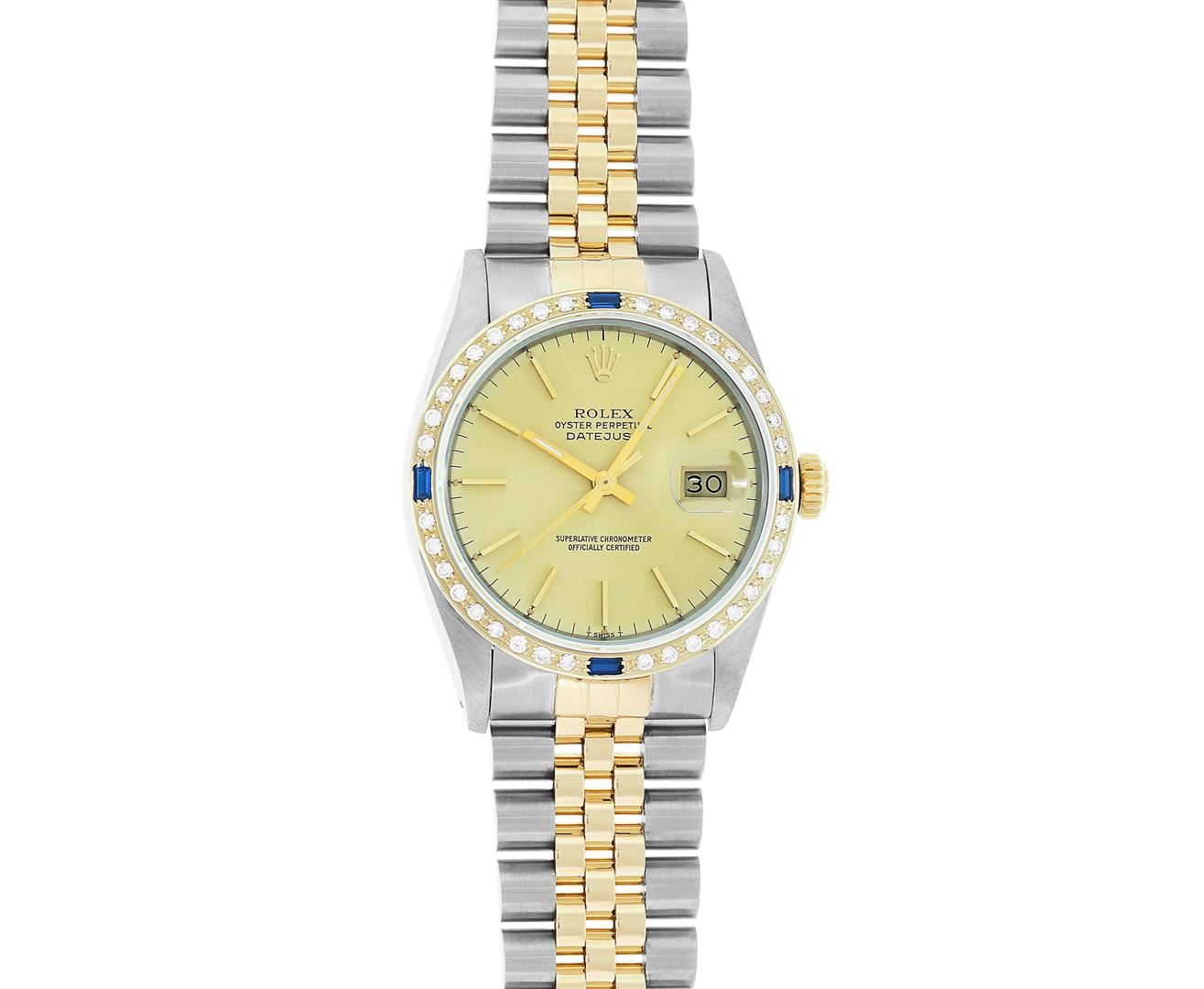One Mens Rolex Quickset Pre Owned Two Tone 14K Yellow Gold And Stainless Steel Datejust Polished, Serviced & Electronically Tested, Rolex Yellow Gold & Stainless Steel Case: 36mm, Rolex 14K Yellow Gold Crown, Custom Bezel: New 18K Yellow Diamond + Sapphire Beadset Bezel, Stone Count: 36 Diamonds + 4 Sapphires, Total Weight.75 Carat, Clarity: SI-VS, Color: G to H. Custom Crystal: New Sapphire With Magnified Date Window. Custom Hands: New Luminecent Hands. Rolex Movement: Automatic Winding Movement 3035. Rolex Dial: Champagne Dial With Index Hour Markers Dash Track And Lumi Dots. Date Window: 3 O'Clock Position Date Display, Quickset, Model: Datejust. Condition: G-6 Extra Fine. Rolex Bracelet: Two Tone 14K Yellow Gold & Stainless Steel Jubilee Band. Bright Polish. 7.0 Inch Length, Adjustable. Standard Clasp, With Rolex Logo. This Watch Has Been Serviced Time Tested And Is In Excellent Condition It Is Free Of All Scratches And Dents.