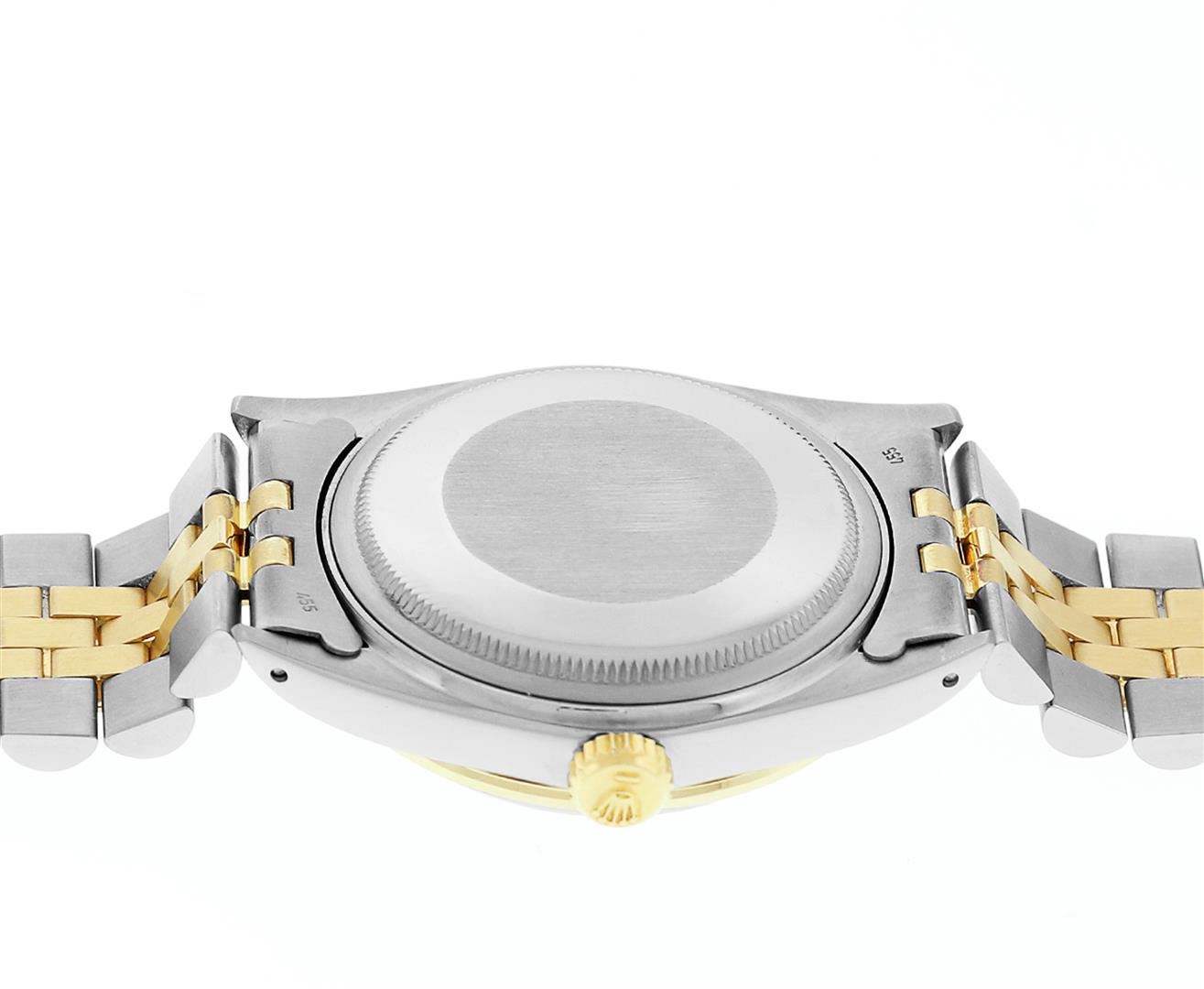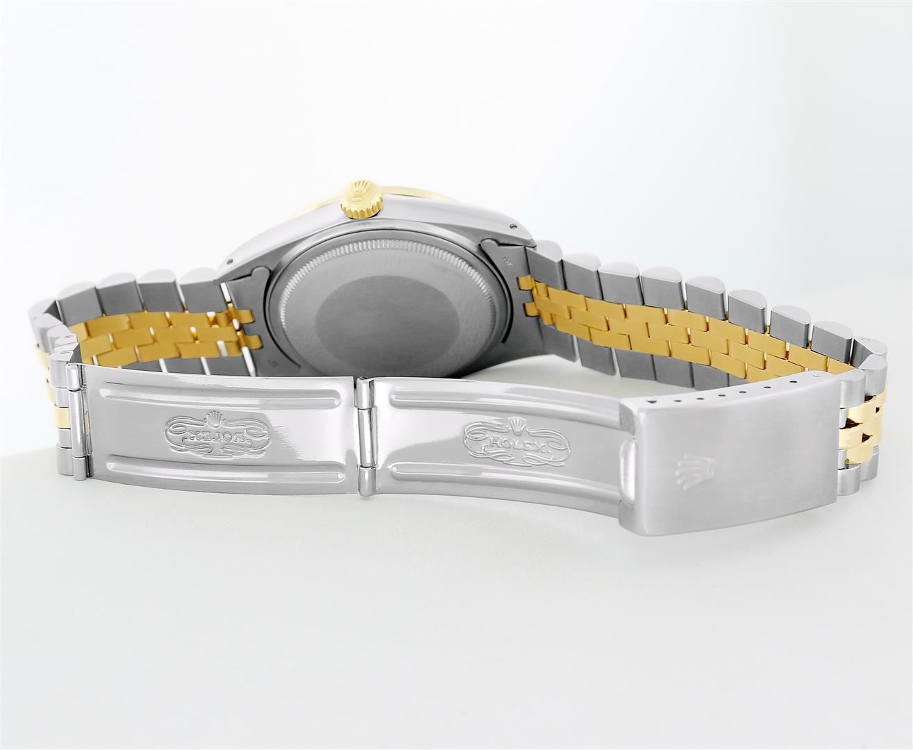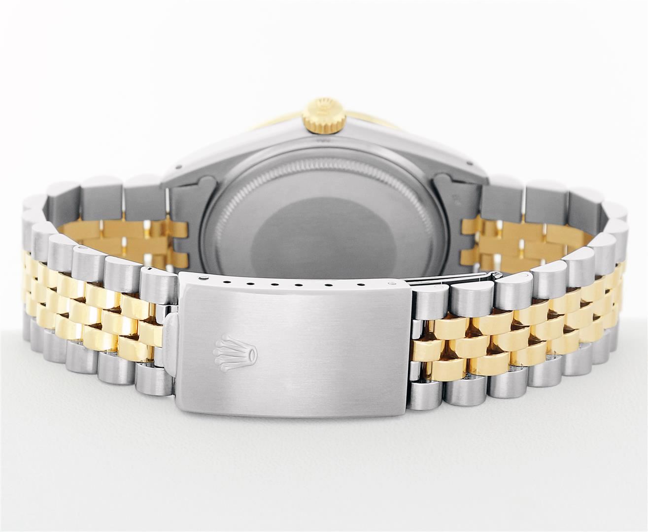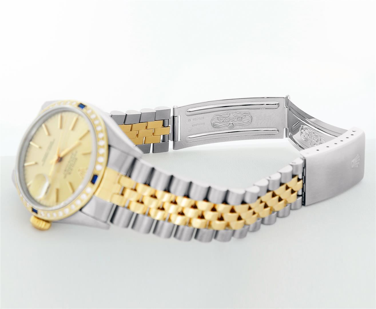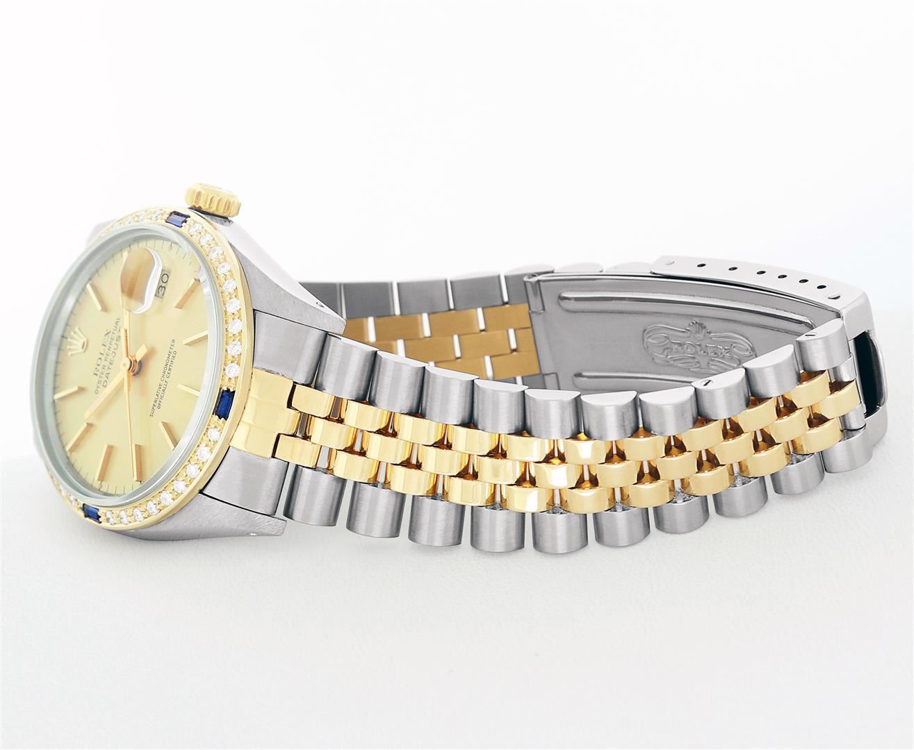 One Mens Rolex Quickset Pre Owned Two Tone 14K Yellow Gold And Stainless Steel Datejust Polished, Serviced & Electronically Tested, Rolex Yellow Gold & Stainless Steel Case: 36mm, Rolex 14K Yellow Gold Crown, Custom Bezel: New 18K Yellow Diamond + Sapphire Beadset Bezel, Stone Count: 36 Diamonds + 4 Sapphires, Total Weight.75 Carat, Clarity: SI-VS, Color: G to H. Custom Crystal: New Sapphire With Magnified Date Window. Custom Hands: New Luminecent Hands. Rolex Movement: Automatic Winding Movement 3035. Rolex Dial: Champagne Dial With Index Hour Markers Dash Track And Lumi Dots. Date Window: 3 O'Clock Position Date Display, Quickset, Model: Datejust. Condition: G-6 Extra Fine. Rolex Bracelet: Two Tone 14K Yellow Gold & Stainless Steel Jubilee Band. Bright Polish. 7.0 Inch Length, Adjustable. Standard Clasp, With Rolex Logo. This Watch Has Been Serviced Time Tested And Is In Excellent Condition It Is Free Of All Scratches And Dents.