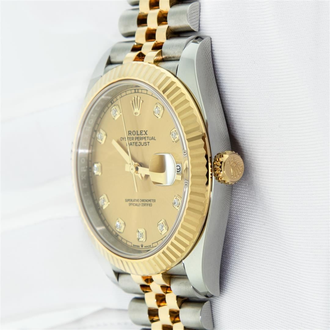 One Mens Pre Owned 18K Yellow Gold & Stainless Steel Rolex Datejust 41MM Polished, Serviced & Electronically Tested, Rolex Yellow Gold & Stainless Steel Case: 41mm, Rolex Yellow Gold Crown, Rolex Bezel: 18K Yellow Gold Fluted Bezel. Crystal: Sapphire With Magnified Date Window. Rolex Hands: Solid Hands. Rolex Movement: Automatic Winding Movement 3235. Rolex Dial: Factory Champagne Diamond Dial With Square Roman Track, Diamond Count: 10 Diamonds On Dial, Clarity: VVS. Date Window: 3 O'Clock Position Date Display, Quickset, Model: Datejust 41. Condition: G-6 Extra Fine. Rolex Bracelet: Two Tone 18K Yellow Gold & Stainless Steel Jubilee Band. Bright Polish. 7.0 Inch Length, Adjustable. Standard Clasp, With Rolex Logo. This Watch Has Been Serviced And Polished It Is Free Of All Scratches And Dents. This Watch Comes With Rolex Box & Card.