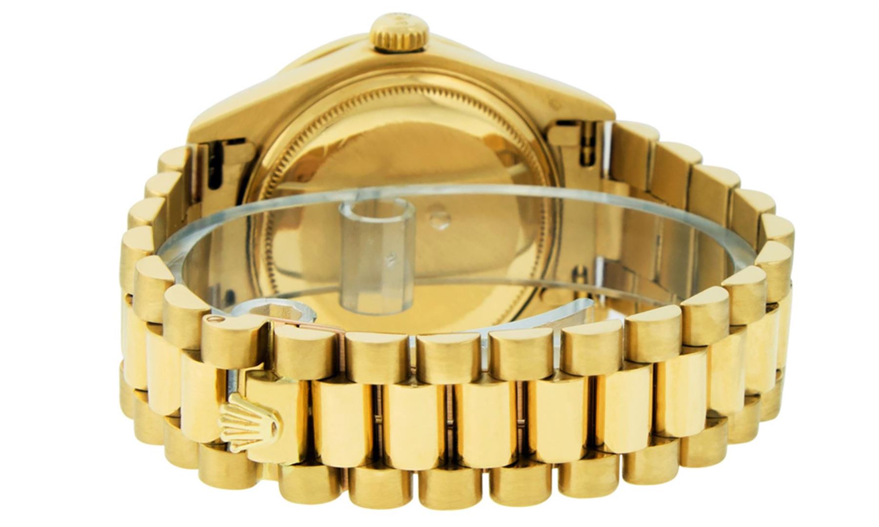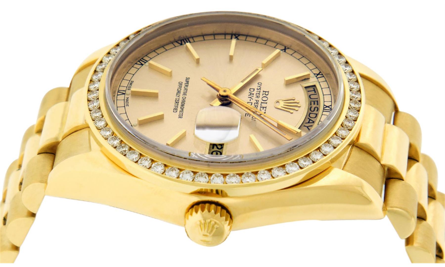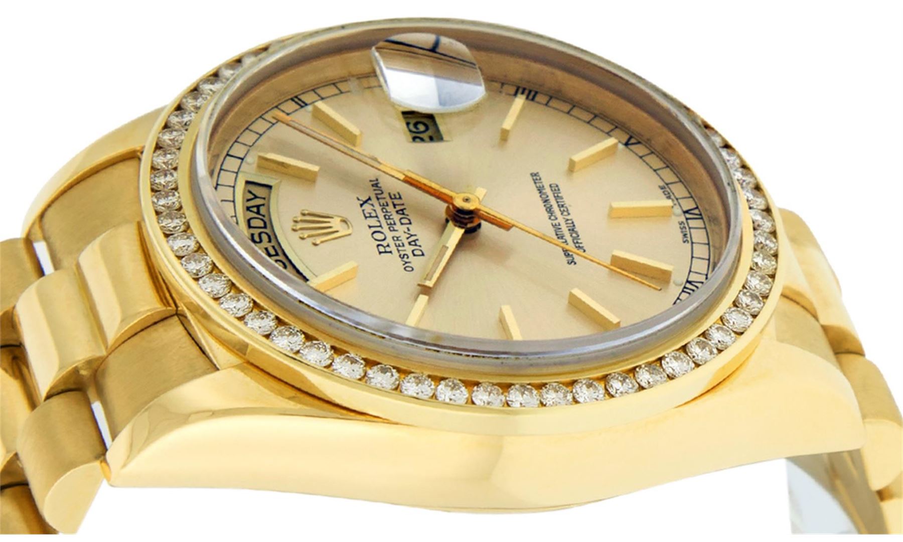 One Mens Rolex Day Date 18K Yellow Gold President Polished, Serviced & Electronically Tested, Rolex 18K Yellow Gold Case: 36mm, Rolex 18K Yellow Gold Crown, Custom Bezel: New 18K Yellow Gold Channel Set Diamond Bezel, Diamond Count: 54 Diamonds On Bezel. Total Bezel Weight 1.3 Carat, Clarity: SI-VS, Color: G to H. Custom Crystal: New Sapphire With Magnified Date Window. Hands: Luminescent Hands. Rolex Movement: Automatic Winding Movement Caliber 3055. Rolex Dial: Champagne Index With Square Roman Track And Lumi Dot. Date Window: 3 O'Clock Position Date Display, Day Window: 12 O'Clock Position Date Display. Quickset, Model: Day Date Quickset President. Condition: G-6 Extra Fine. Rolex Bracelet: 18K Yellow Gold President Band. Bright Polish. 7.0 Inch Length, Standard Hidden President Clasp, With Rolex Logo. This Pre Owned Watch Has Been Serviced Time Tested And Is In Excellent Condition It Is Free Of All Scratches And Dents.