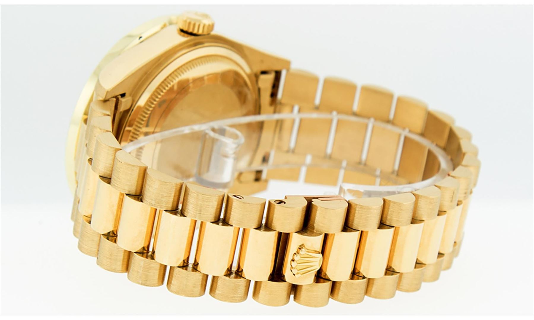 One Mens Rolex Day Date 18K Yellow Gold President Polished, Serviced & Electronically Tested, Rolex 18K Yellow Gold Case: 36mm, Rolex 18K Yellow Gold Crown, Custom Bezel: New 18K Yellow Gold Channel Bezel Set With Genuine Diamonds, Diamond Count: 40 Diamonds On Bezel Bezel. Total Bezel Weight 3.0 Carat, Clarity: SI-VS, Color: G to H. Custom Crystal: New Sapphire With Magnified Date Window. Hands: Luminescent Hands. Rolex Movement: Automatic Winding Movement Caliber 3055. Rolex Dial: Champagne Index With Square Roman Track And Lumi Dots. Date Window: 3 O'Clock Position Date Display, Day Window: 12 O'Clock Position Date Display. Quickset, Model: Day Date Quickset President. Condition: G-6 Extra. Rolex Bracelet: 18K Yellow Gold President. Bright Polish. 7.0 Inch Length, Standard Hidden President Clasp President Band, With Rolex Logo. This Pre Owned Watch Has Been Serviced Time Tested And Is In Excellent Condition It Is Free Of All Scratches And Dents.