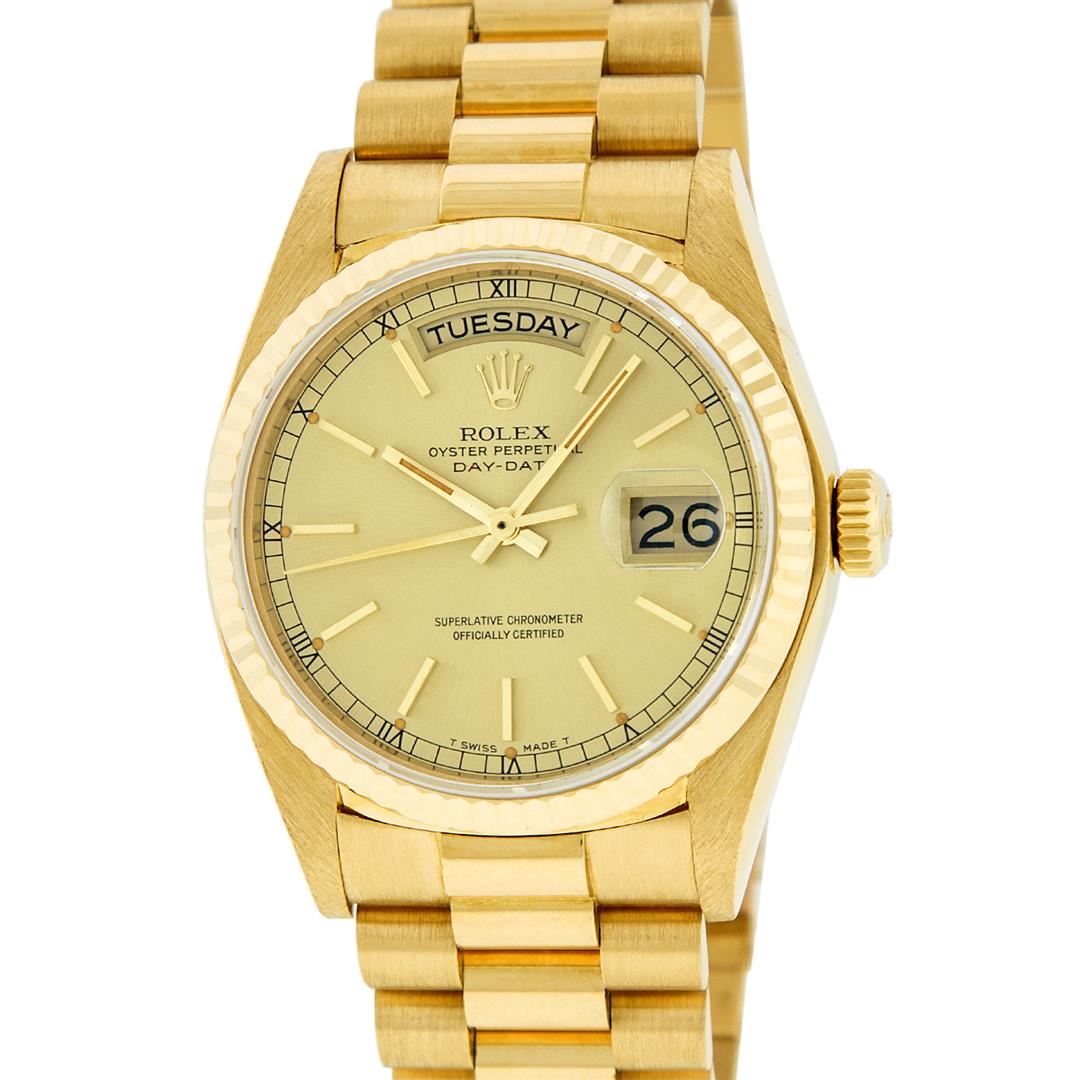 One Mens Quickset Rolex Day Date 18K Yellow Gold President Polished, Serviced & Electronically Tested, Rolex 18K Yellow Gold Case: 36mm, Rolex 18K Yellow Gold Crown, Rolex Bezel: 18K Yellow Gold Fluted Bezel. Crystal: Sapphire With Magnified Date Window. Hands: Luminescent Hands. Rolex Movement: Automatic Quickset Winding Movement Caliber 3055. Rolex Dial: Champagne Index With Roman Track & Lumi Dots. Date Window: 3 O'Clock Position, Day Display: 12 O'Clock Position, Single Quickset, Model: Day Date Quickset President. Condition: G-6 Extra Fine. Rolex Bracelet: 18K Yellow Gold President Band With Hidden Clasp, Bright & Satin Polish. 7.0 Inch Length, Standard Hidden President Clasp, With Rolex Logo. This Pre Owned Watch Has Been Serviced Time Tested And Is In Excellent Condition It Is Free Of All Scratches And Dents.