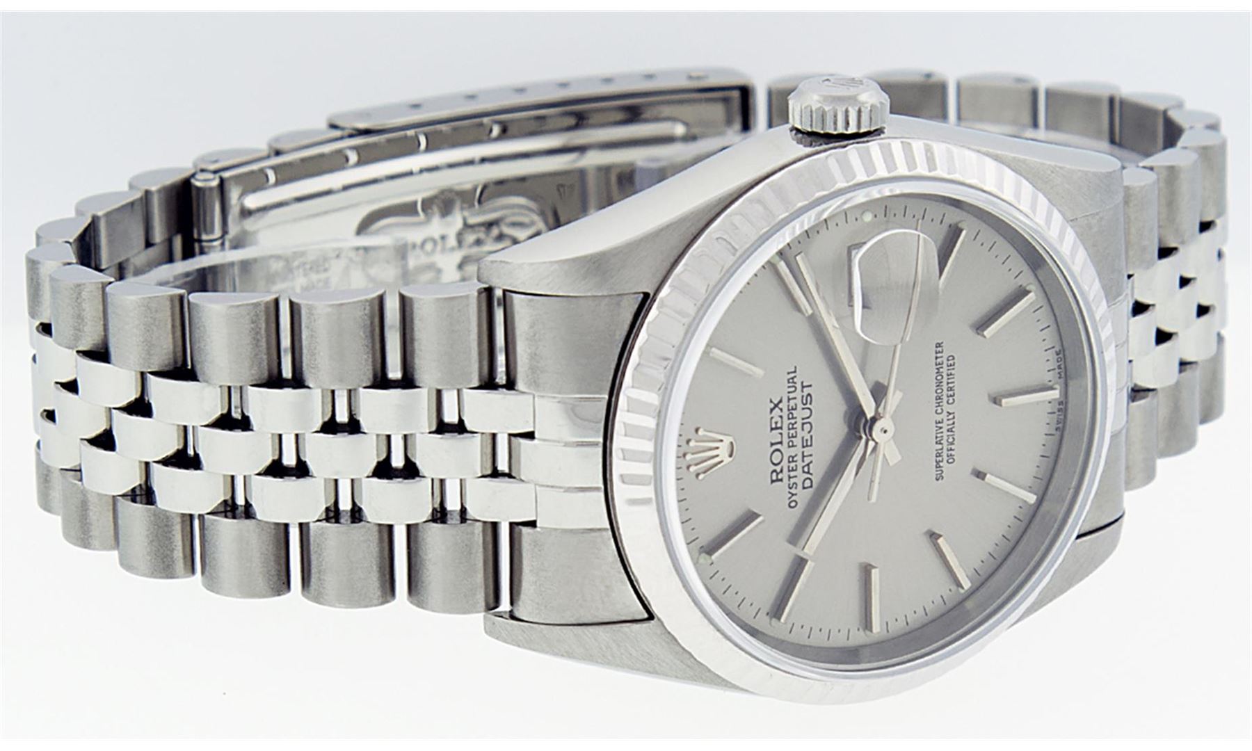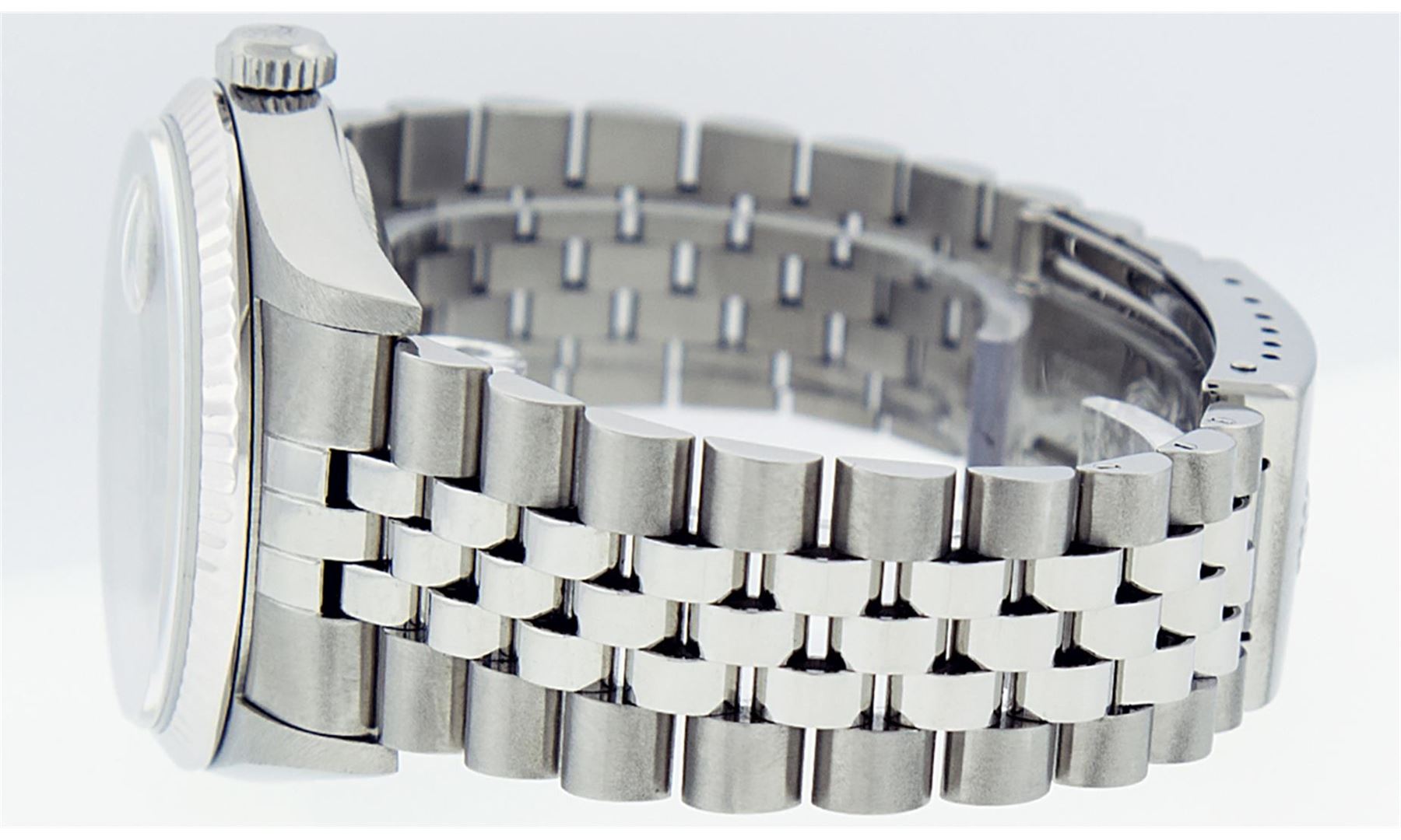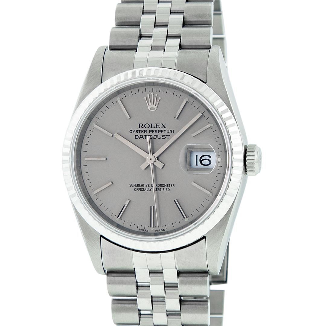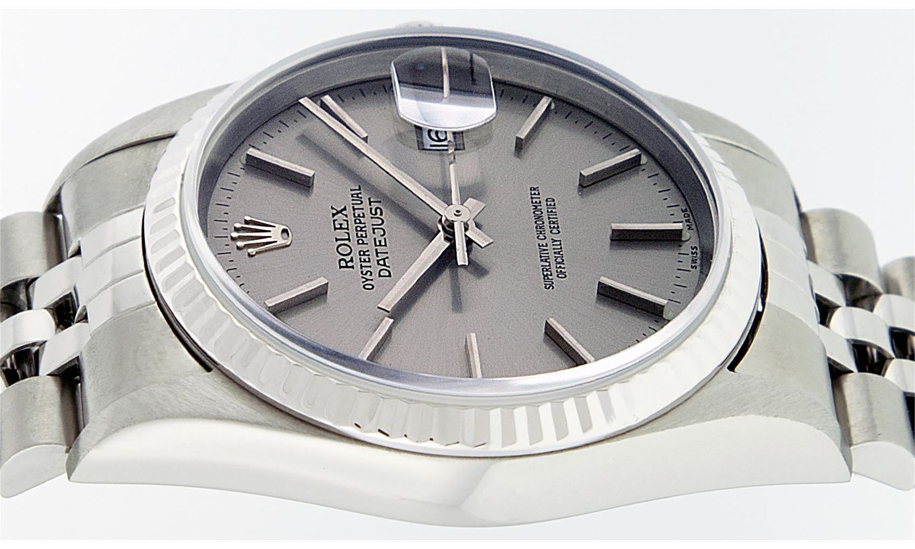 One Mens Rolex Quickset Stainless Steel Datejust Polished Bright with Satin Finish, Serviced & Electronically Tested, Rolex Stainless Steel Case: 36mm, Rolex Stainless Steel Crown, Rolex Bezel: 14K White Gold Fluted Bezel. Crystal: Sapphire With Magnified Date Window. Hands: Solid Hands. Rolex Movement: Automatic Winding Movement Caliber 3135. Custom Dial: Refinished To Gray With Index Hour Markers Dash Track And Lumi Dots. Date Window: 3 O'Clock Position Date Display, Quickset, Model: Quickset Datejust. Condition: G-6 Extra Fine. Rolex Bracelet: Stainless Steel Jubilee Band. Bright Polish & Satin Finish. 7.0 Inch Length, Adjustable. Standard Clasp, With Rolex Logo. This Pre Owned Watch Has Been Serviced Time Tested And Is In Excellent Condition It Is Free Of All Scratches And Dents.