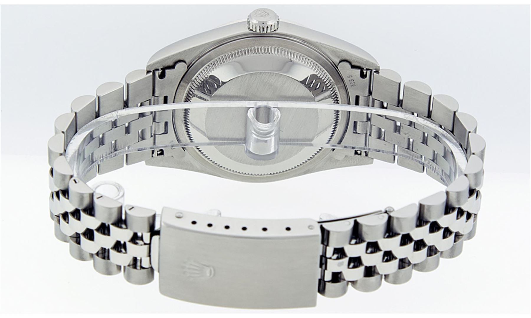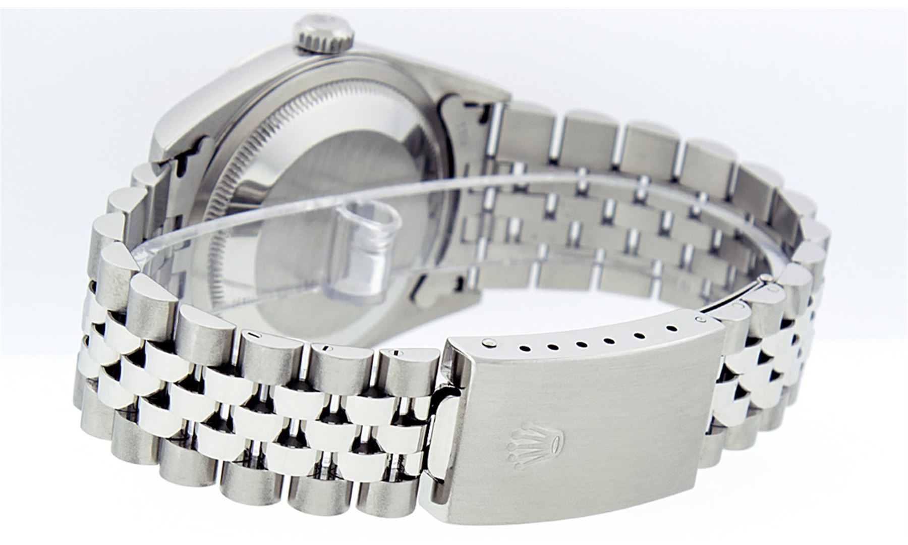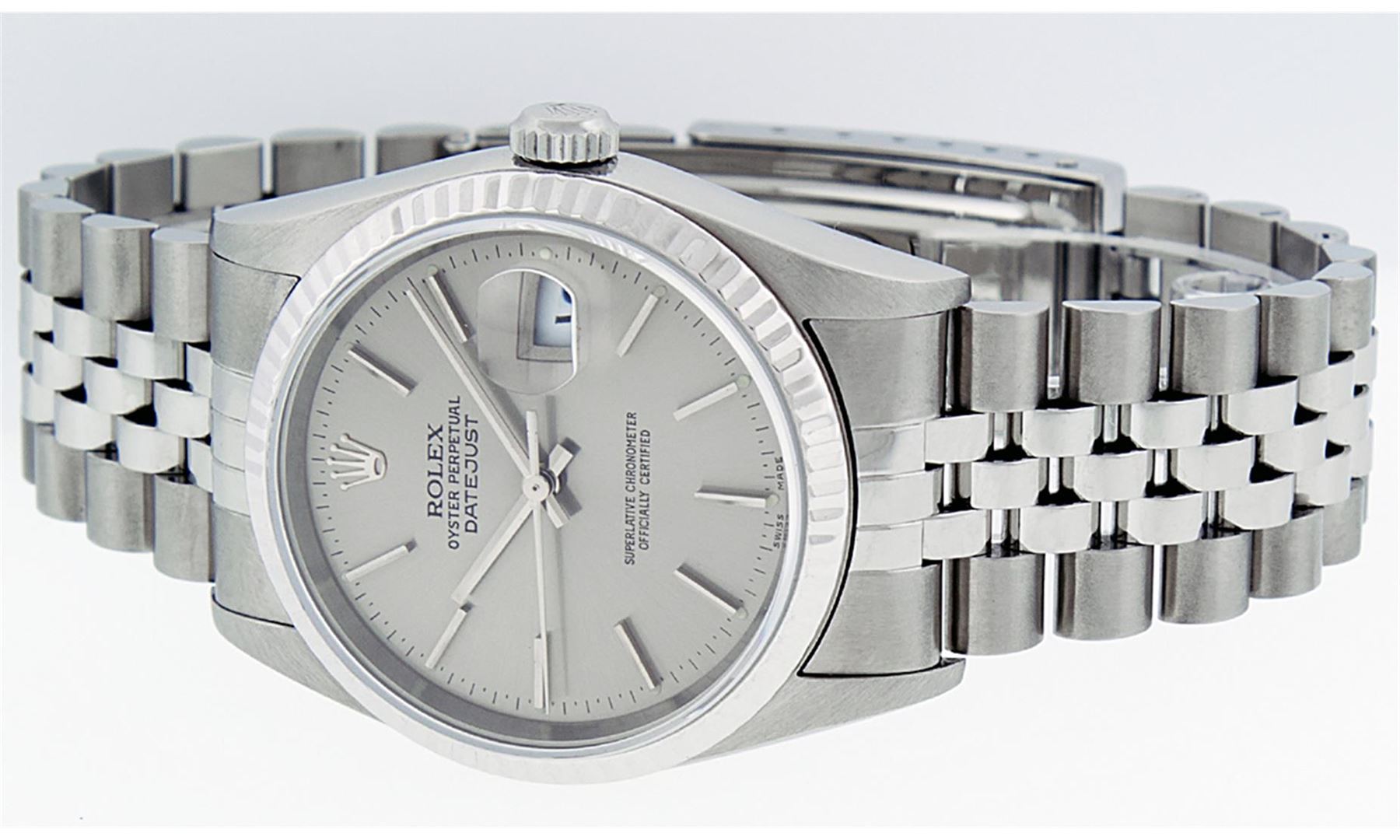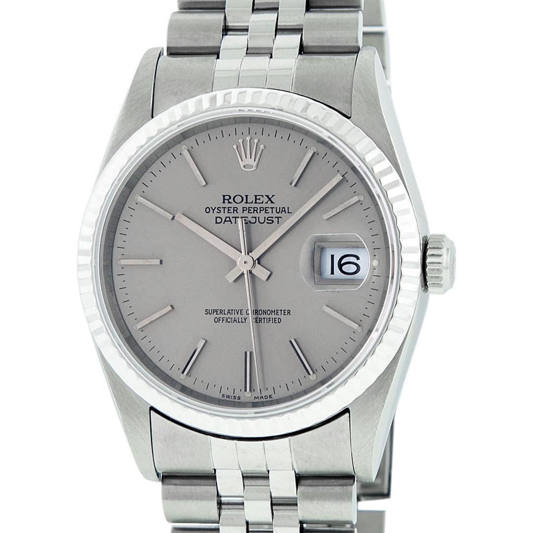 One Mens Rolex Quickset Stainless Steel Datejust Polished Bright with Satin Finish, Serviced & Electronically Tested, Rolex Stainless Steel Case: 36mm, Rolex Stainless Steel Crown, Rolex Bezel: 14K White Gold Fluted Bezel. Crystal: Sapphire With Magnified Date Window. Hands: Solid Hands. Rolex Movement: Automatic Winding Movement Caliber 3135. Custom Dial: Refinished To Gray With Index Hour Markers Dash Track And Lumi Dots. Date Window: 3 O'Clock Position Date Display, Quickset, Model: Quickset Datejust. Condition: G-6 Extra Fine. Rolex Bracelet: Stainless Steel Jubilee Band. Bright Polish & Satin Finish. 7.0 Inch Length, Adjustable. Standard Clasp, With Rolex Logo. This Pre Owned Watch Has Been Serviced Time Tested And Is In Excellent Condition It Is Free Of All Scratches And Dents.